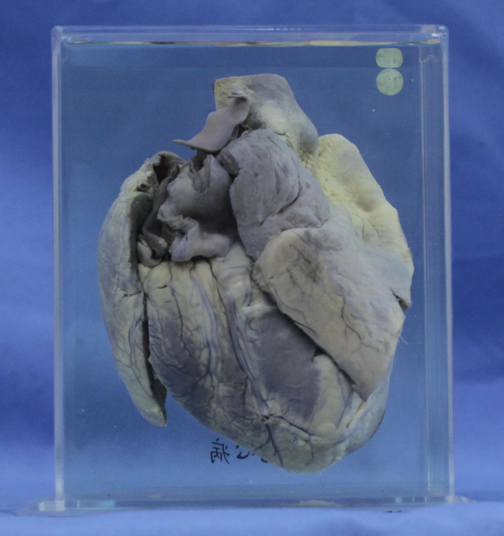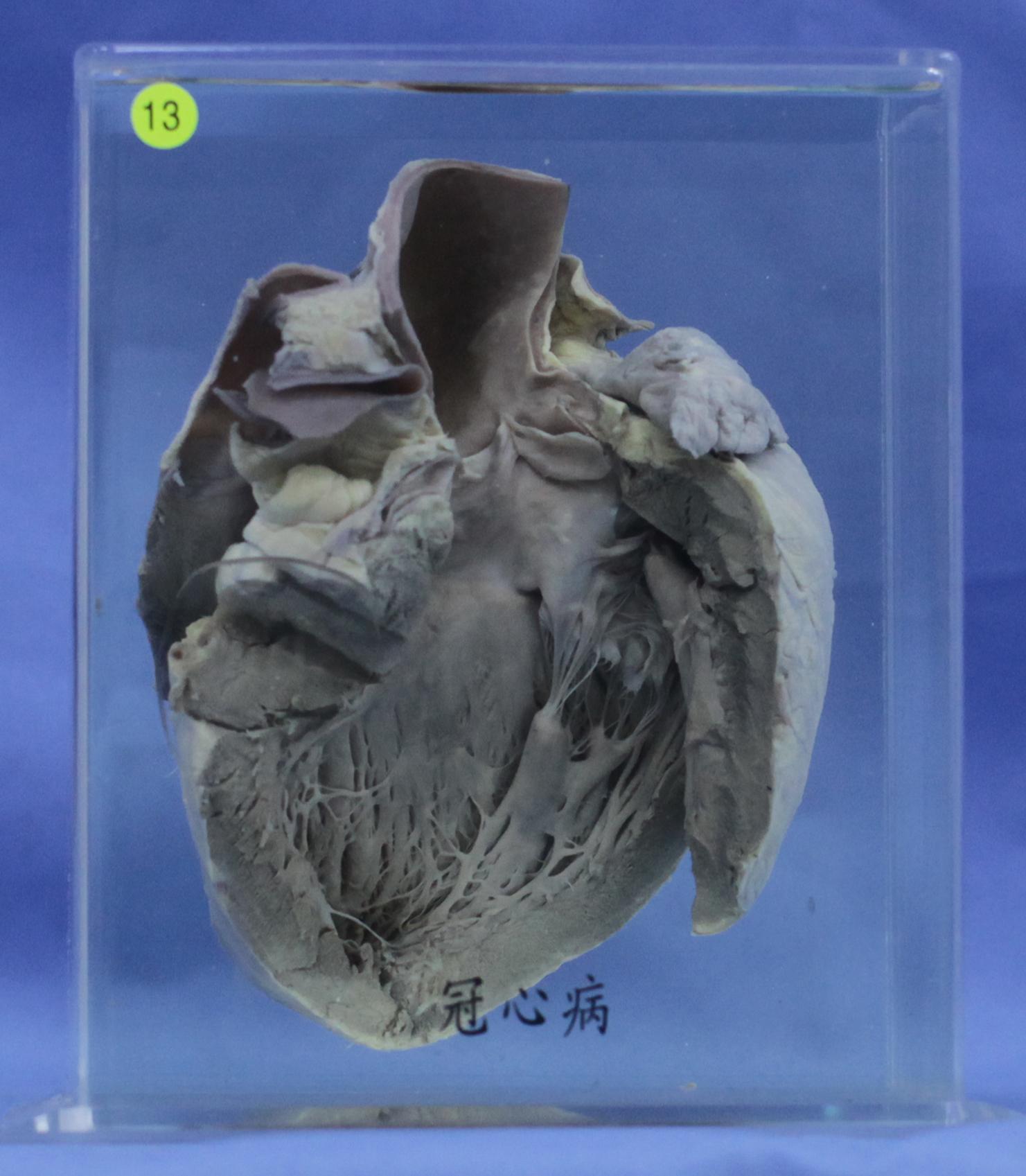 左心打开,心室心肌增厚,心尖部位心肌中可找到灰白色纤维化灶, 为陈旧性心肌梗死灶,局部心室肌变薄。左室心腔扩大。