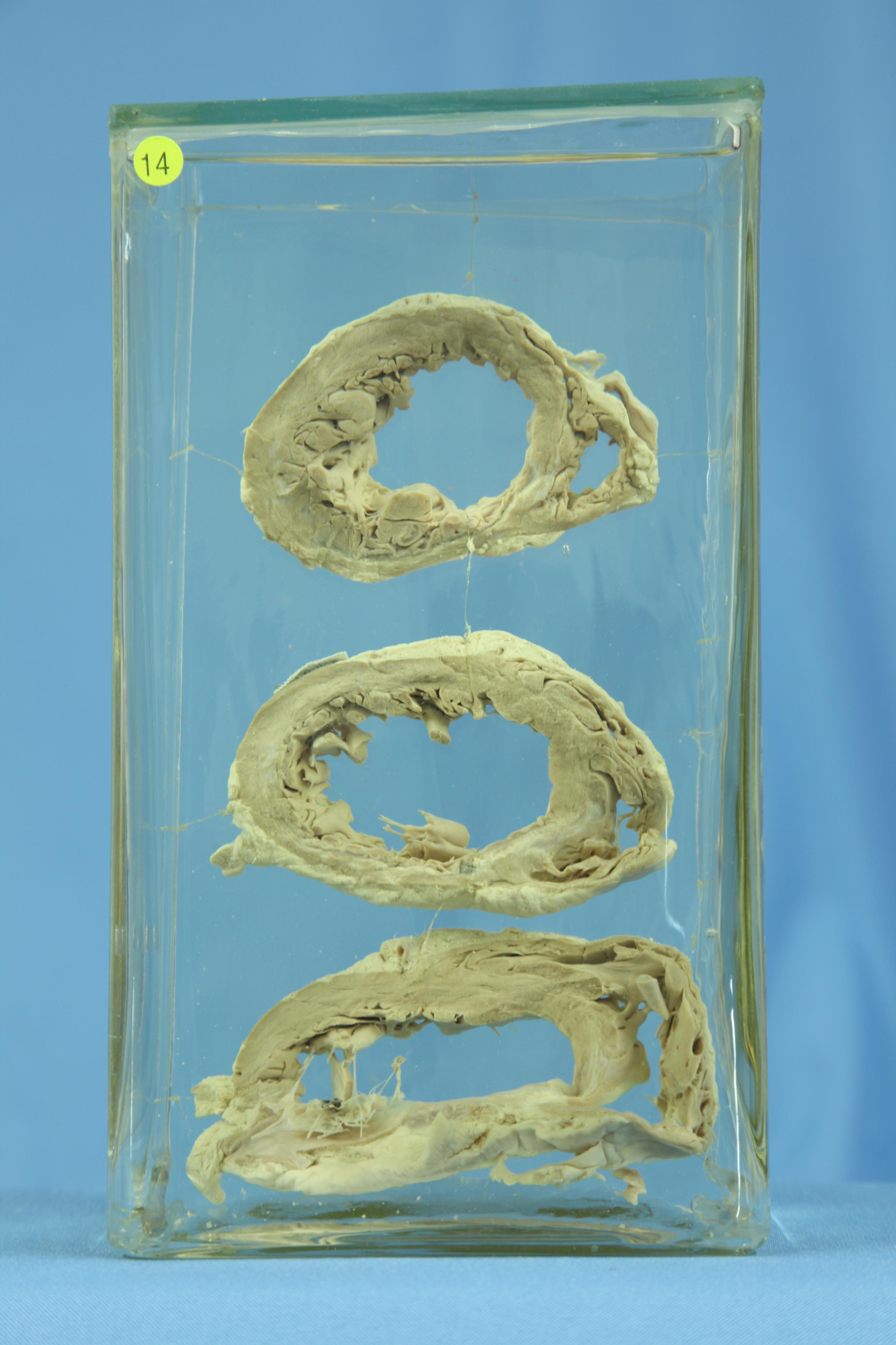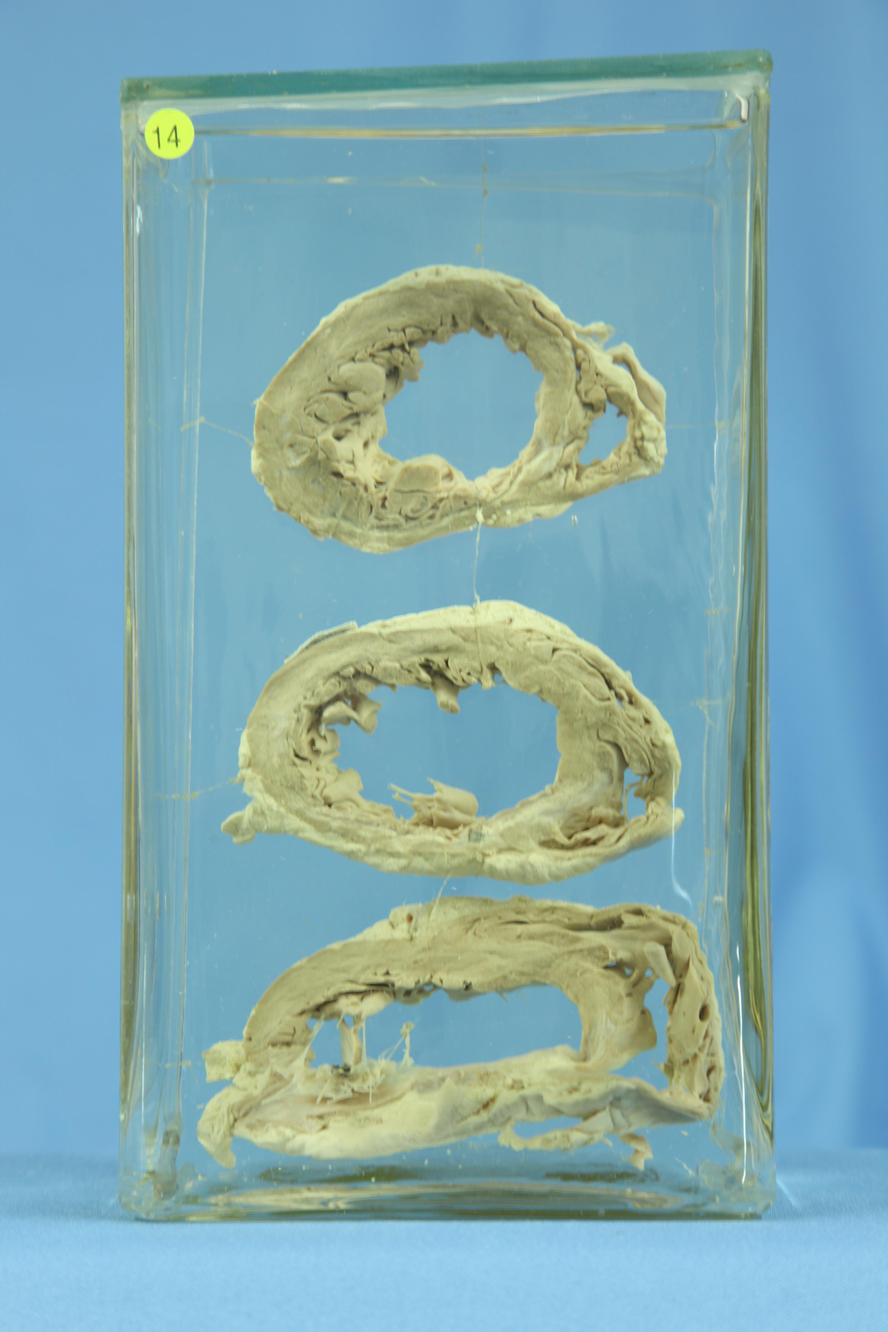 患者男性,76岁, 长期冠心病病史. 标本为三片心脏水平切片。横断面显示左心室心肌变薄,注意左心室心肌中可找到灰白色细条纹状纤维化,为陈旧性心肌梗死灶,心腔扩张。
