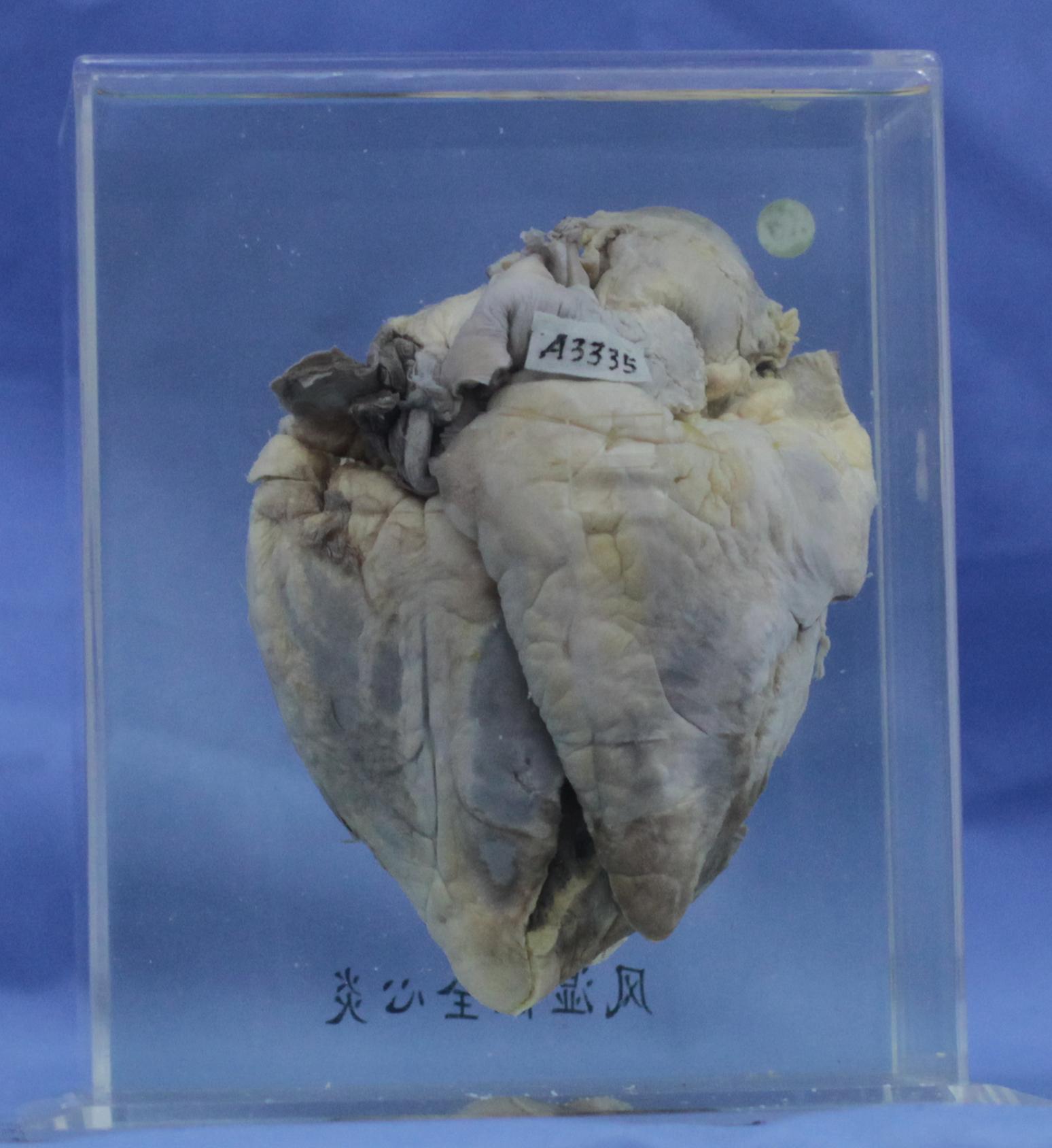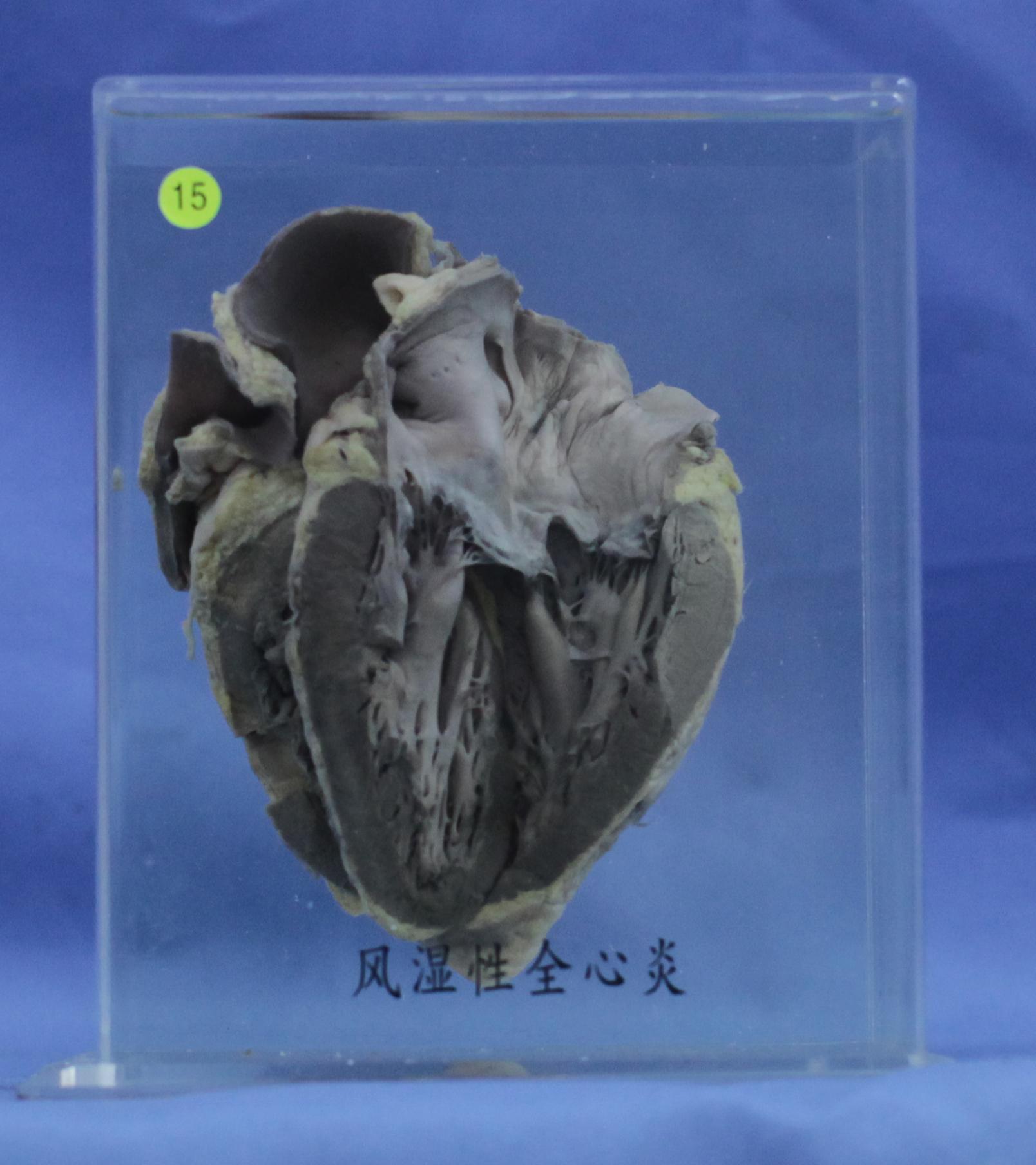 患者女性, 有风湿性心脏病病史. 左心室打开,心肌壁不增厚, 见主动脉瓣增厚, 瓣叶粘连及卷曲。右侧面左心房已打开, 见二尖瓣瓣膜显著增厚。粘连, 瓣口狭窄。左心房显著扩张。