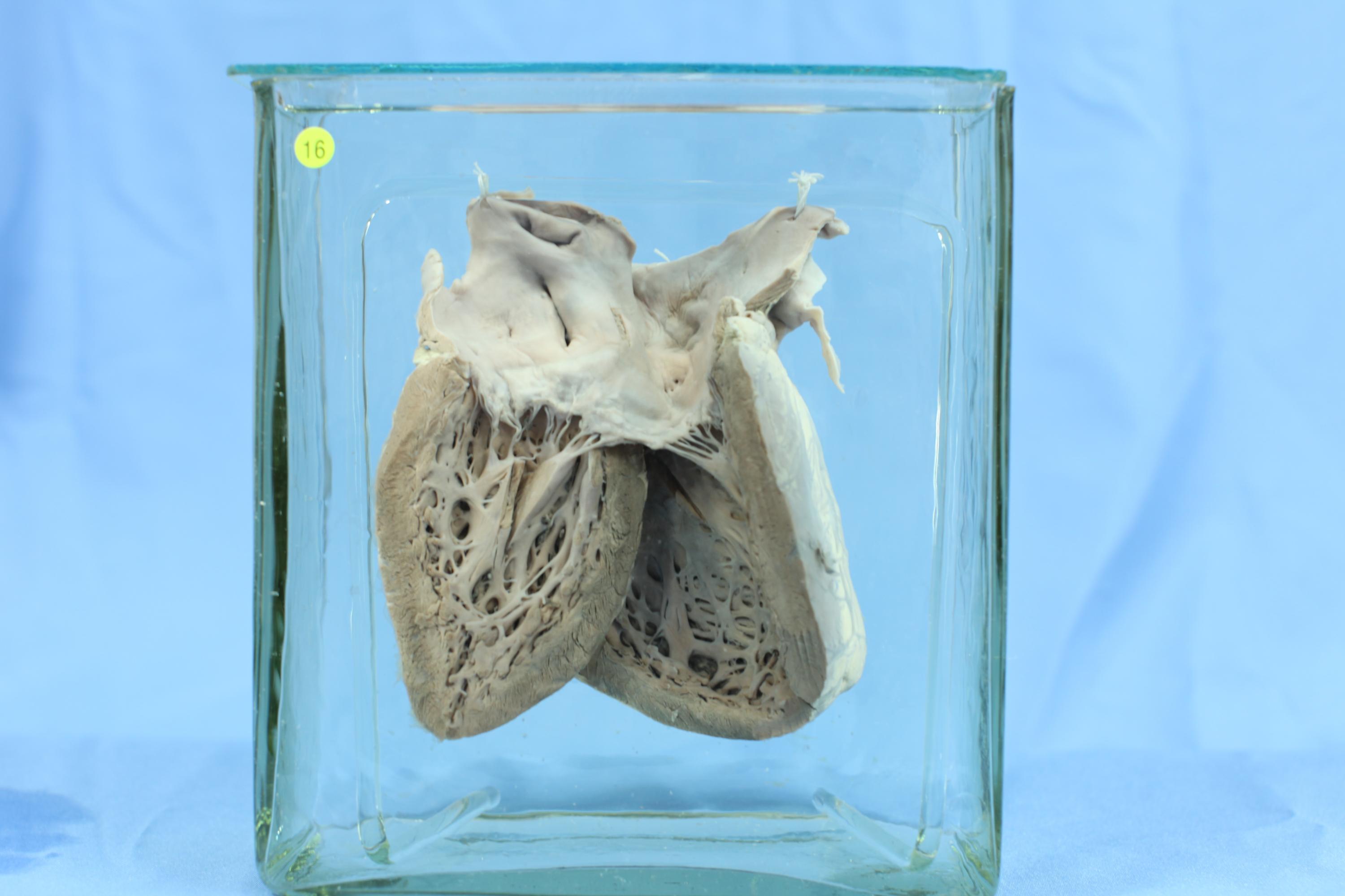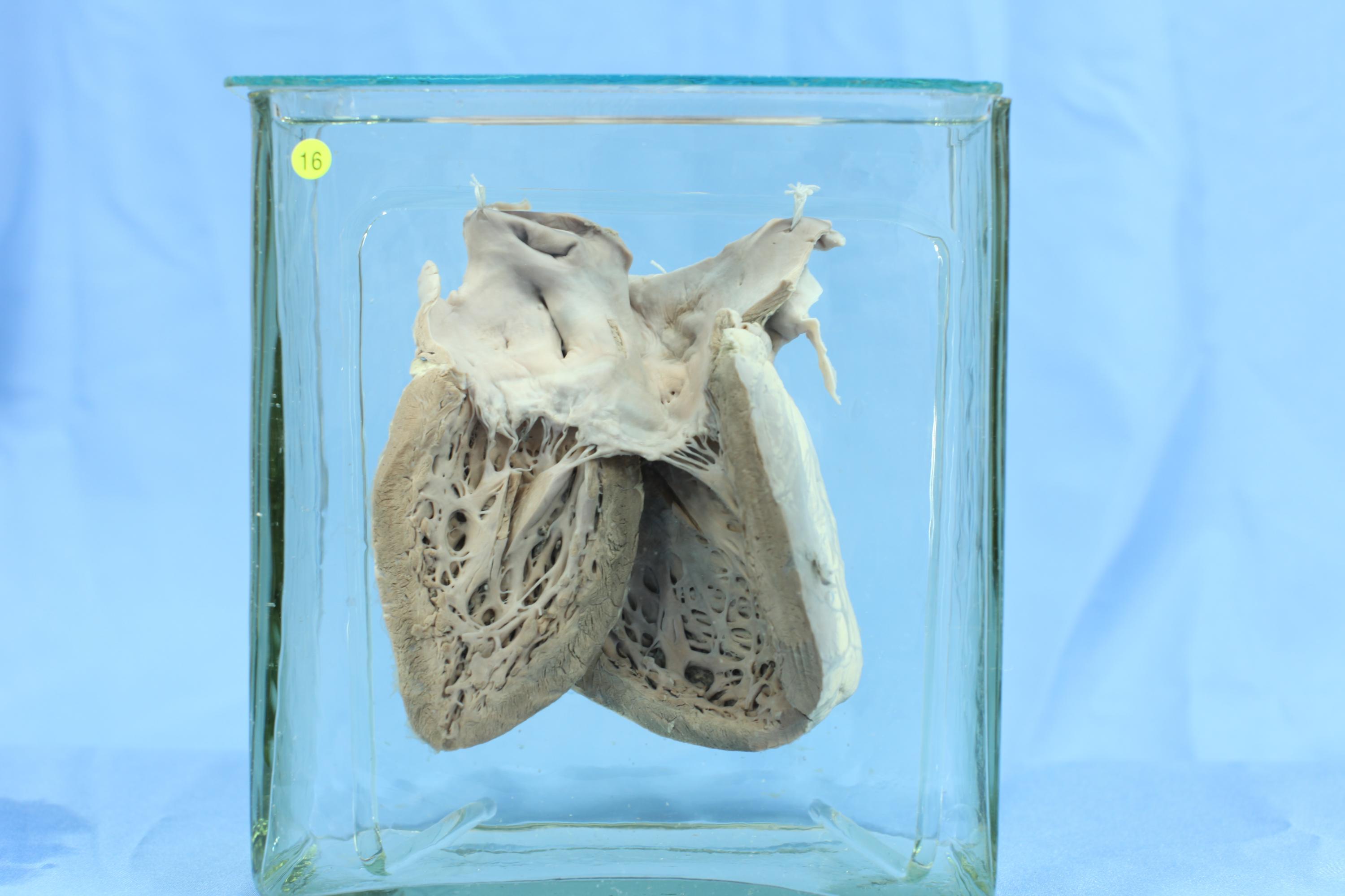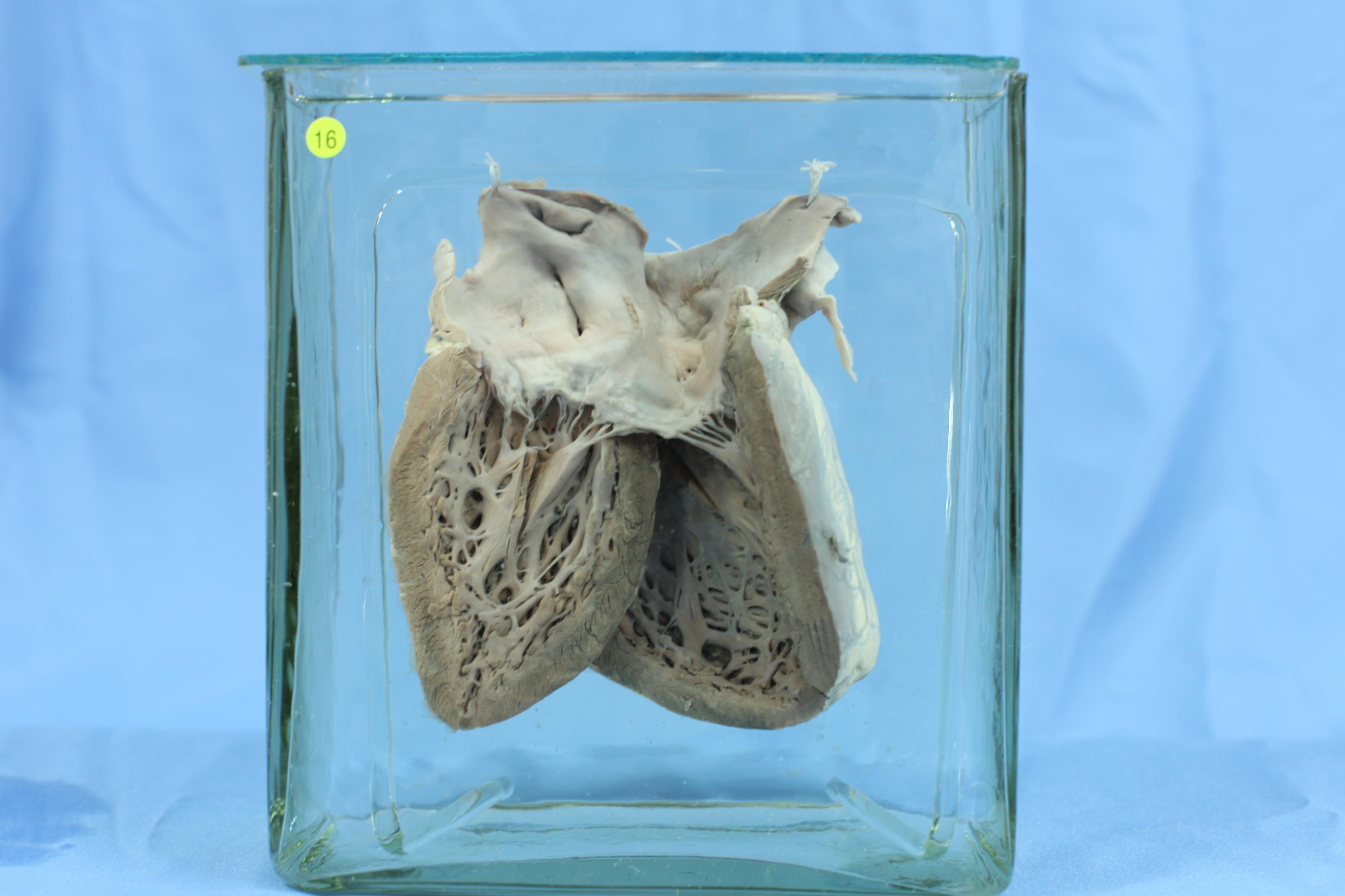 患者女性, 15岁, 风心病. 心脏标本左心腔打开,见二尖瓣心房面闭锁缘上有几个成排排列颗粒状赘生物,瓣膜仍薄。腱索轻度增粗,心室腔略扩张,心尖钝圆.