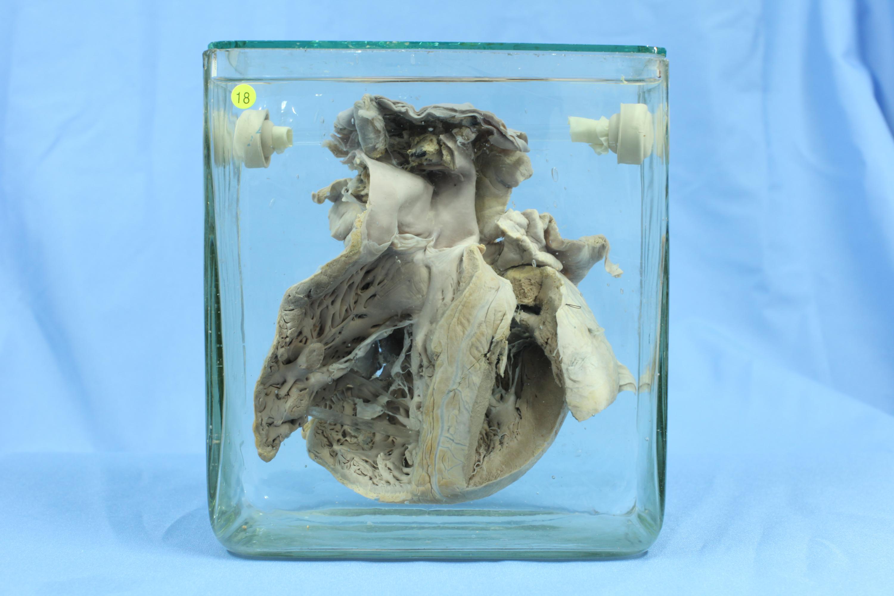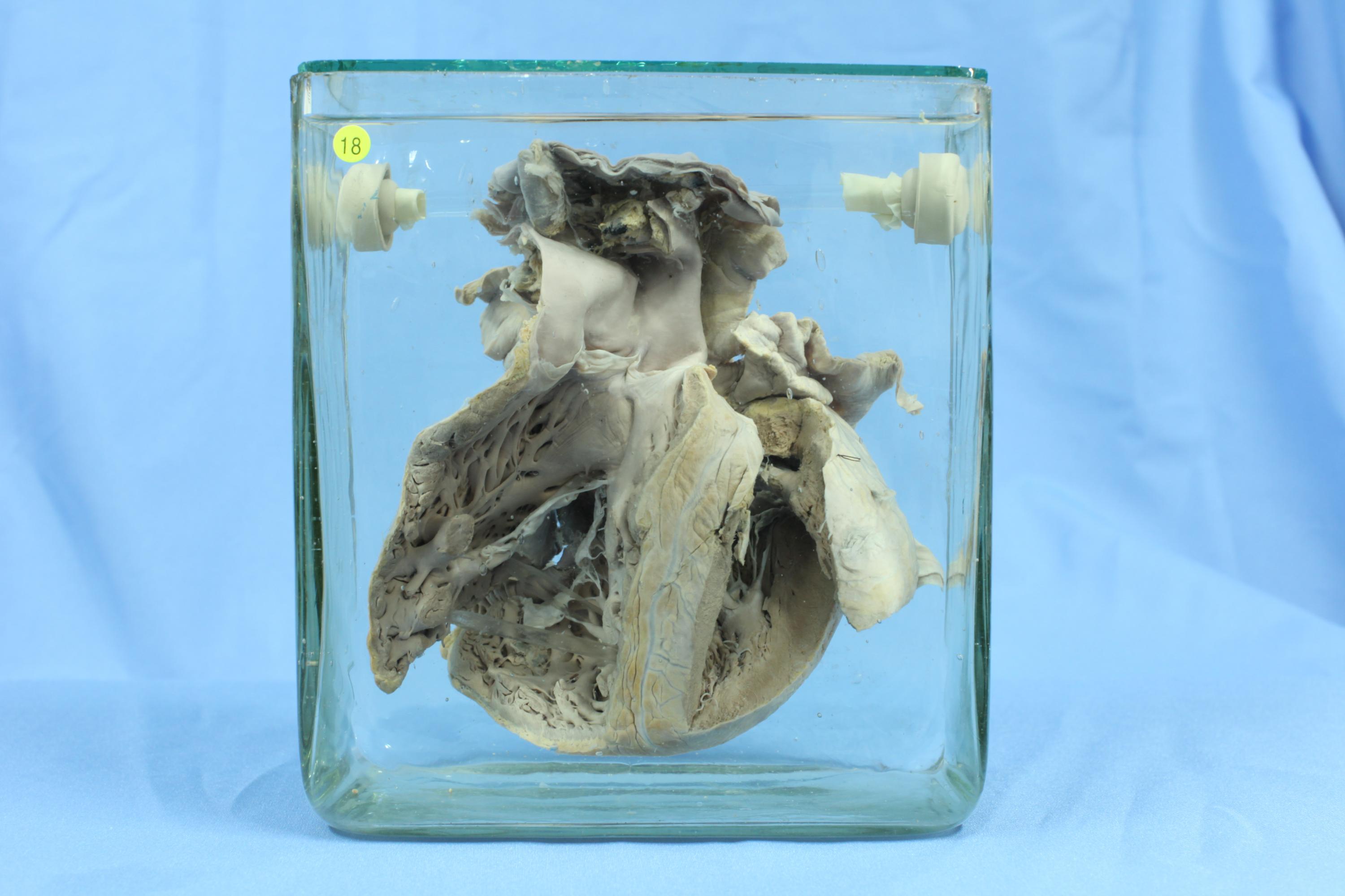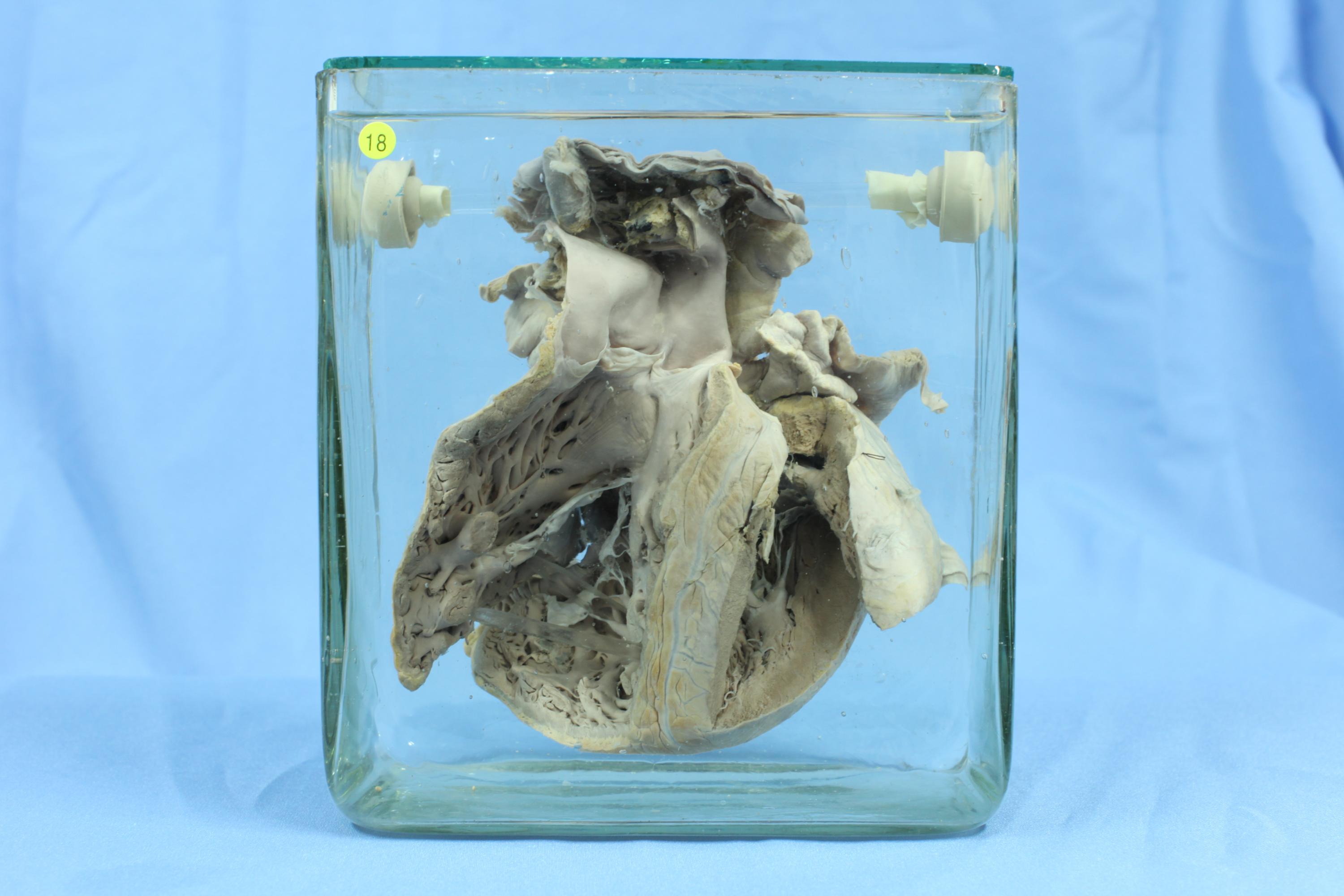 患者女性,45岁,慢性风湿性心脏病病史。 标本左右心均已打开,左心房见二尖瓣瓣膜显著性纤维增厚,无光泽,质较硬,无弹性。瓣叶联合处相互粘连,腱索增粗,即为二尖瓣狭窄。从标本反面观察,见右心室也扩张,肺动脉瓣有轻度增厚卷曲。