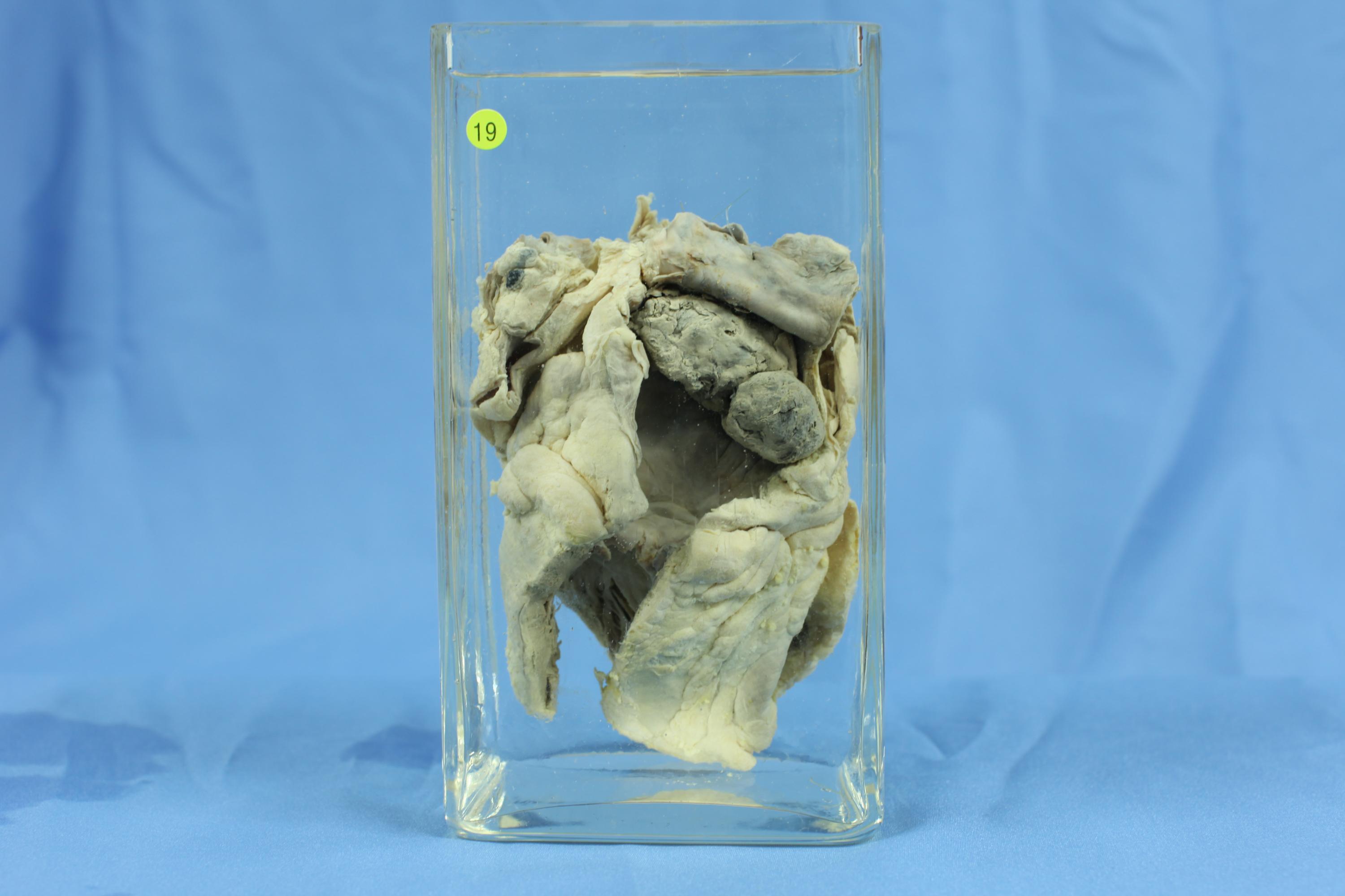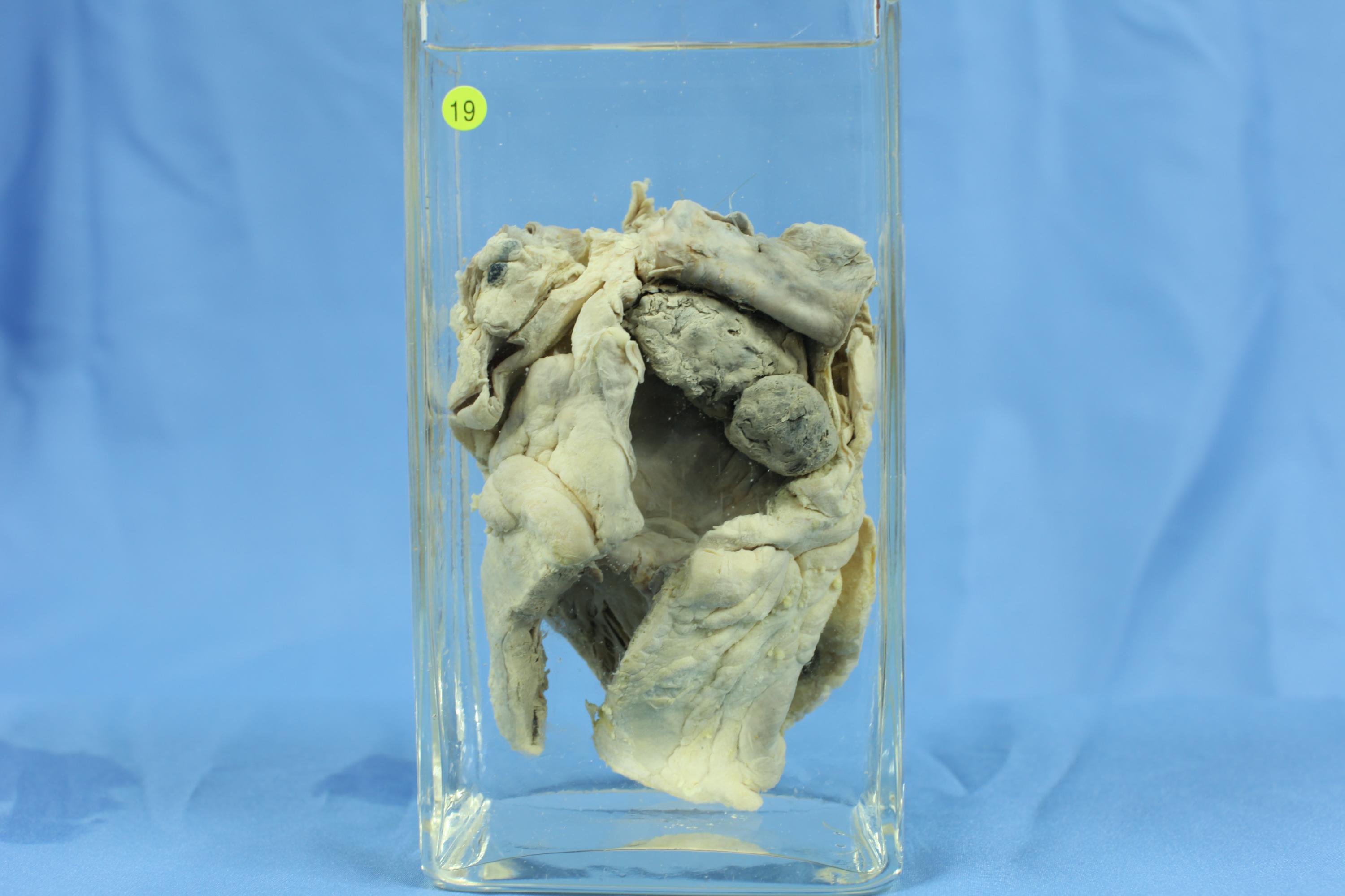 患者女性, 56岁. 慢性风心史, 心力衰竭. 标本左心腔打开,见二尖瓣瓣膜显著性纤维增厚,无光泽,质较硬,无弹性。瓣叶联合处相互粘连,腱索增粗,微短,互相融合。即为二尖瓣狭窄。左心房明显扩张,左心房上部见一不规则块状深褐色附壁血栓。左心室相对缩小,无扩张。