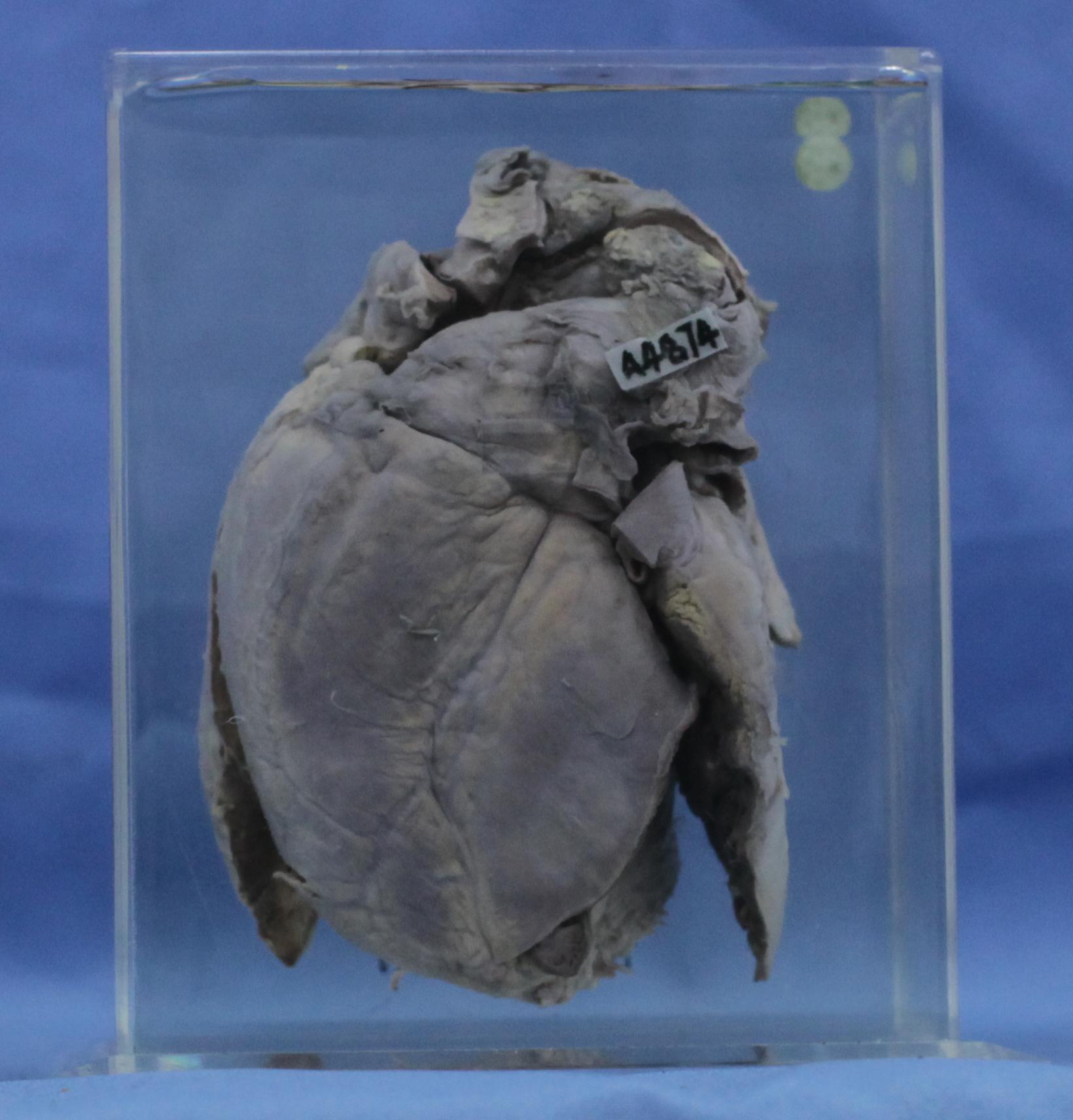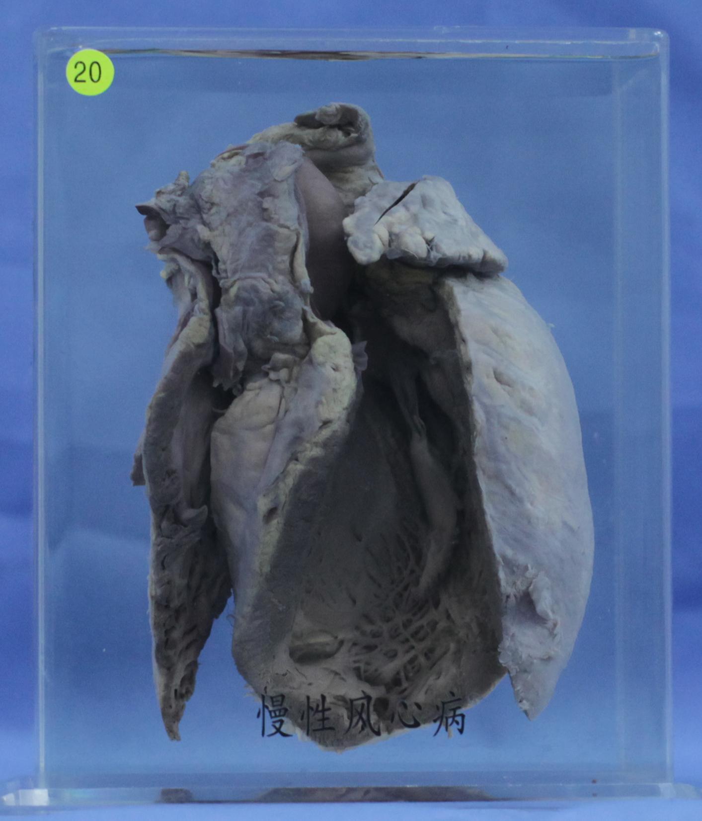 心脏体积增大. 左心腔已打开,可见主动脉瓣增厚,卷曲,形成主动脉瓣关闭不全,左心室扩大。心室心肌轻度增厚。