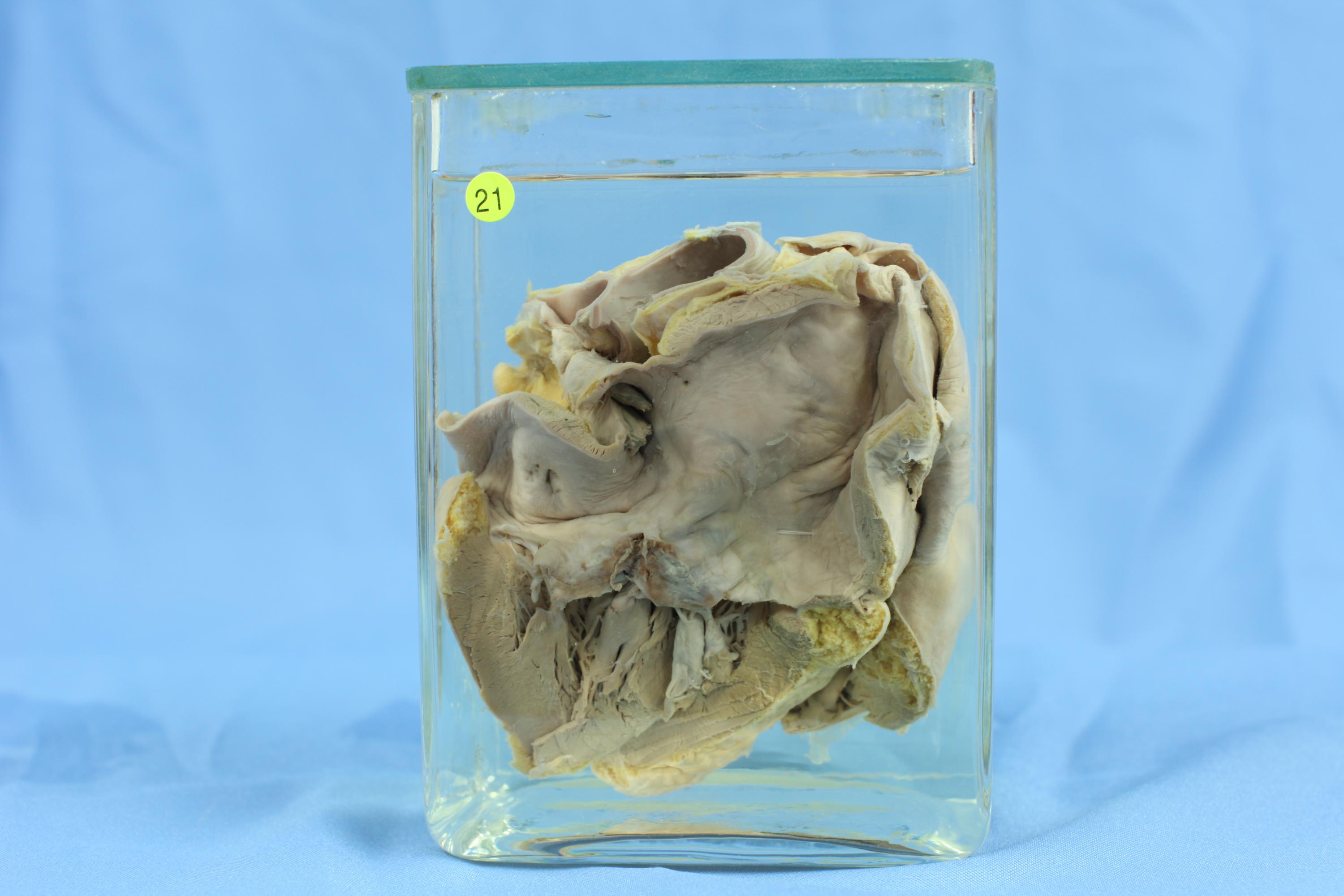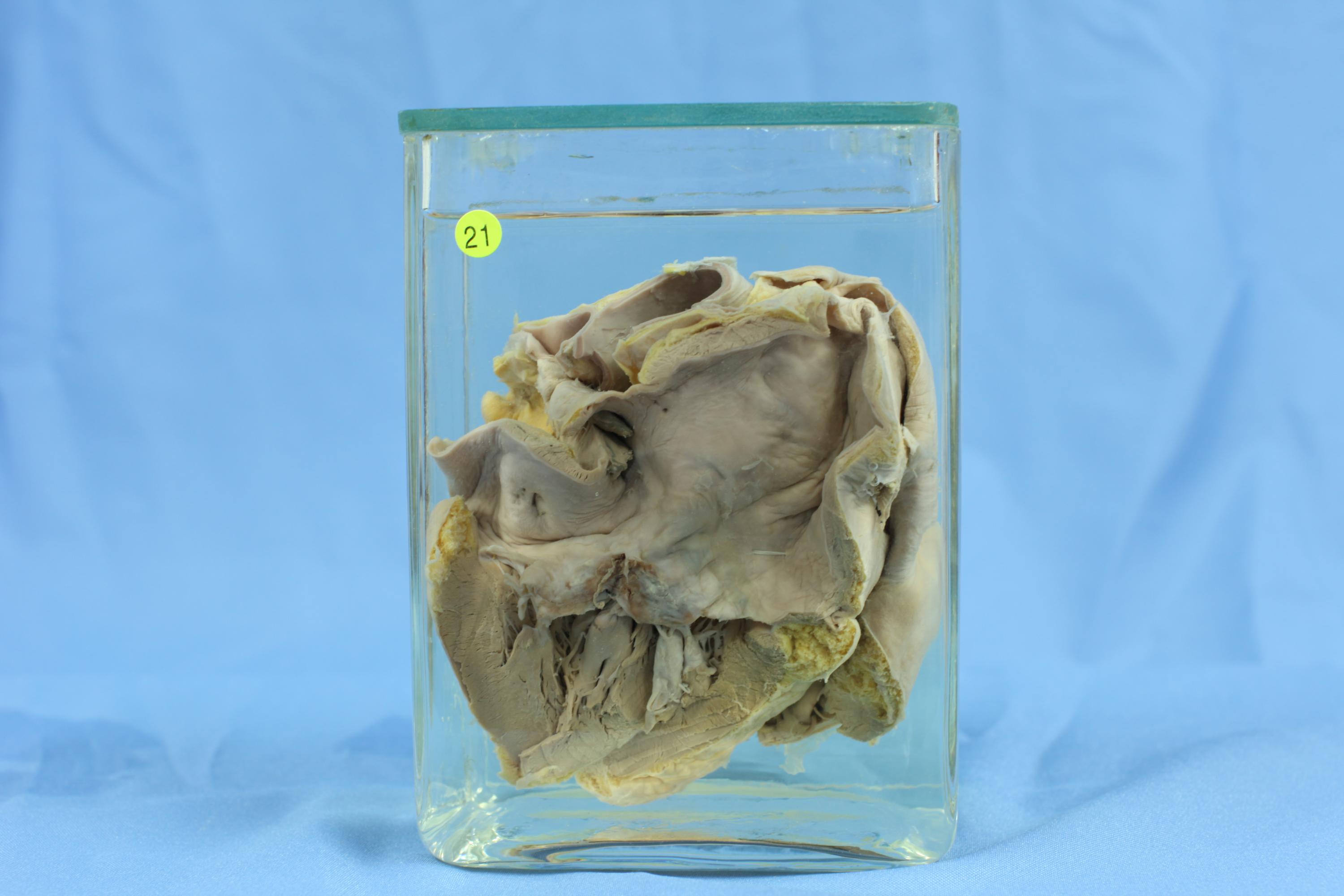 患者女性, 55岁. 慢性风湿性心脏病病史. 标本左心腔打开,见二尖瓣瓣膜显著性纤维增厚,无光泽,质较硬,无弹性。瓣叶联合处相互粘连,二尖瓣口径变小,腱索增粗,缩短,互相融合。即为二尖瓣狭窄。左心房明显扩张, 左心房内膜纤维性增厚而变粗糙。左心室相对缩小,无扩张。