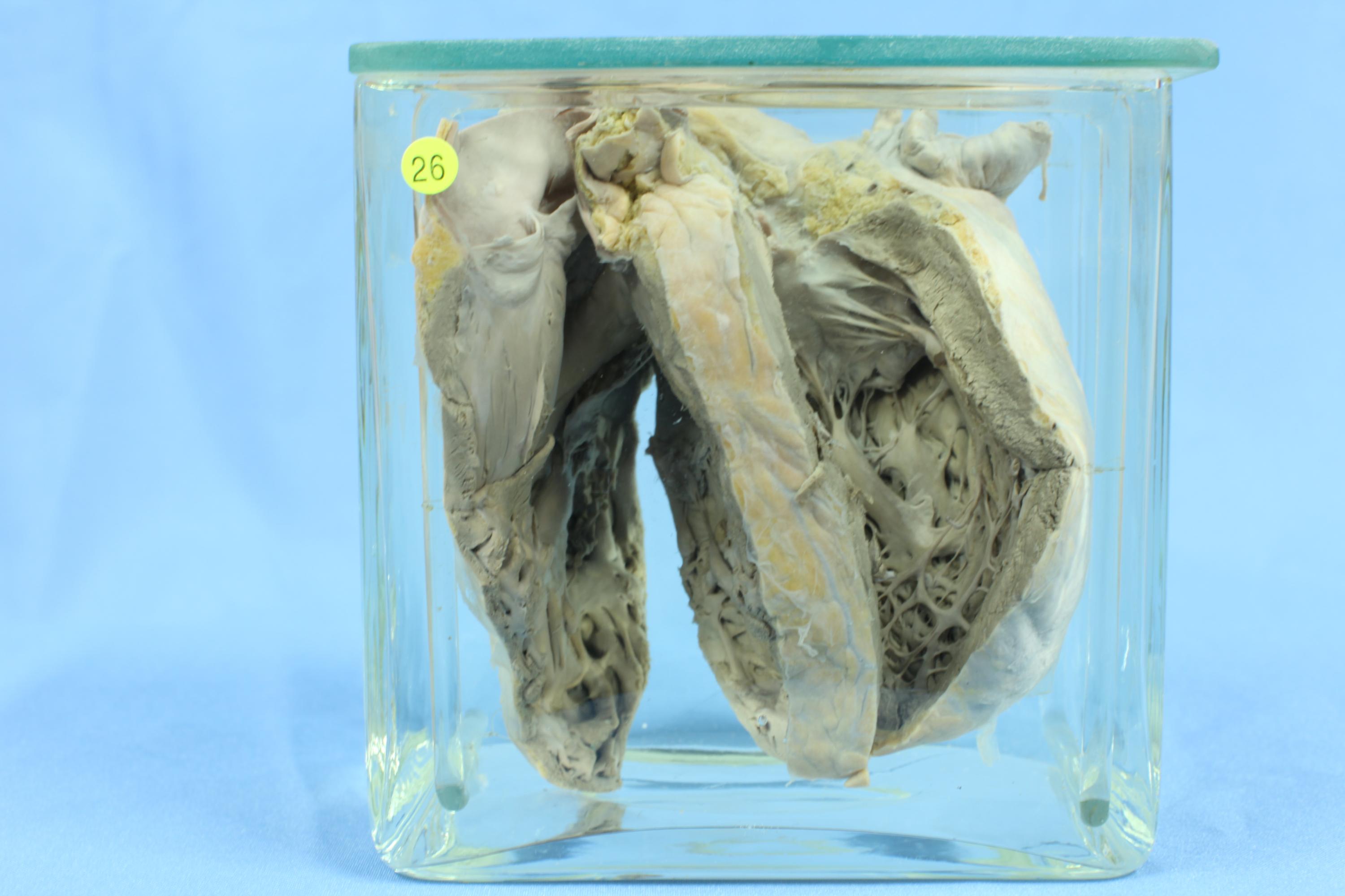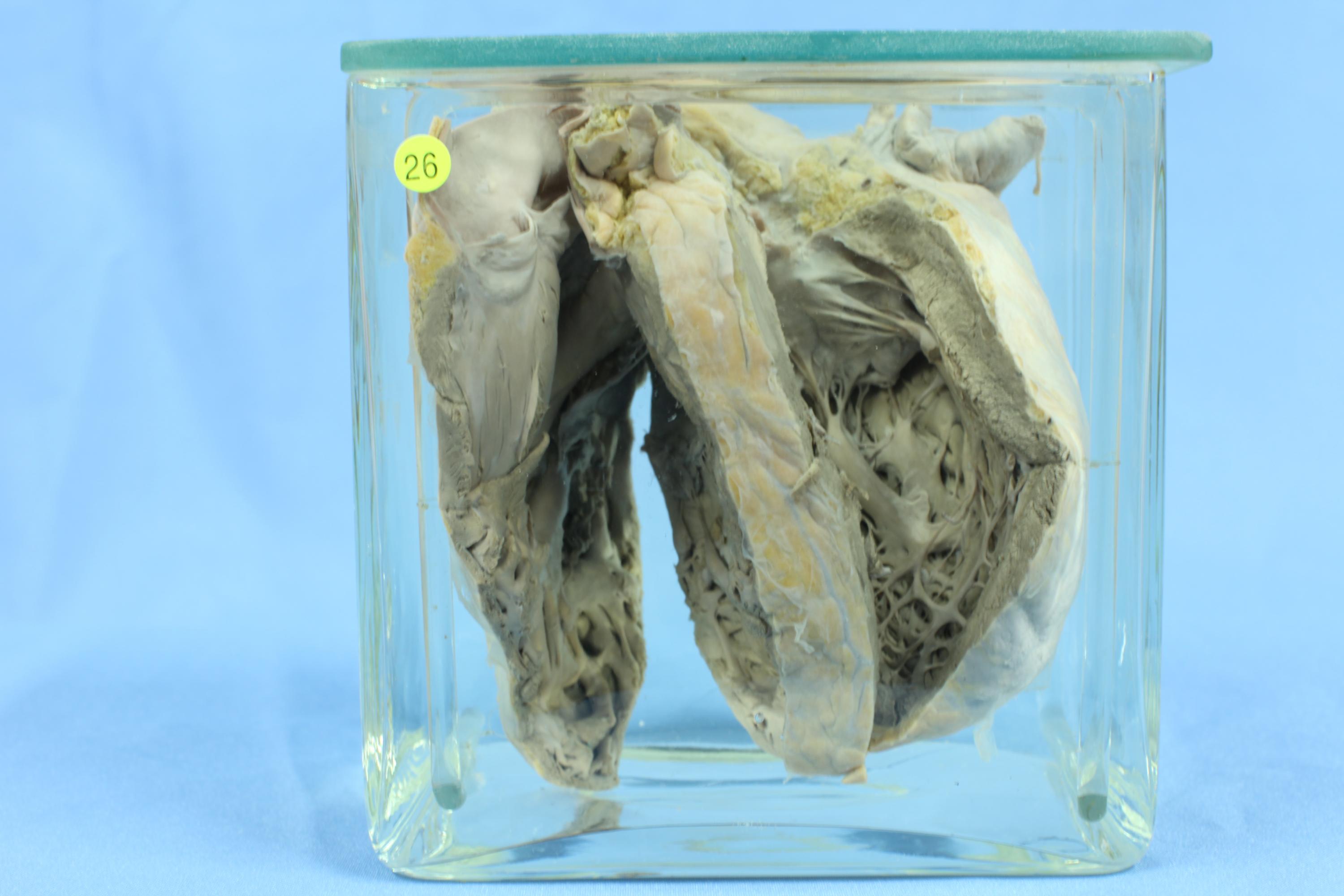 患者男性,63岁,慢性风心病史,心力衰竭。 左心房室已打开,主动脉瓣瓣叶增厚、变硬、表面粗糙、无光泽,瓣叶联合处相互粘连,左心室肌壁增厚,心腔扩张。