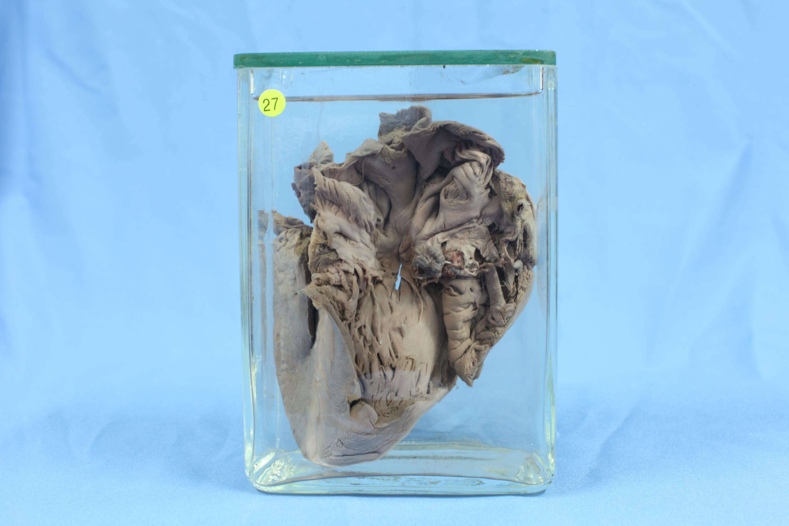 患者男性,58岁,肺炎,肺脓肿,败血症病史。 右心腔已打开,三尖瓣瓣叶上见黑褐色的直径2cm桑葚状赘生物,粗糙、质脆易碎。病变的瓣膜有破坏,无明显的增厚粘连,右心室扩大。