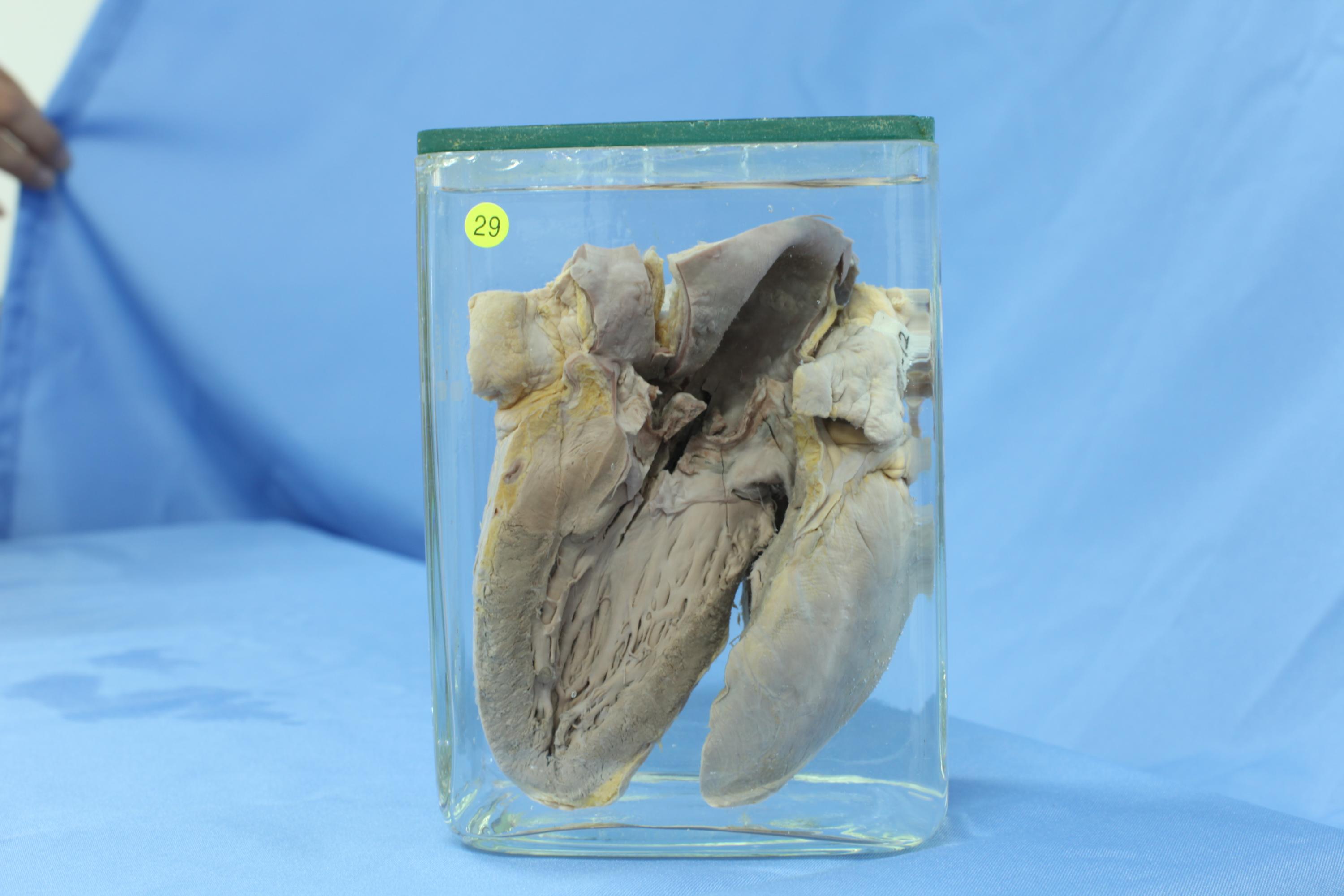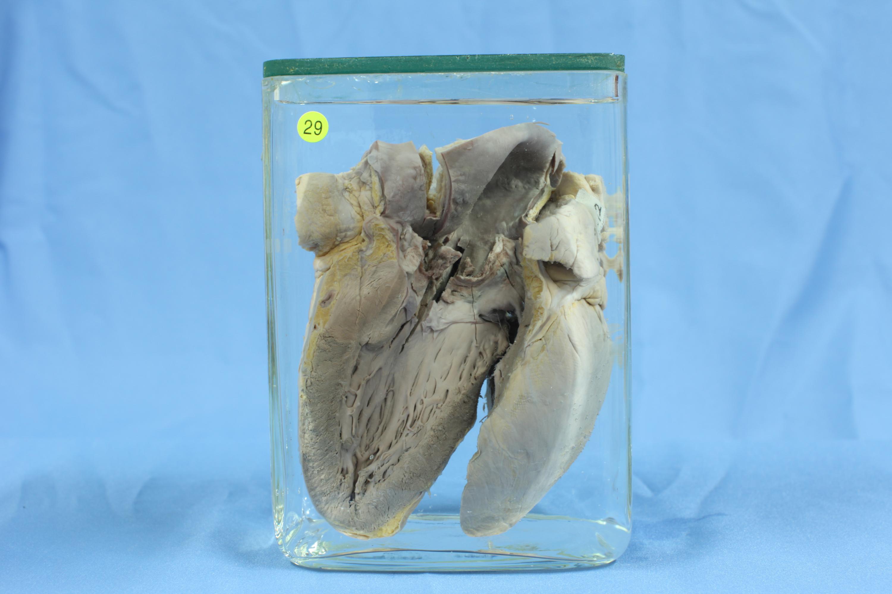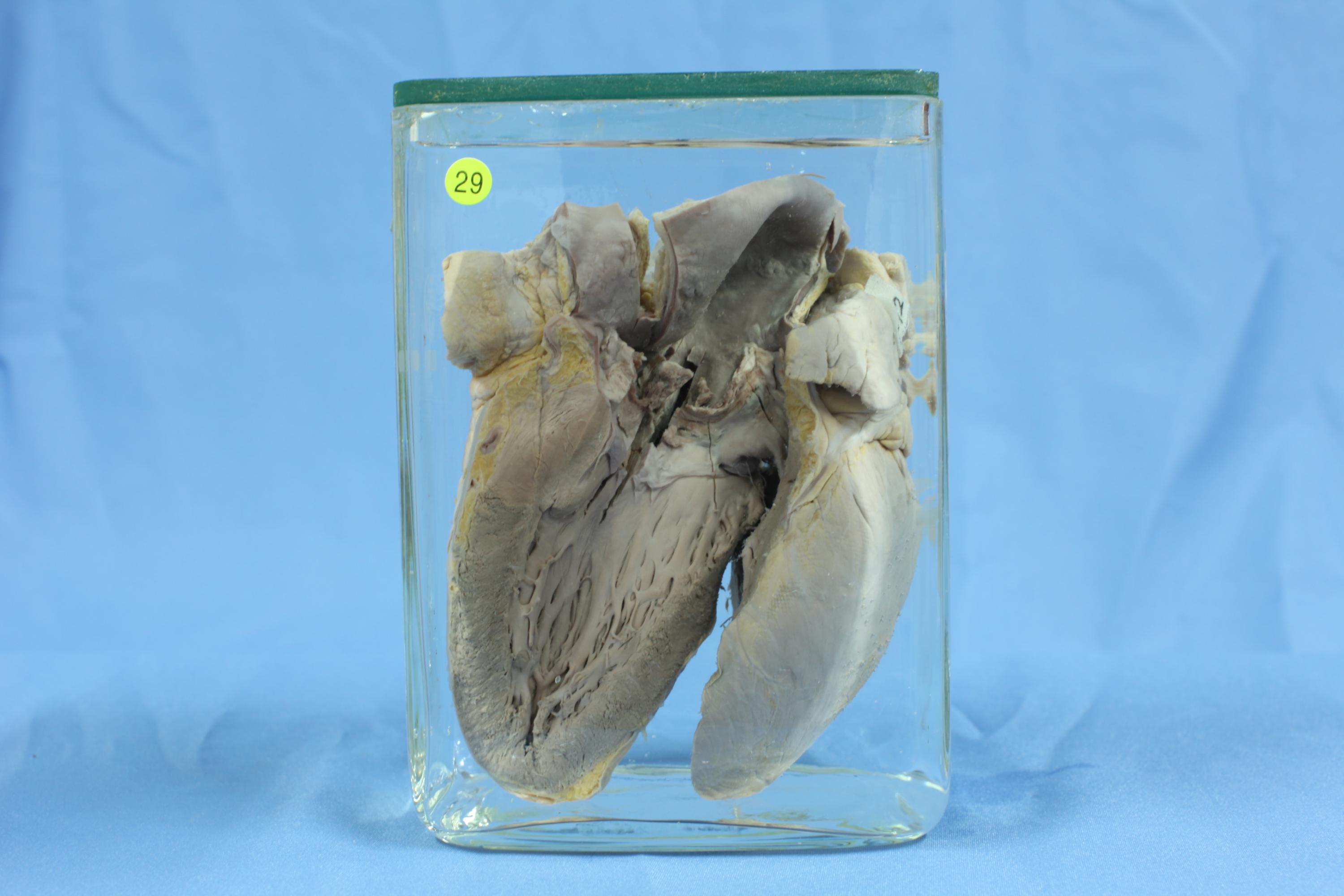 患者男性,49岁,心律紊乱,心力衰竭病史。 左心腔已打开,主动脉瓣瓣叶上见黑褐色的不规则赘生物,粗糙、质脆易碎。病变的瓣膜增厚卷曲,中间破坏,心室扩大。心室心肌轻度增厚。