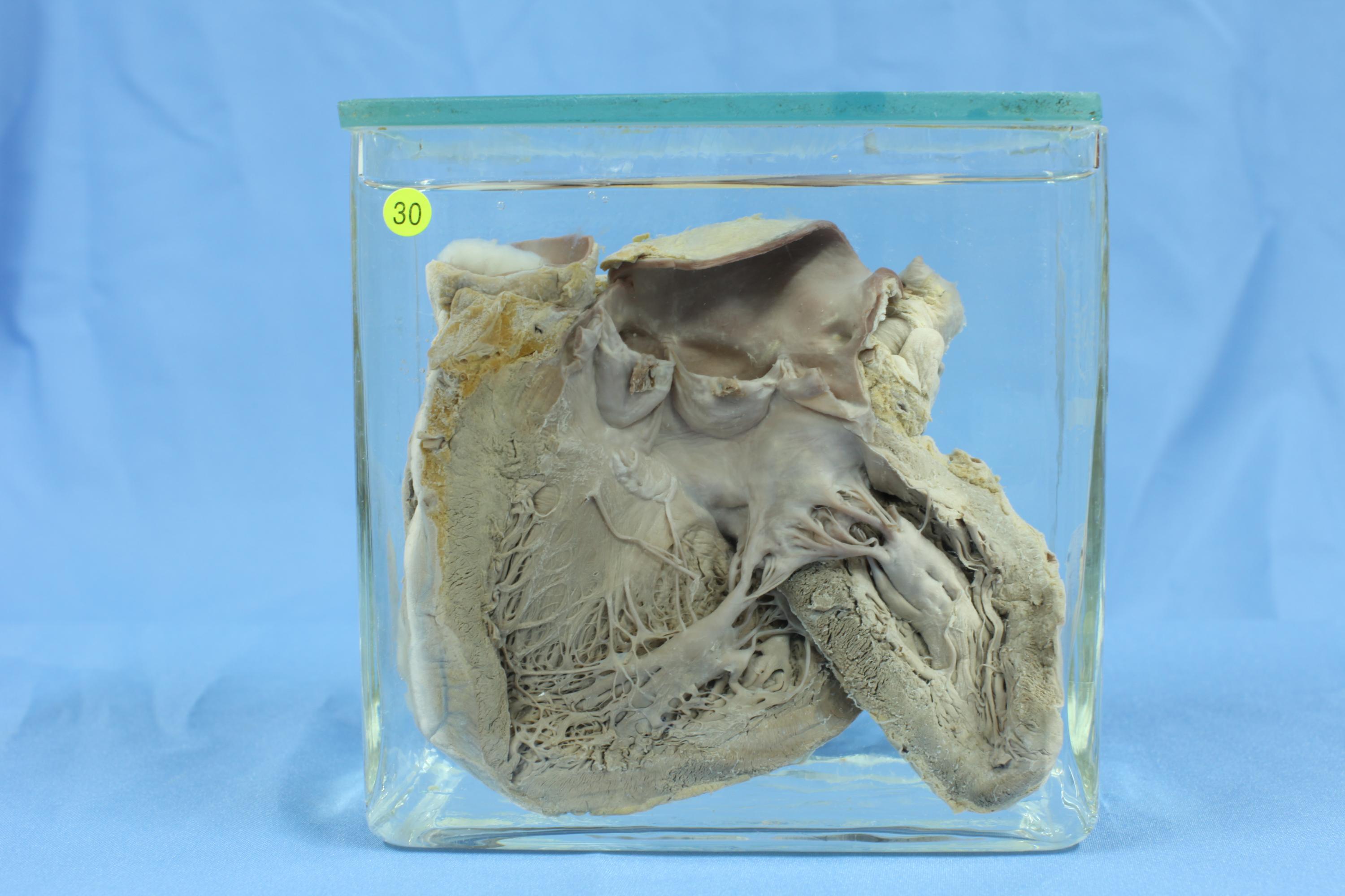 左心室打开,见两主动脉瓣瓣叶上有黄褐色的赘生物,基底与瓣膜连接紧密。瓣膜有轻度增厚,左心室心腔扩张,但心室肌无明显增厚。