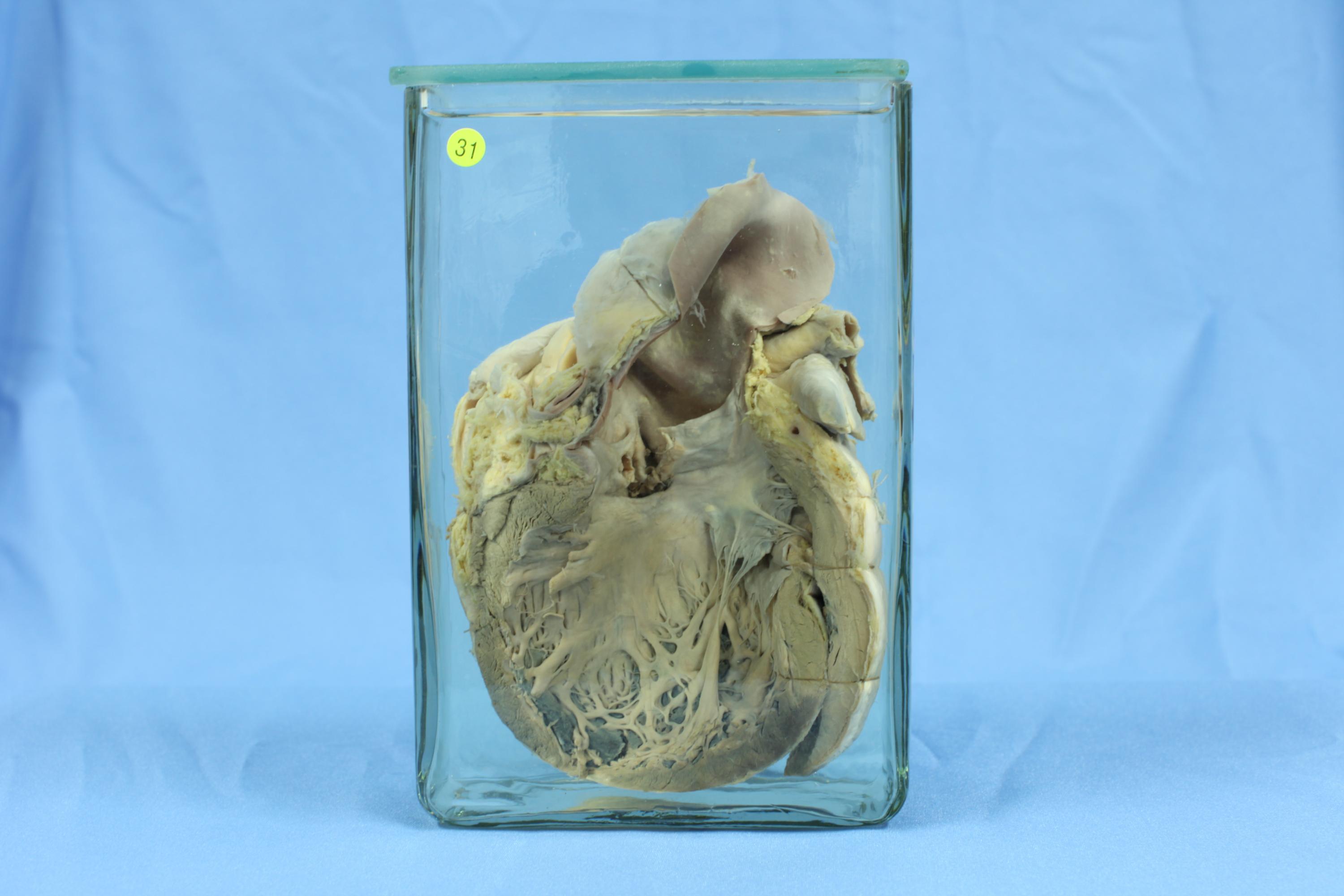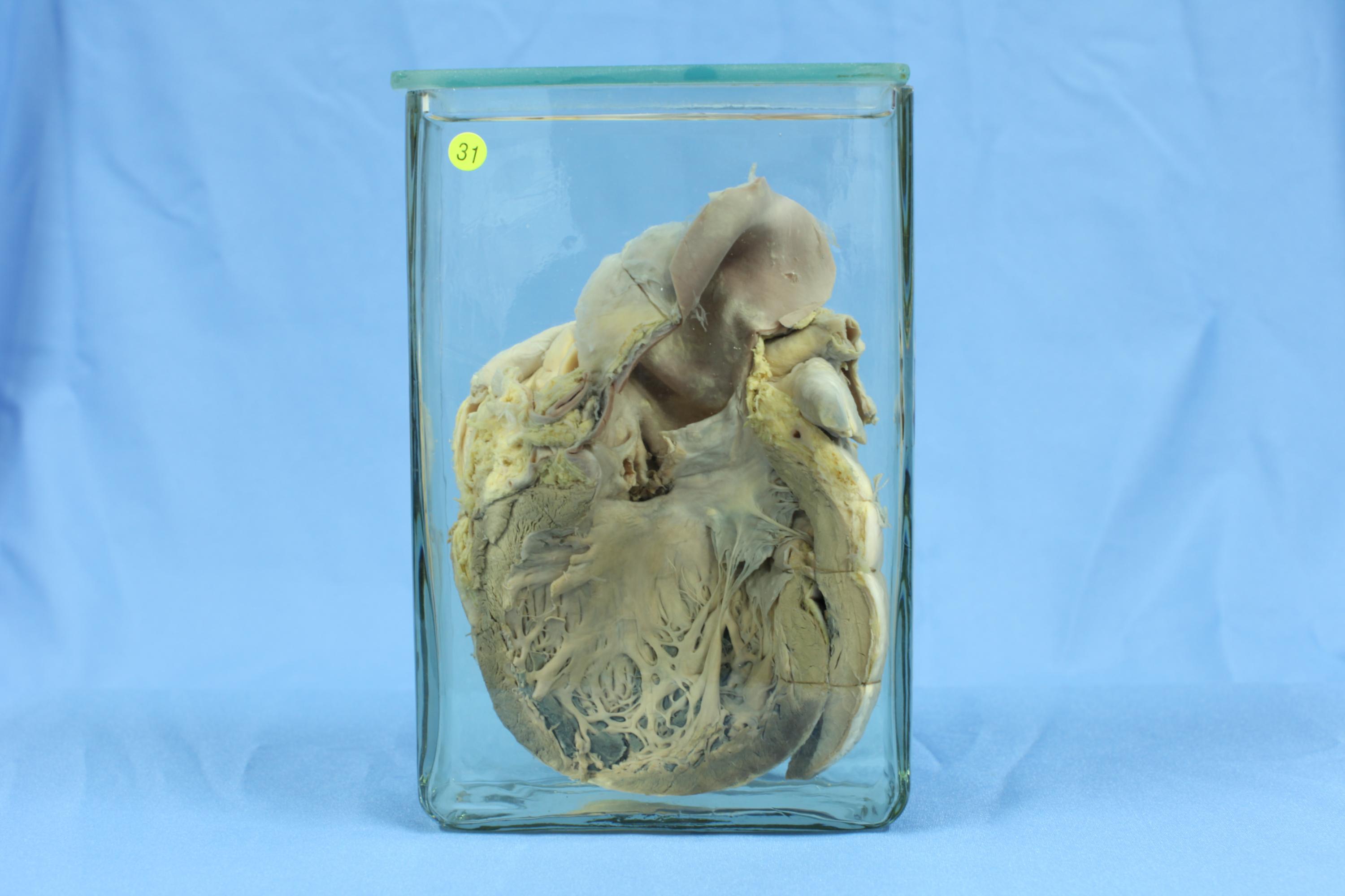 患者男性,57岁,先天性心脏病病史. 标本左心腔打开,主动脉瓣瓣叶上见灰红色小颗粒状赘生物,粗糙、质脆易碎。同时病变的瓣膜有一个破裂开口。左心室明显扩大。