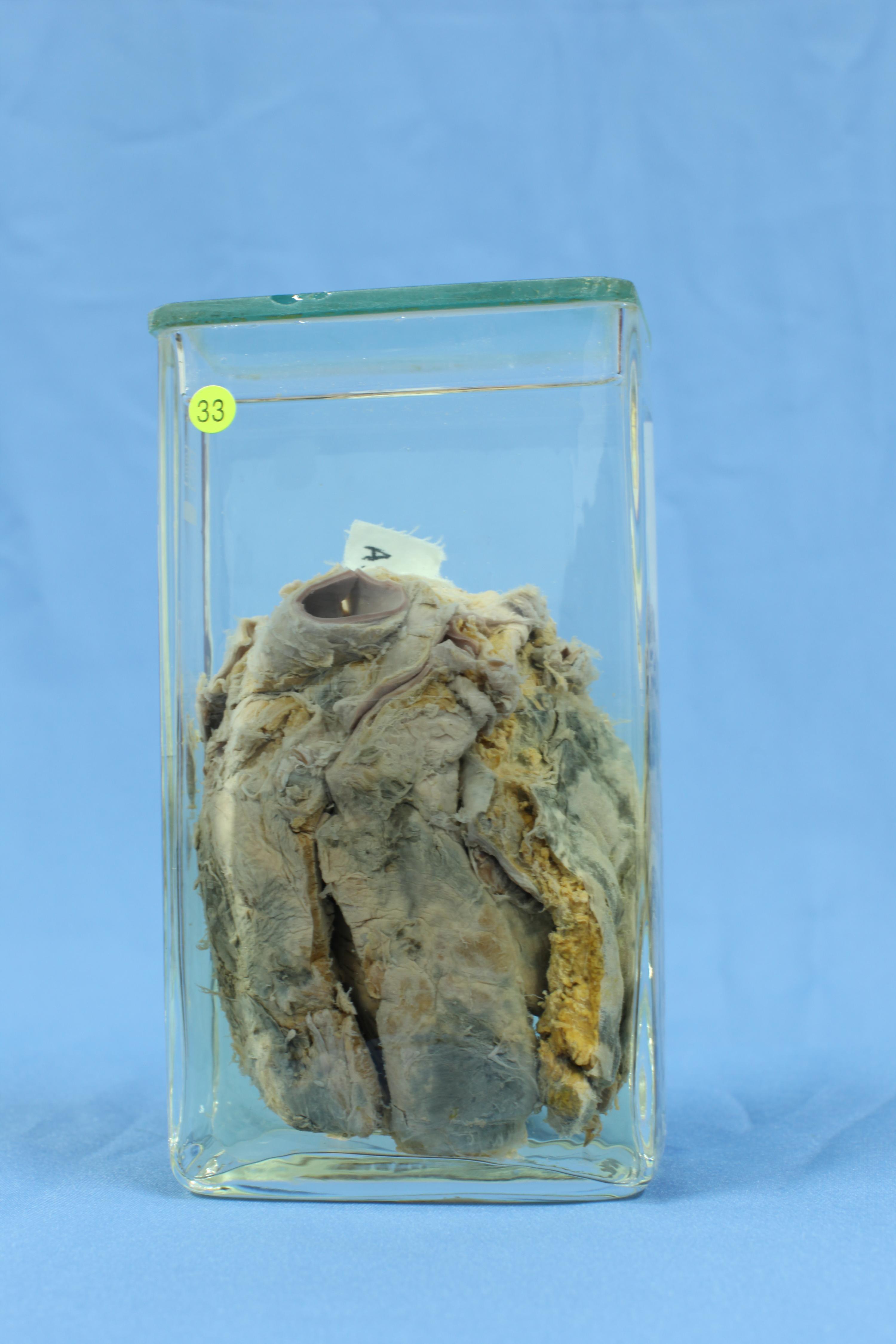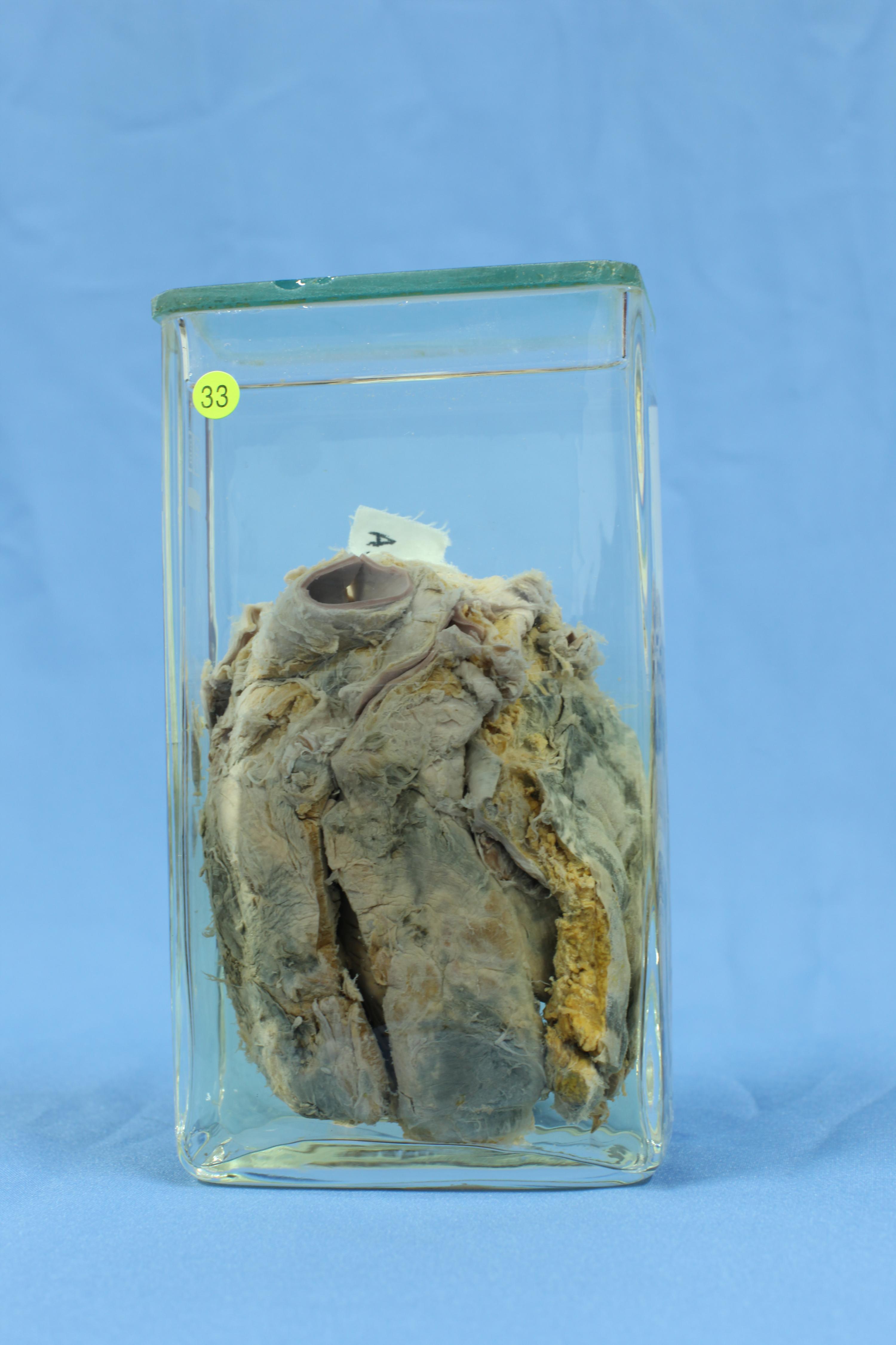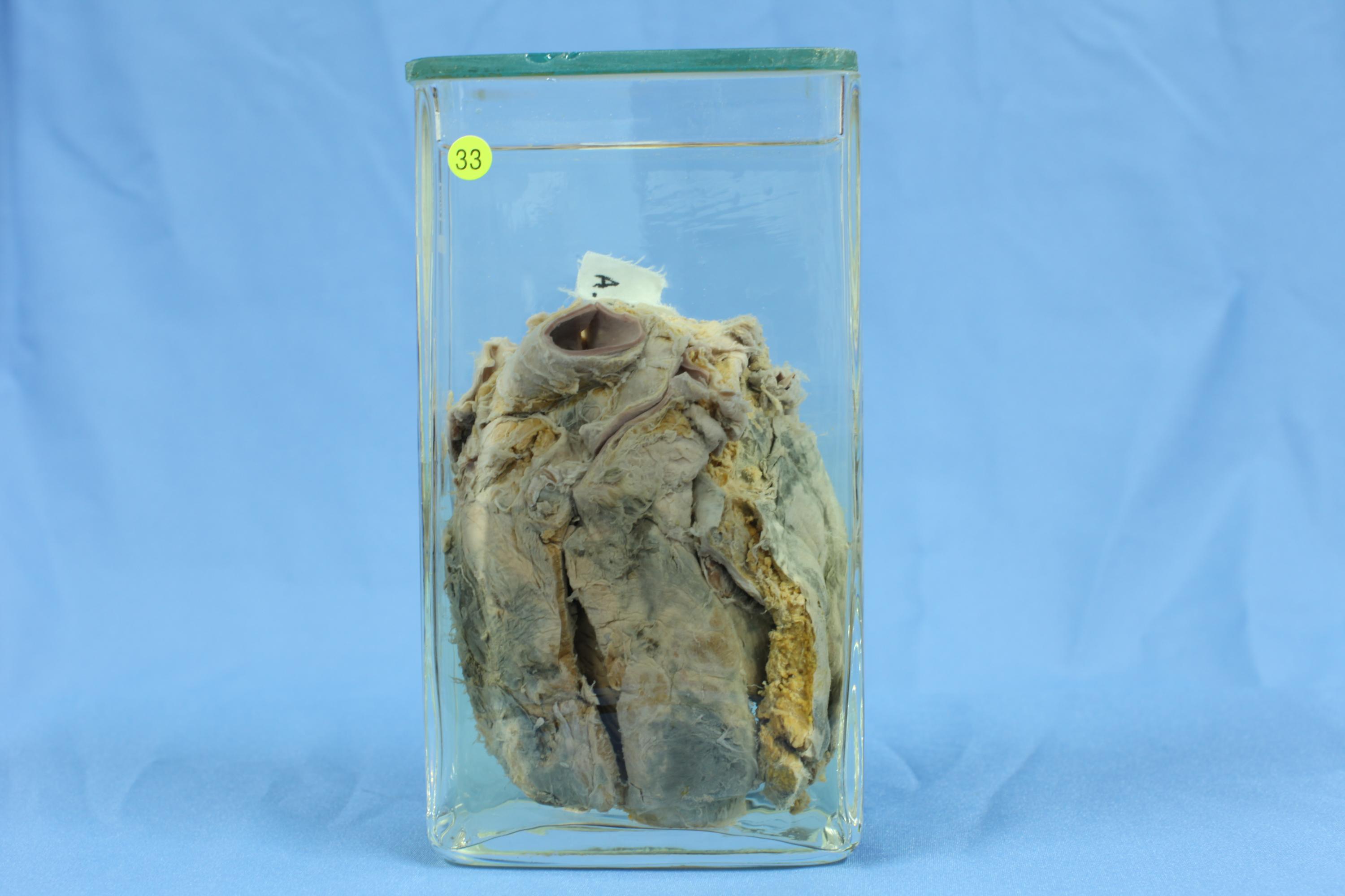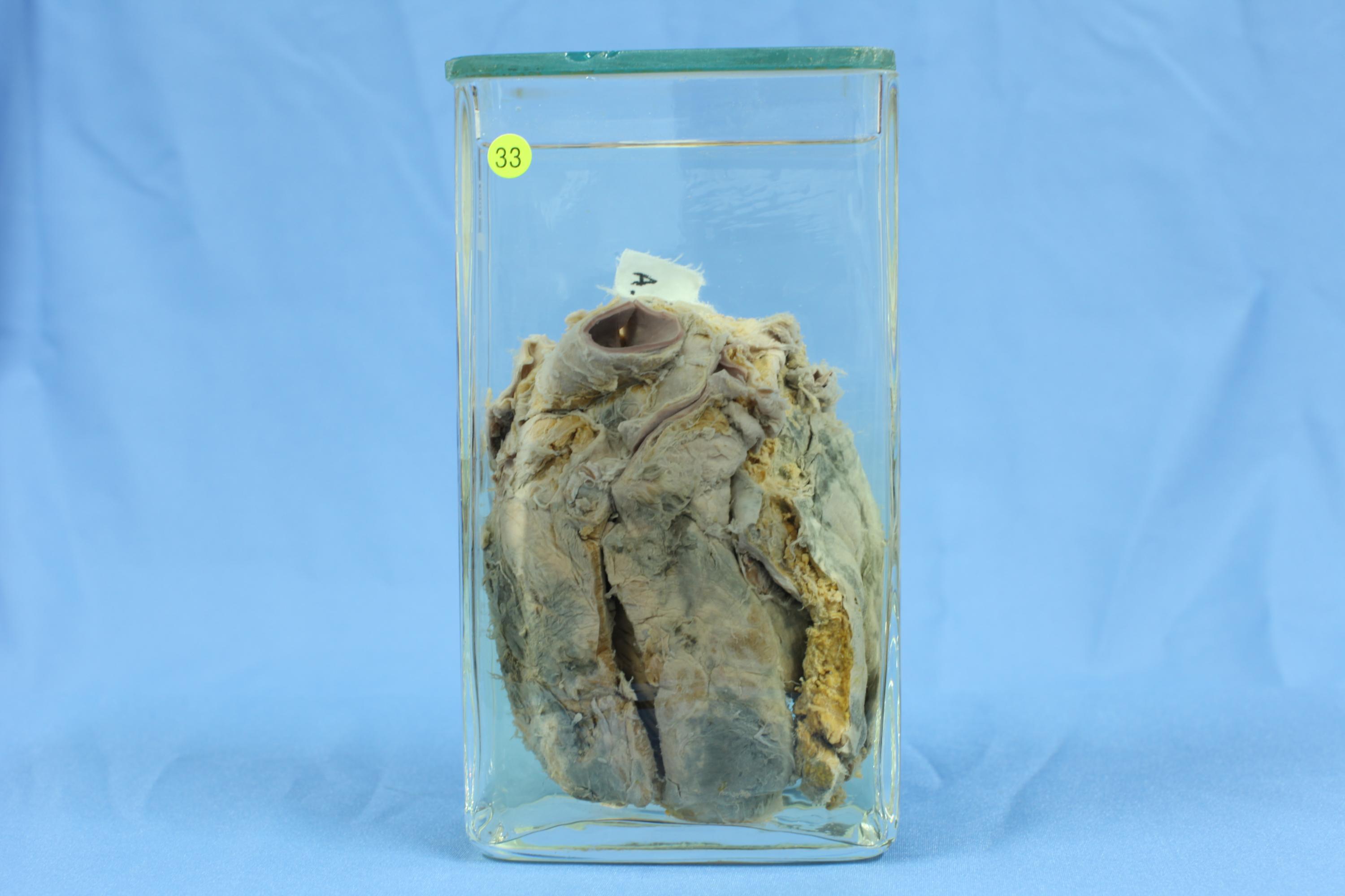 患者女性,32岁,有肺结核病史,急性心力衰竭。 心脏标本,心包壁层已被剪去, 心外膜(脏层)表面不规则粗糙增厚,覆盖一层灰白色渗出物。标本左侧见保留一段心包壁层组织, 明显增厚,纤维化, 紧贴着心脏表面. 心包腔已被填塞.