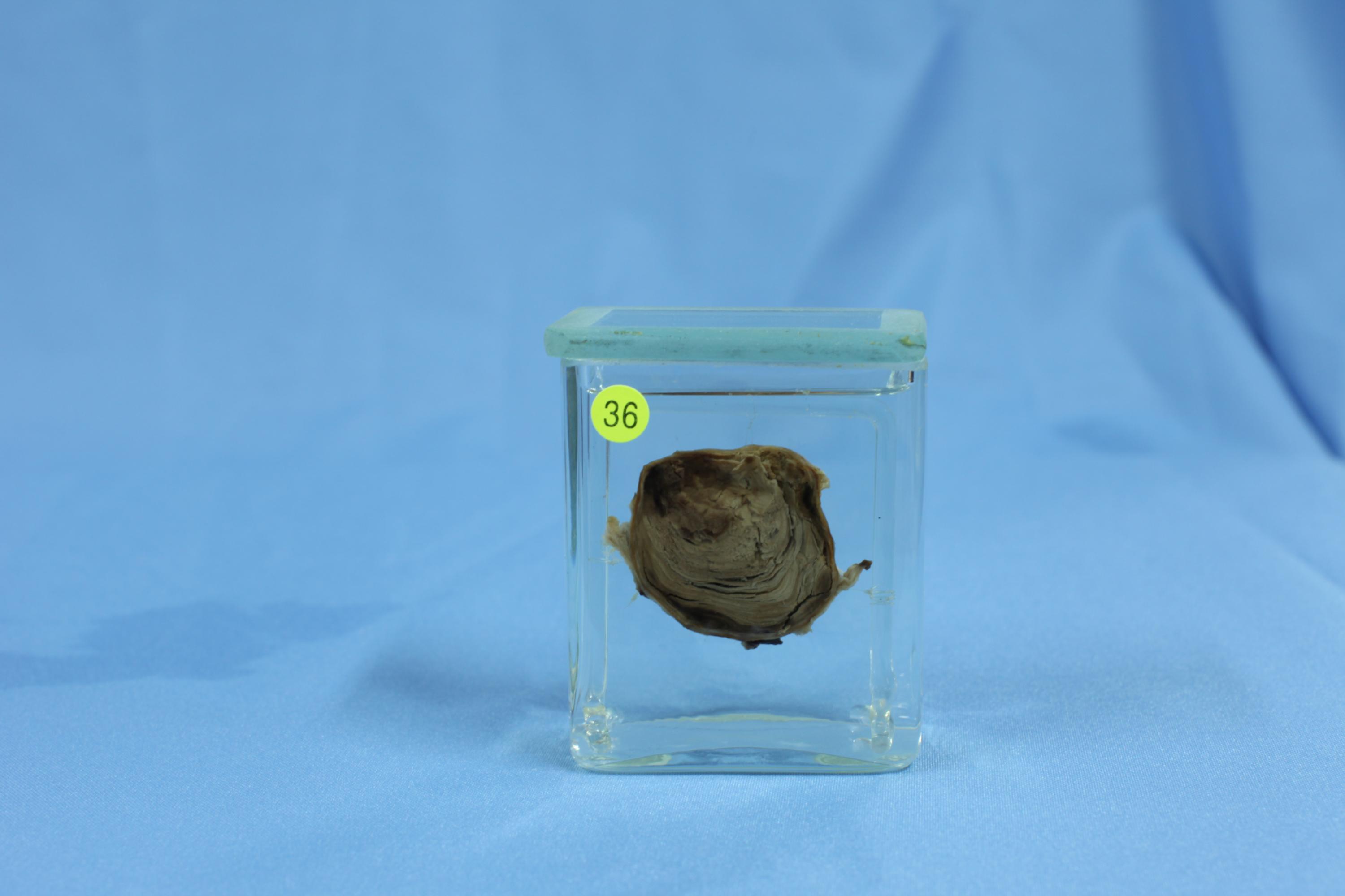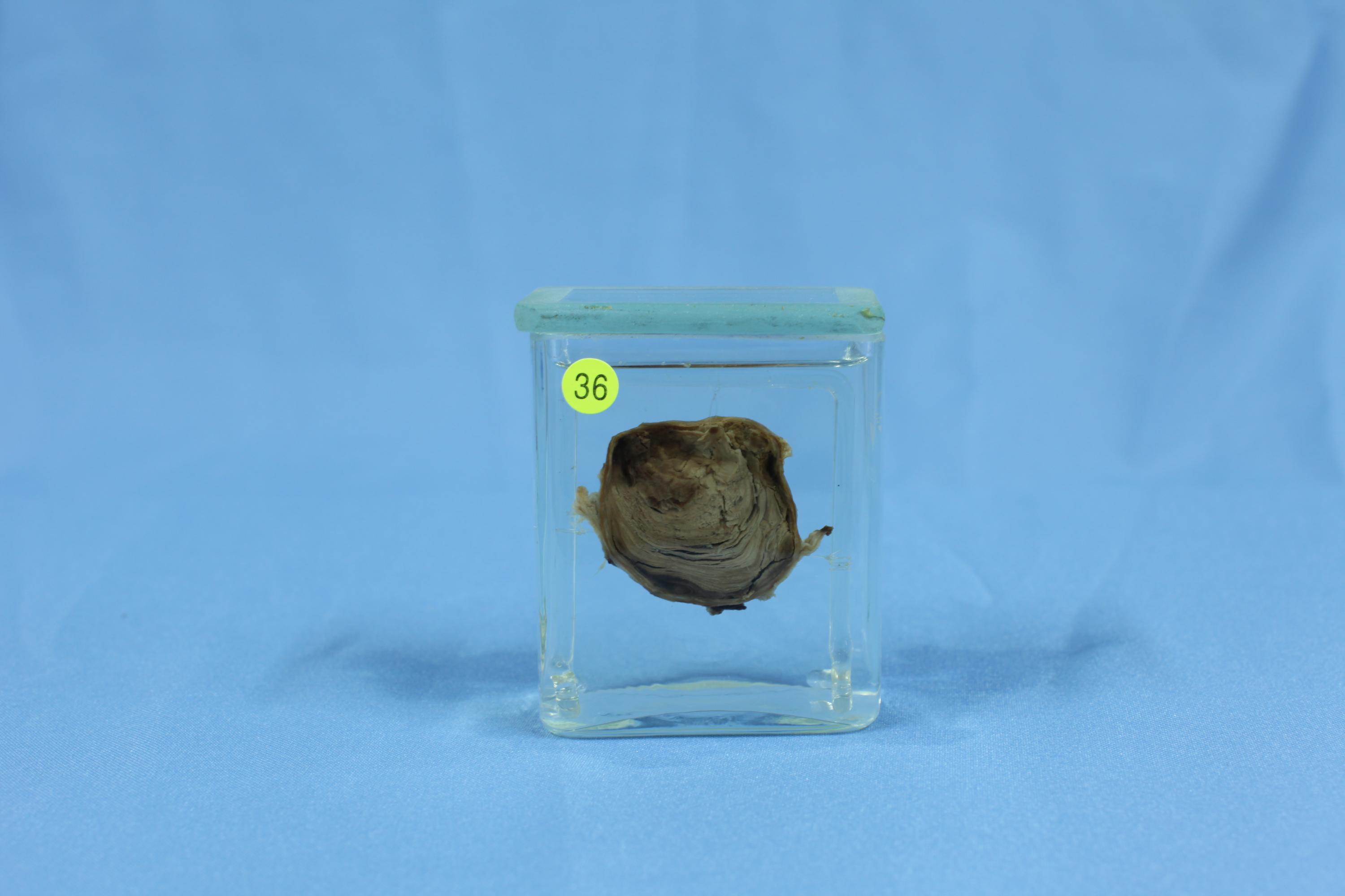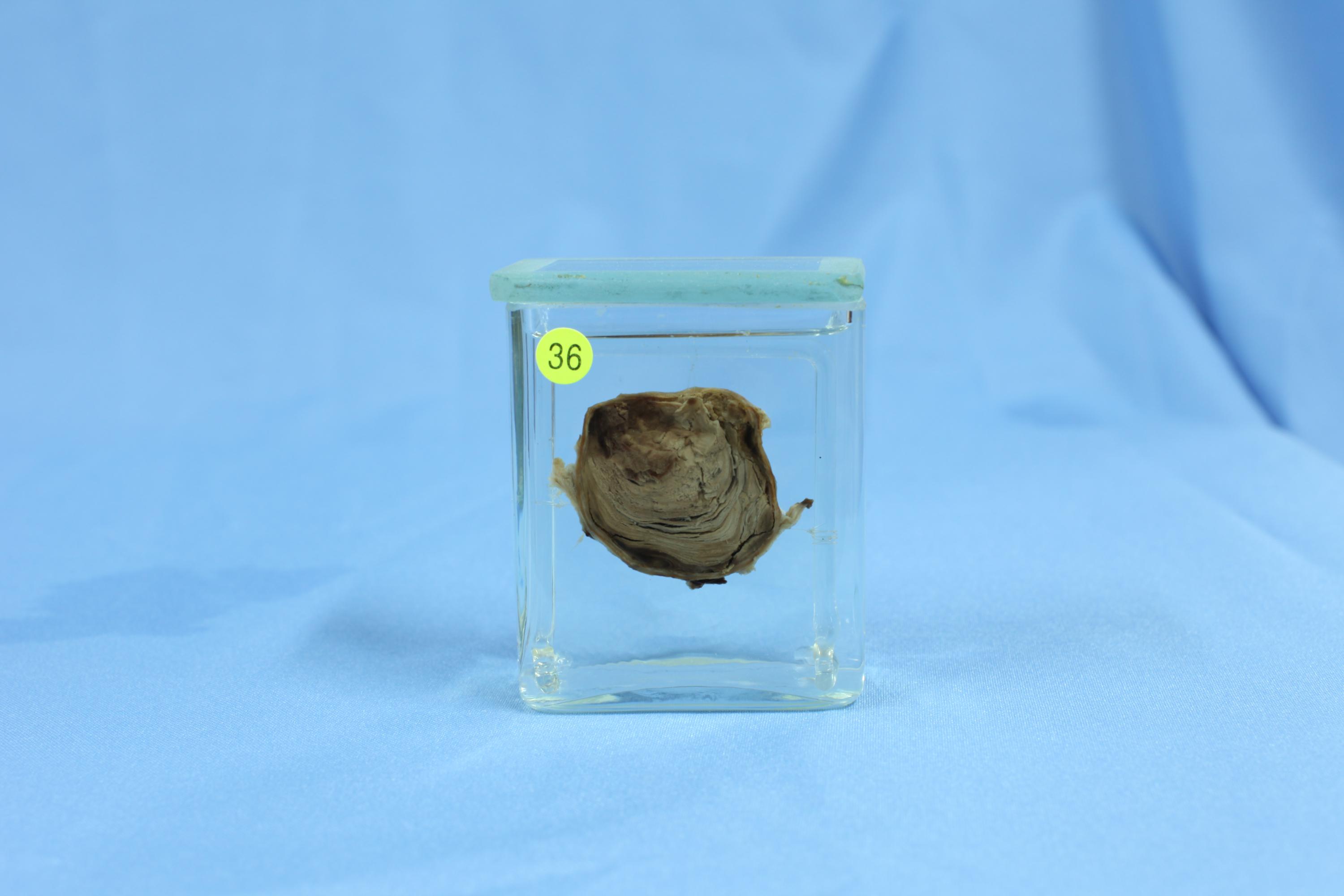 主动脉瘤向外突起部分的横断切面,见动脉管壁明显变薄,内有大块附壁血栓充满整个管腔,切面见血栓为多层结构。