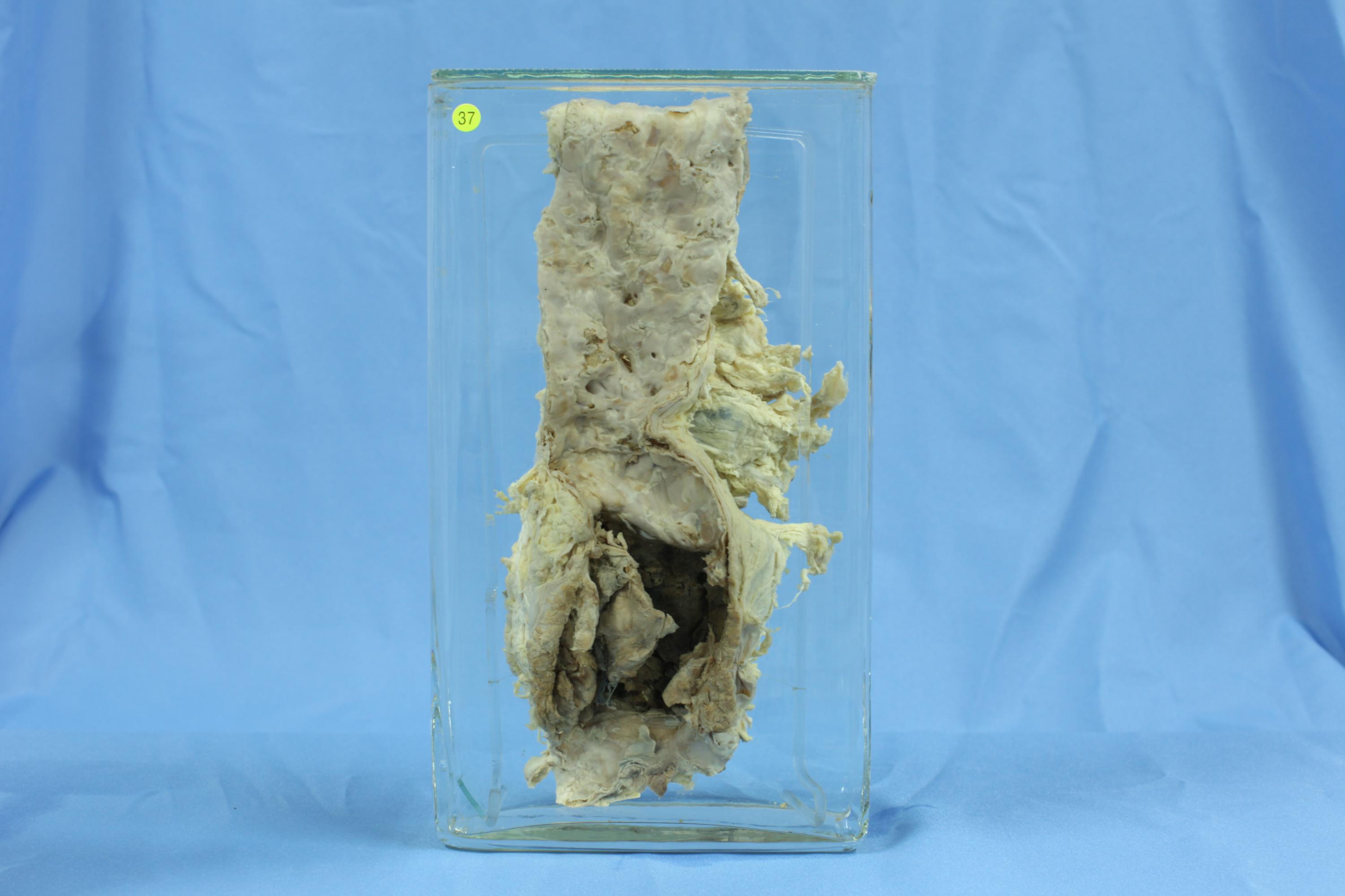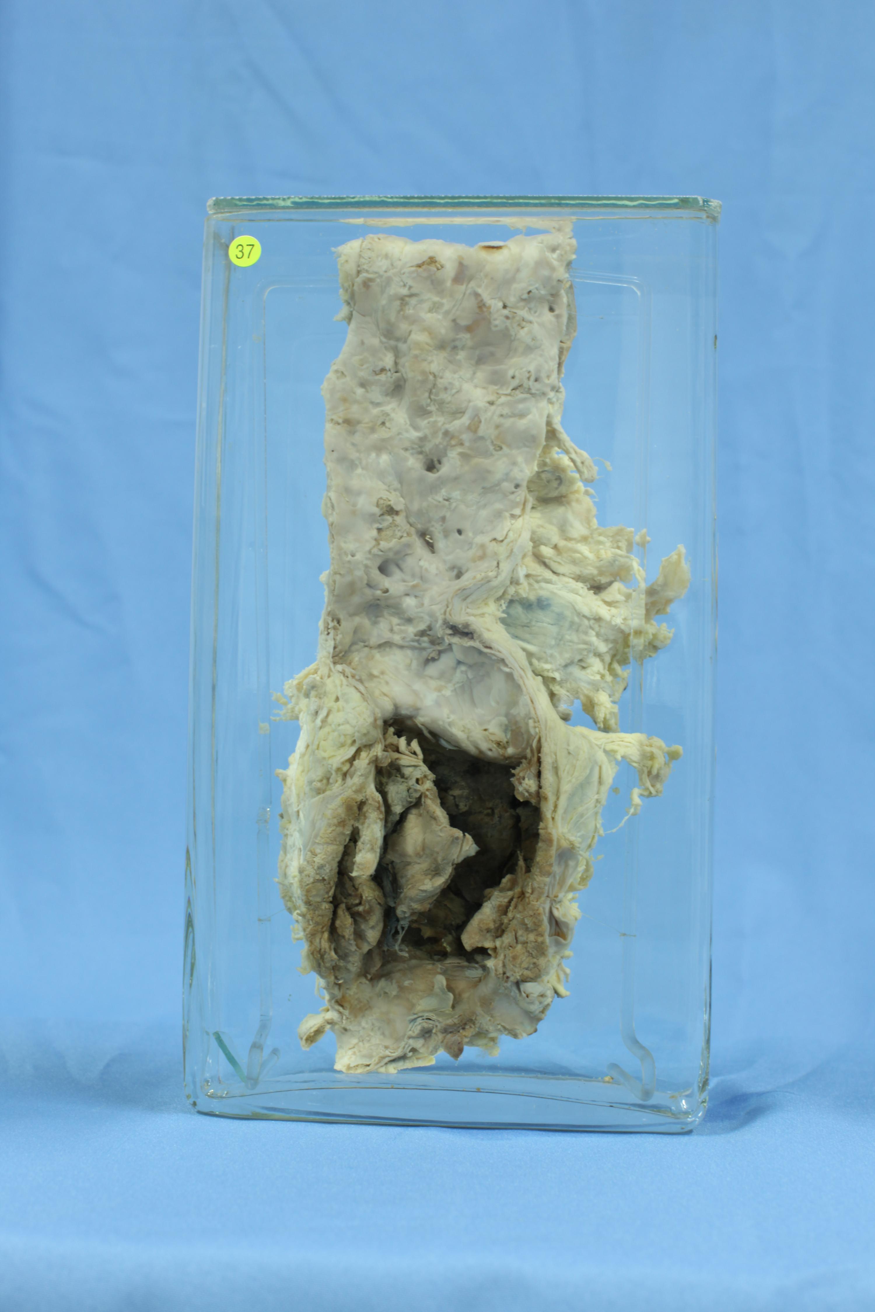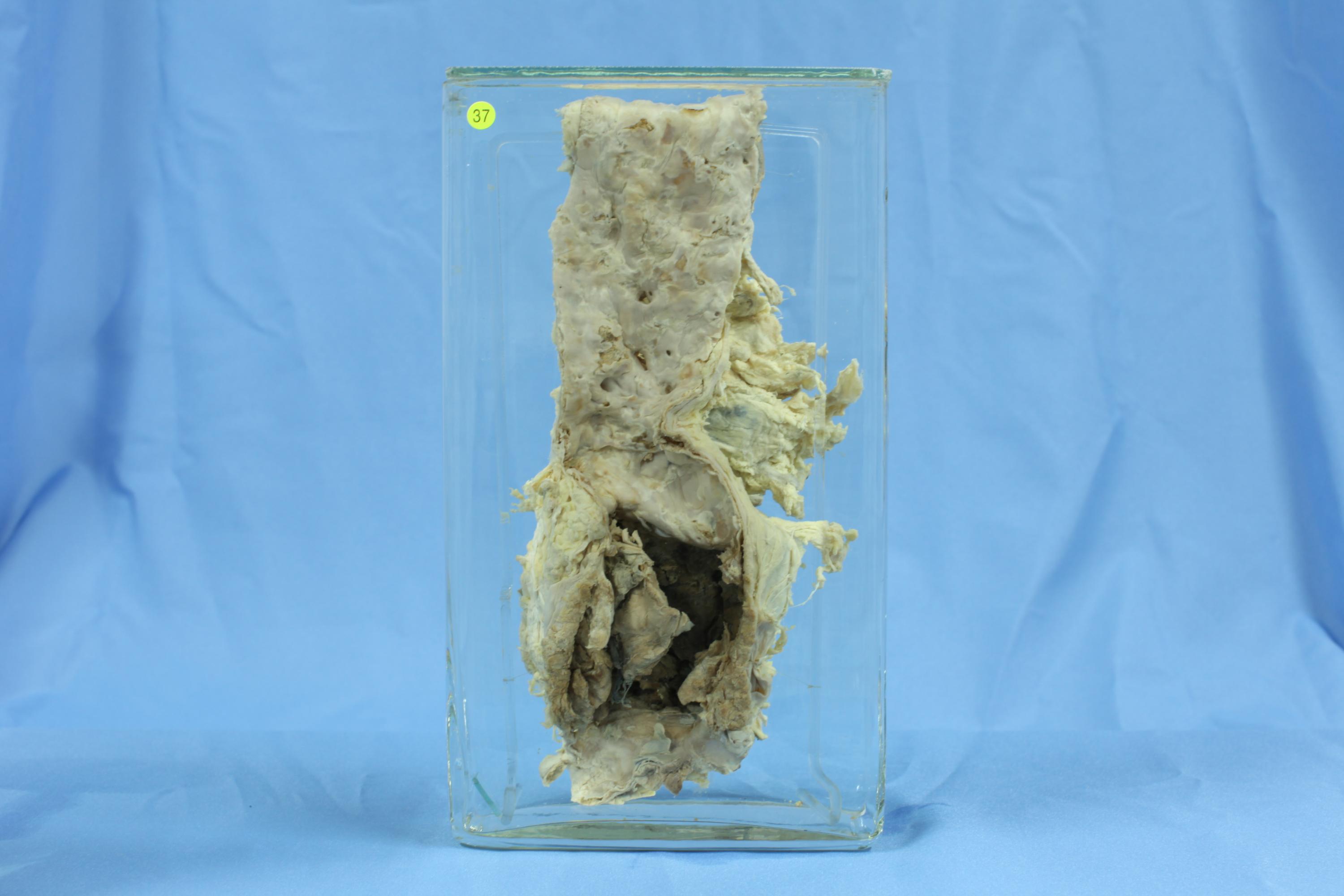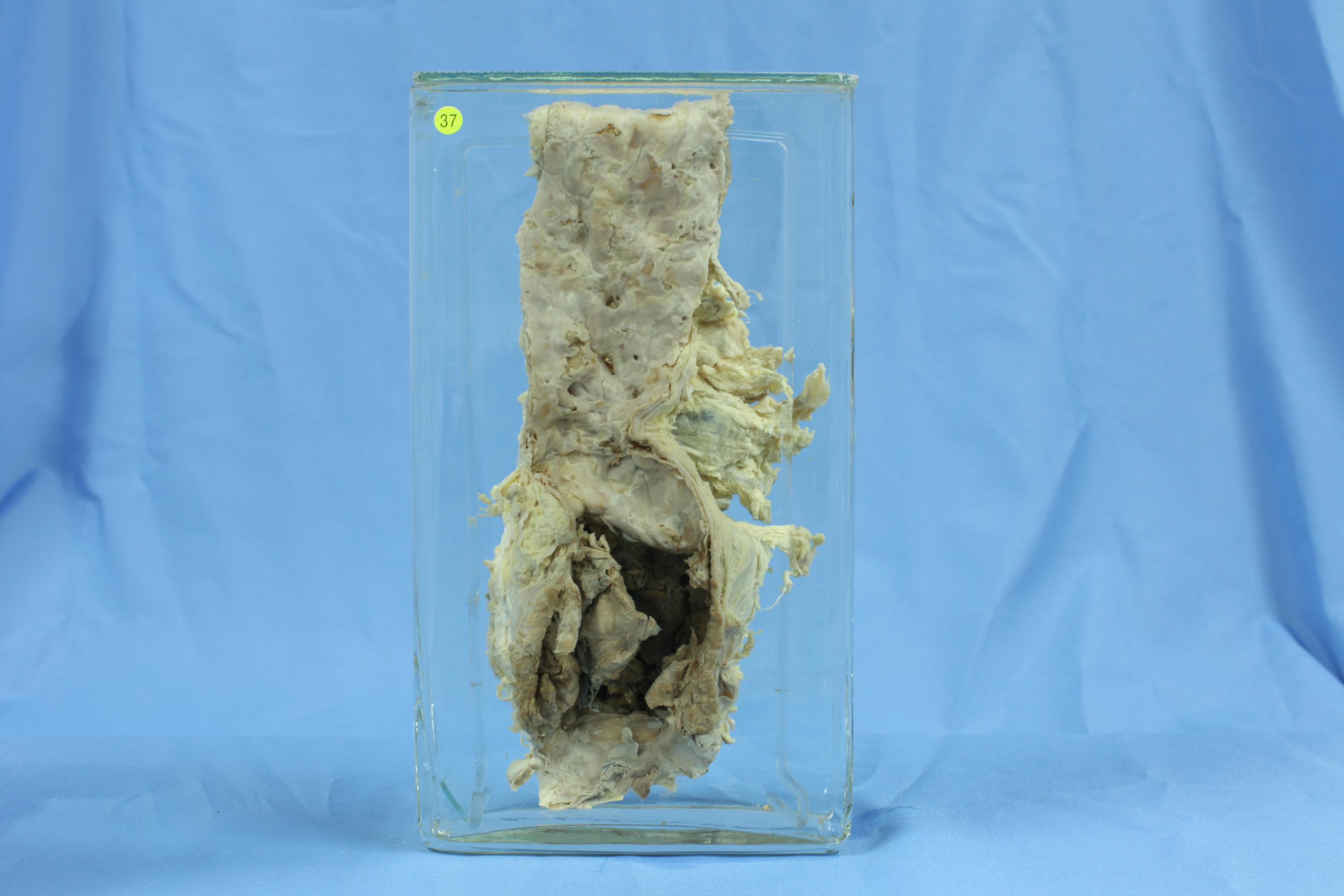 主动脉全长,标本前面显示腹主动脉,内膜表面有大量不规则灰黄色脂质斑块广泛分布, 有明显的钙化和溃疡形成,内膜增厚, 主动脉下端局部主动脉显著扩张, 呈球形向后突出. 球形腔内见内膜呈层状分裂, 最表面一层内膜破裂不完整. 反面为胸主动脉,内膜上也有大量脂质斑块。
