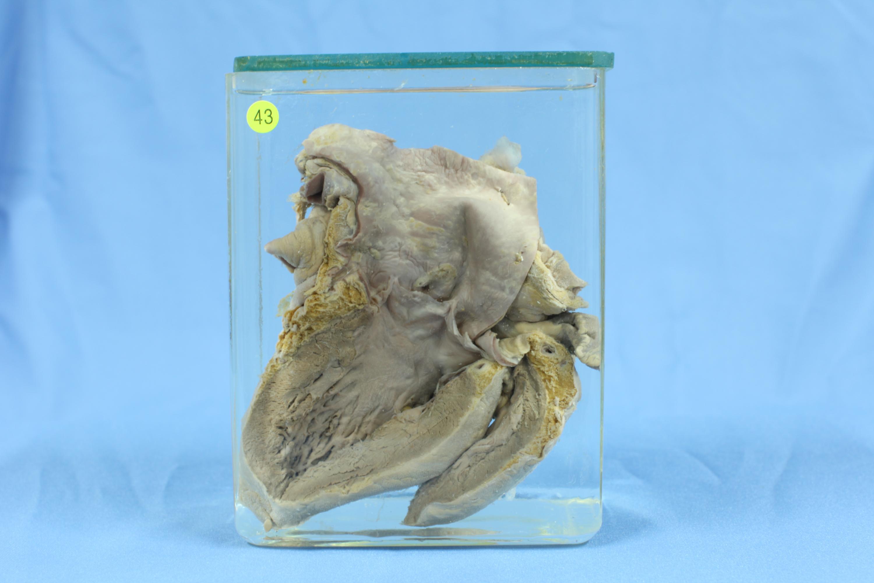 患者男性, 57岁, 有梅毒病史. 心脏左心室已打开,见起始部主动脉内膜表面有多个乳白色斑块散在分布,并累及冠状动脉开口处。主动脉扩张,管壁增厚。主动脉瓣有扭曲变形。左心室心肌明显肥厚,心室扩大。