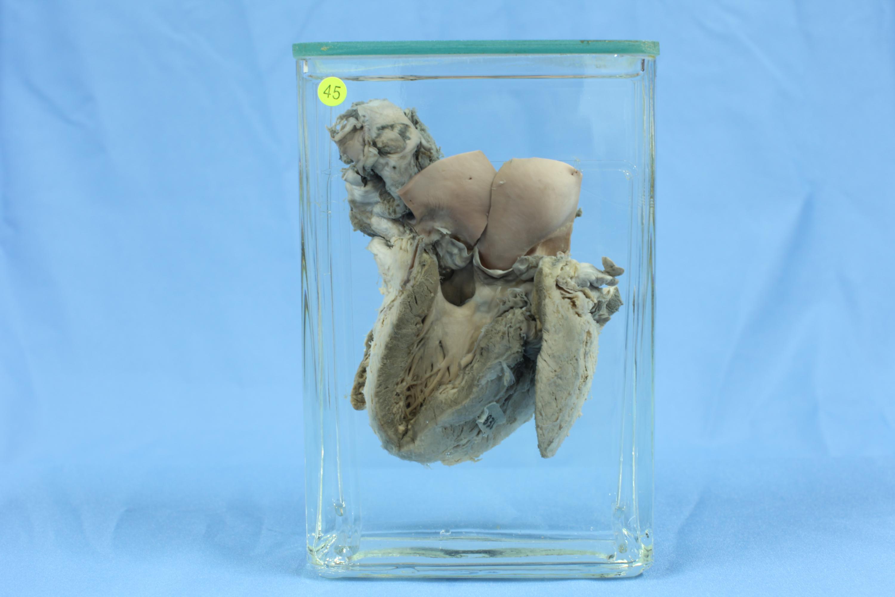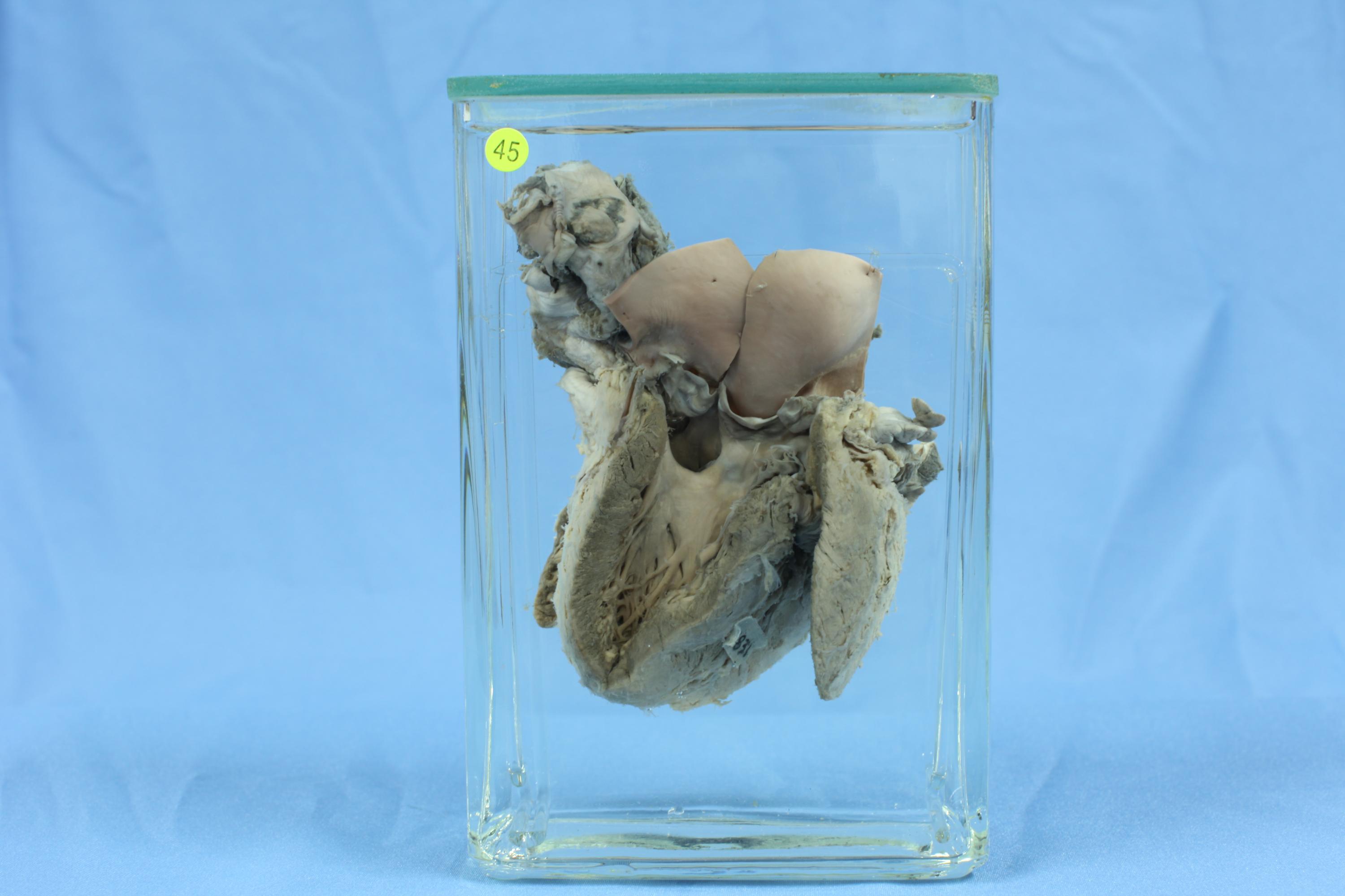 患者男性,19岁,法乐氏四联征,小叶性肺炎病史。心脏标本正面为左心室,见室间隔上部的膜部有一个很大的圆形缺损空洞,缺损口的上方正对着主动脉的开口大部分,而主动脉瓣最里面一个瓣叶内移到右心室,形成主 动脉骑跨,左心室略有扩张,从标本背面观察,可见右心室扩大。