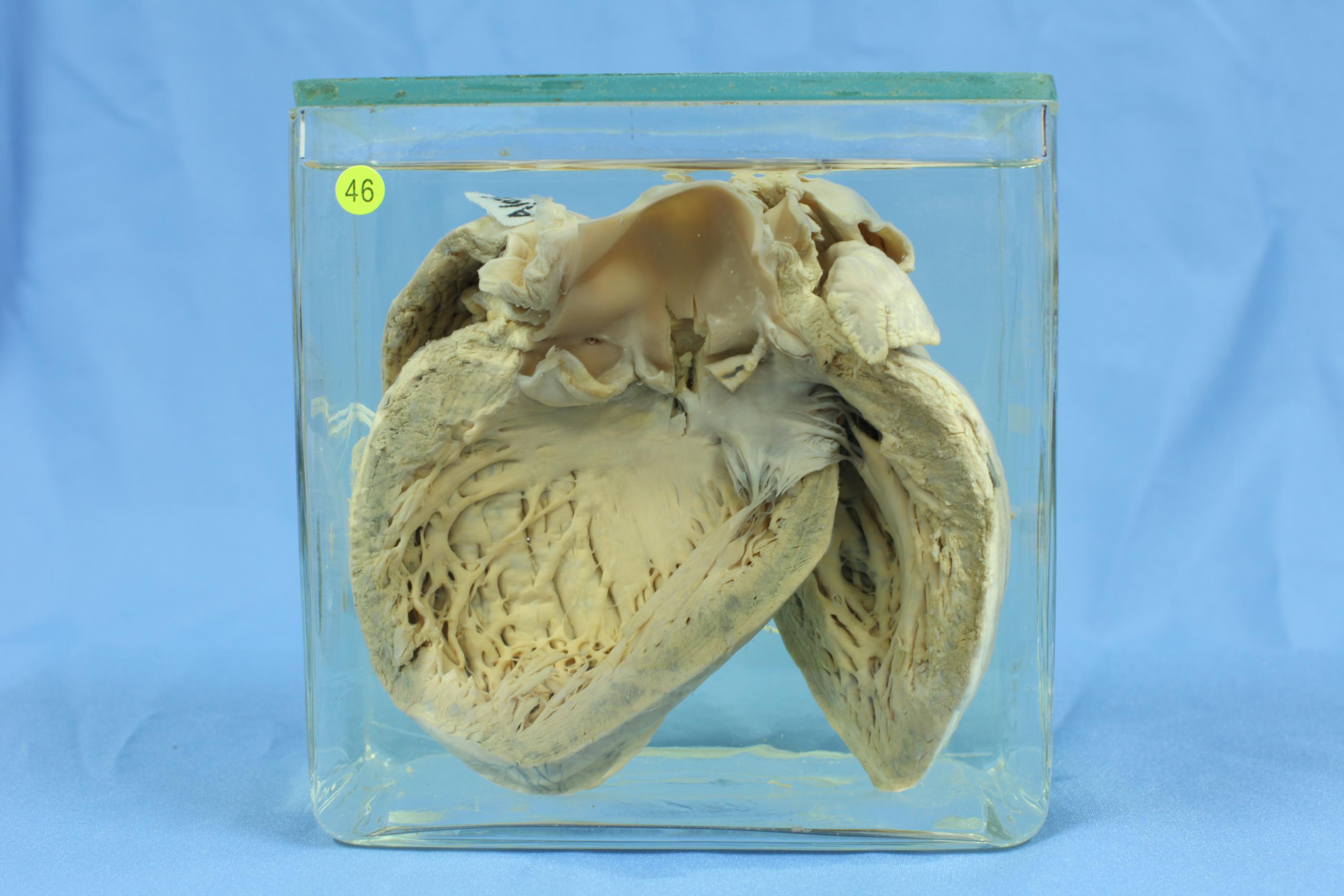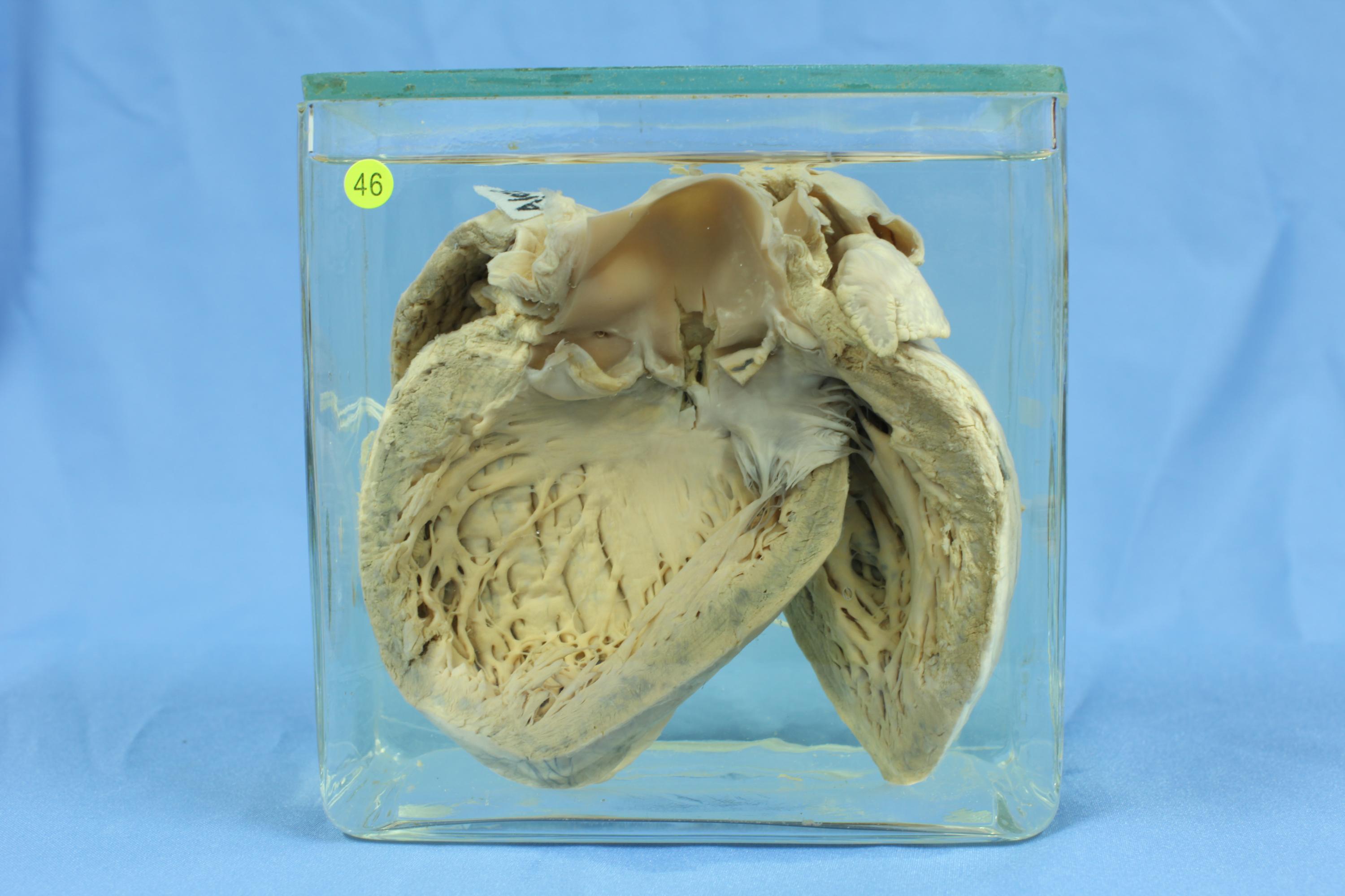 左心腔已打开,主动脉瓣呈双瓣结构,瓣叶增厚,卷曲,瓣叶中间可见不规则赘生物,心室扩大。心室心肌轻度增厚。