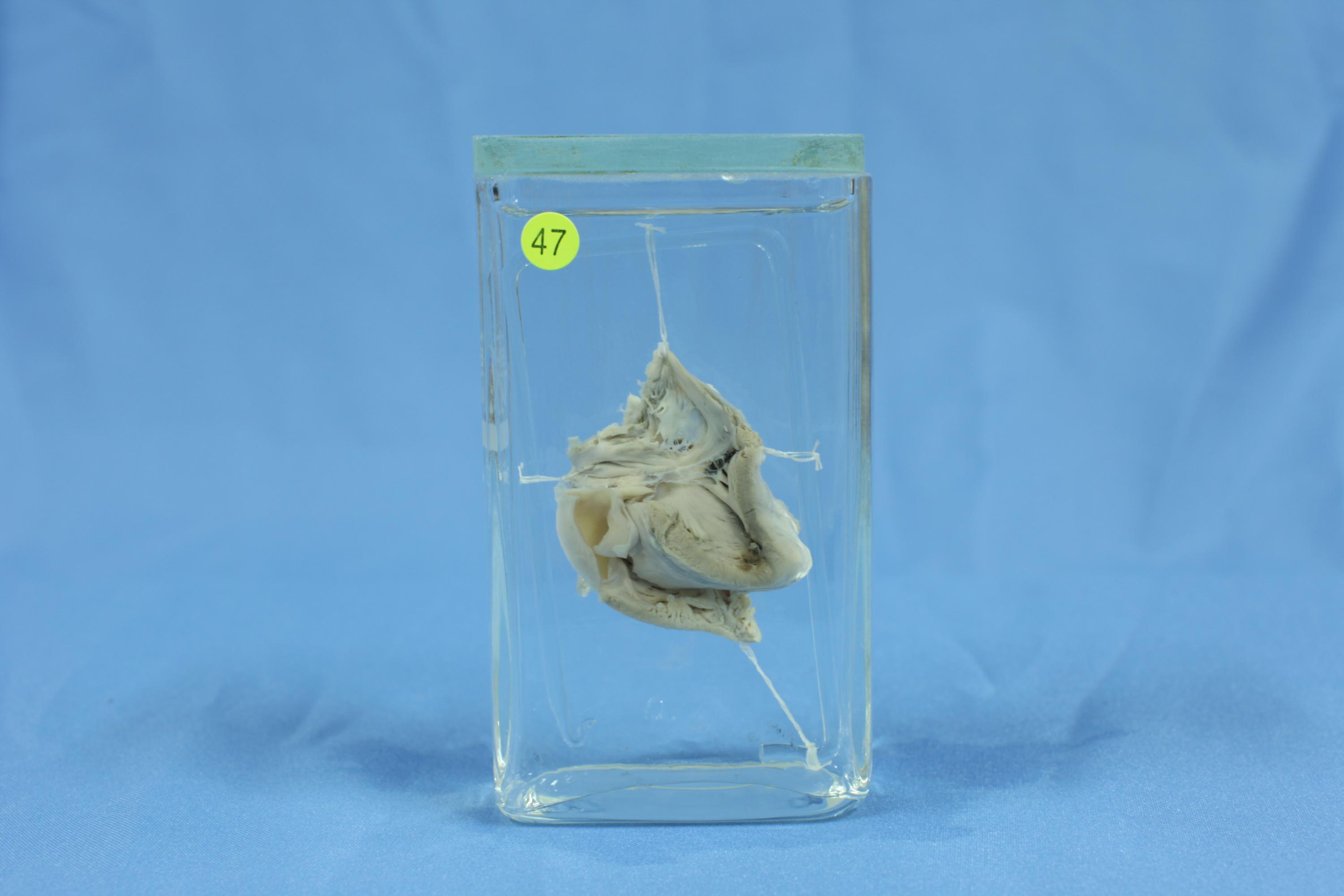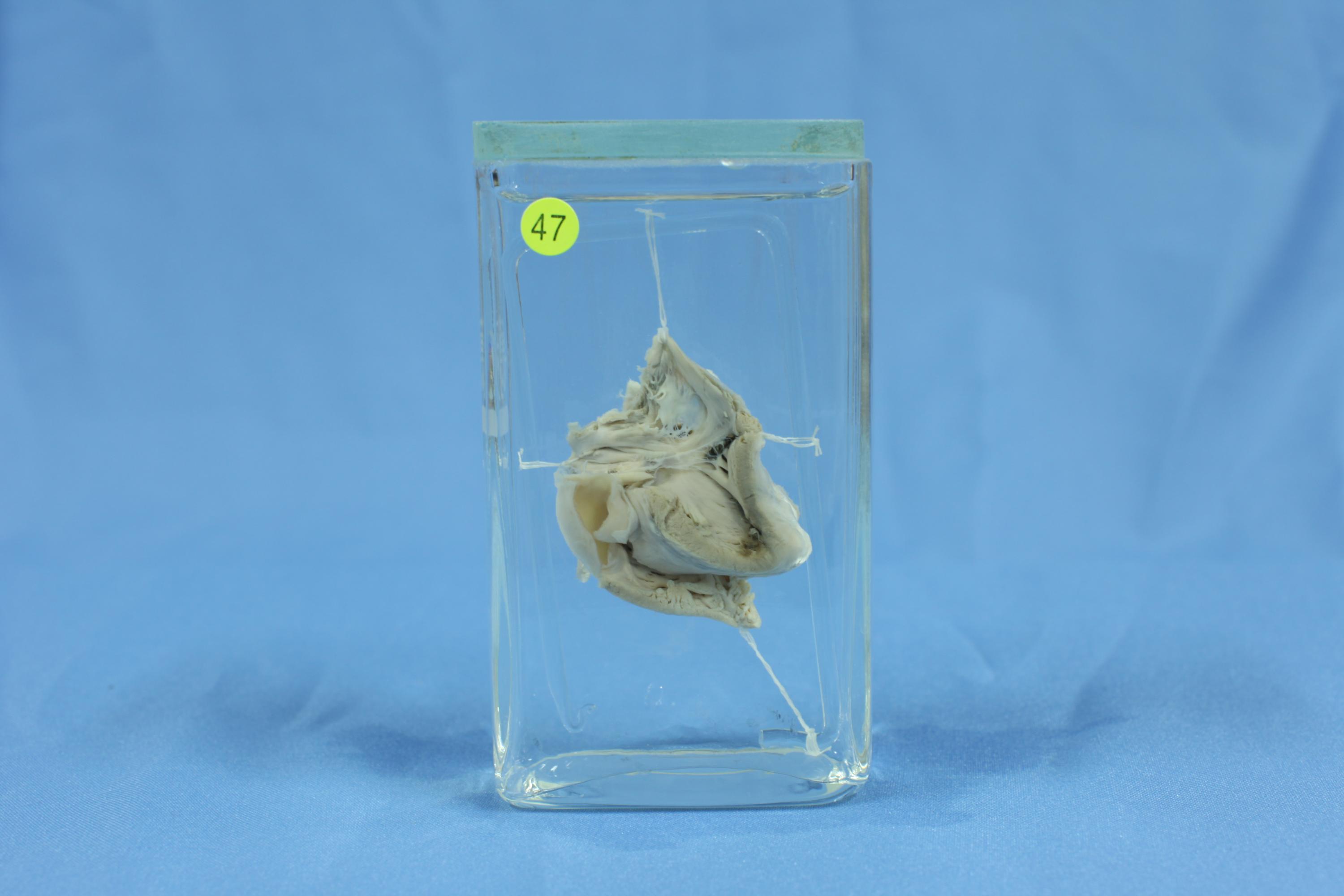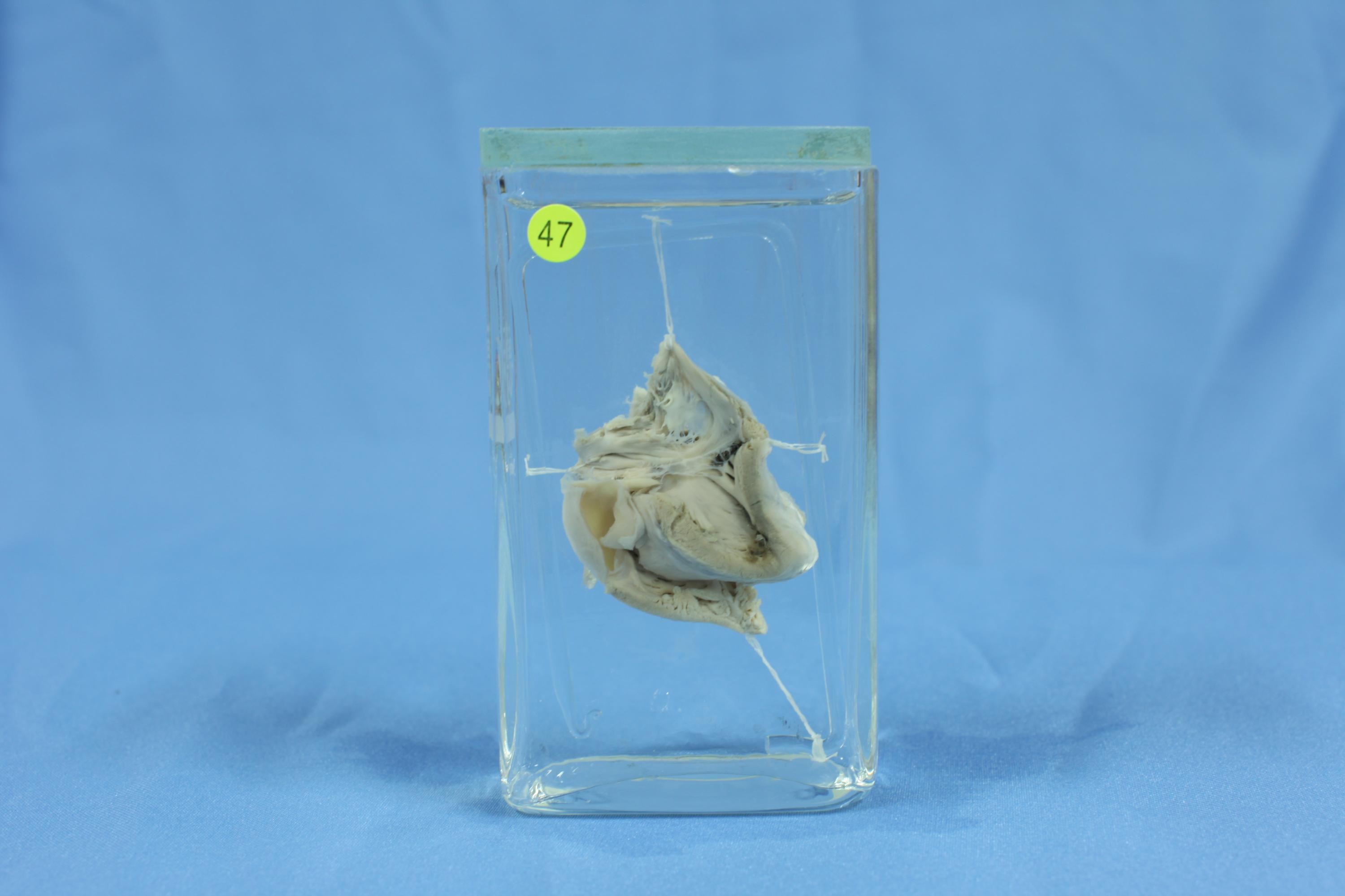 小儿心脏,从左心观察,可见左心房房间隔有一卵圆形的空洞,里面覆盖一薄层多孔的半透明的薄膜结构,从右心房一侧也能观察到呈筛孔状未闭的卵圆孔。