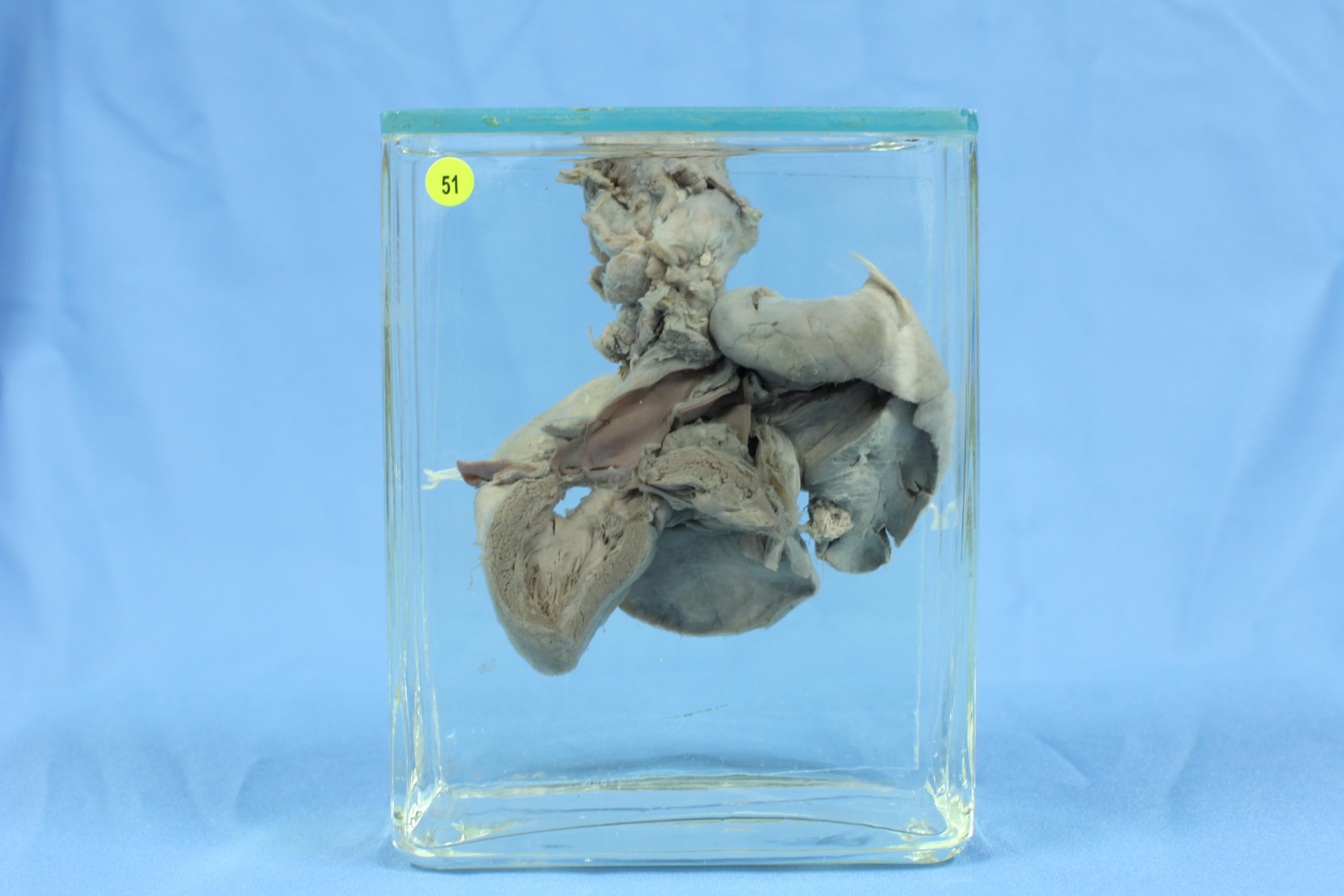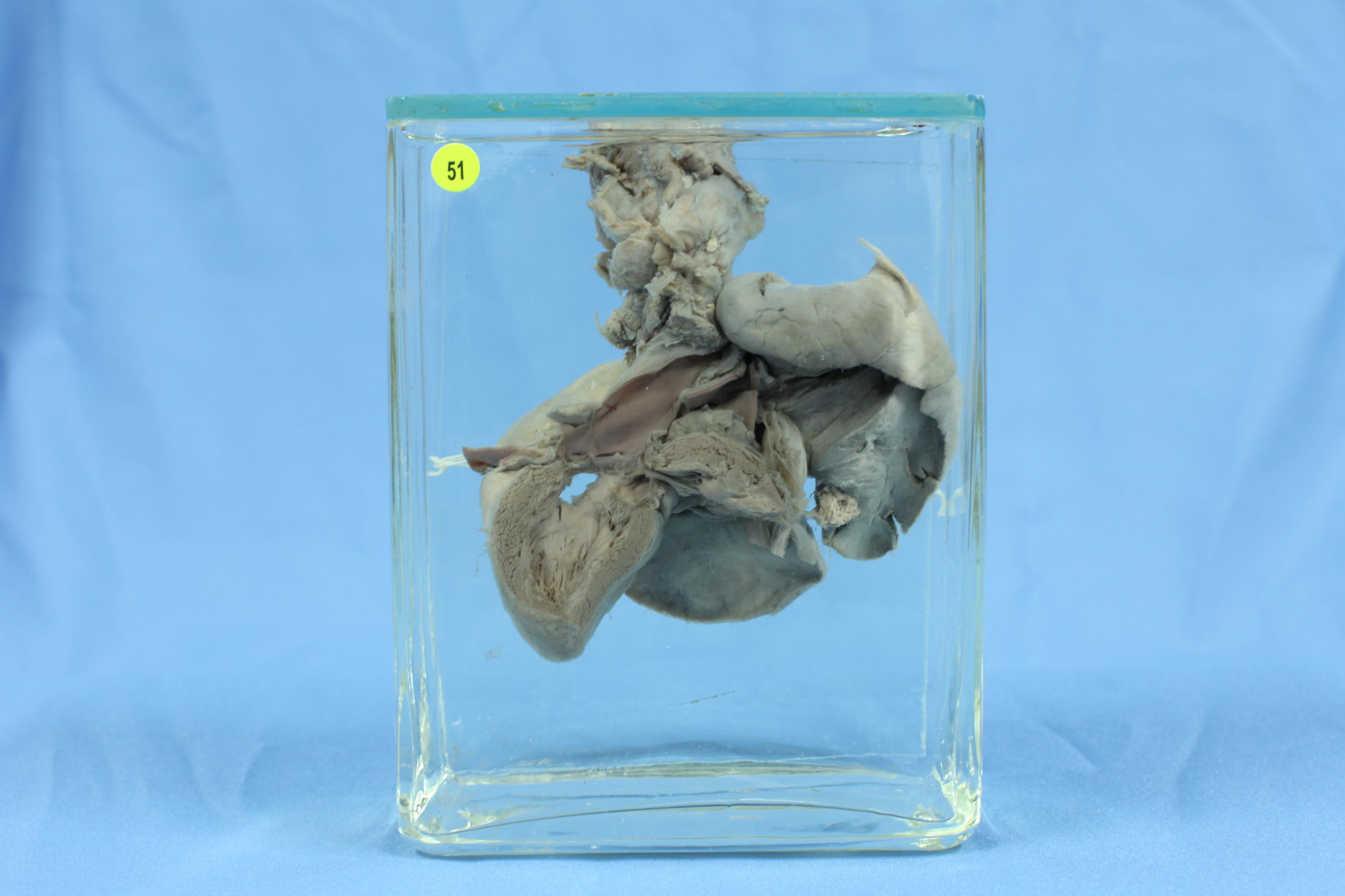 小儿心脏, 右心室打开, 室间隔上方有一个不规则圆形缺损的小孔。