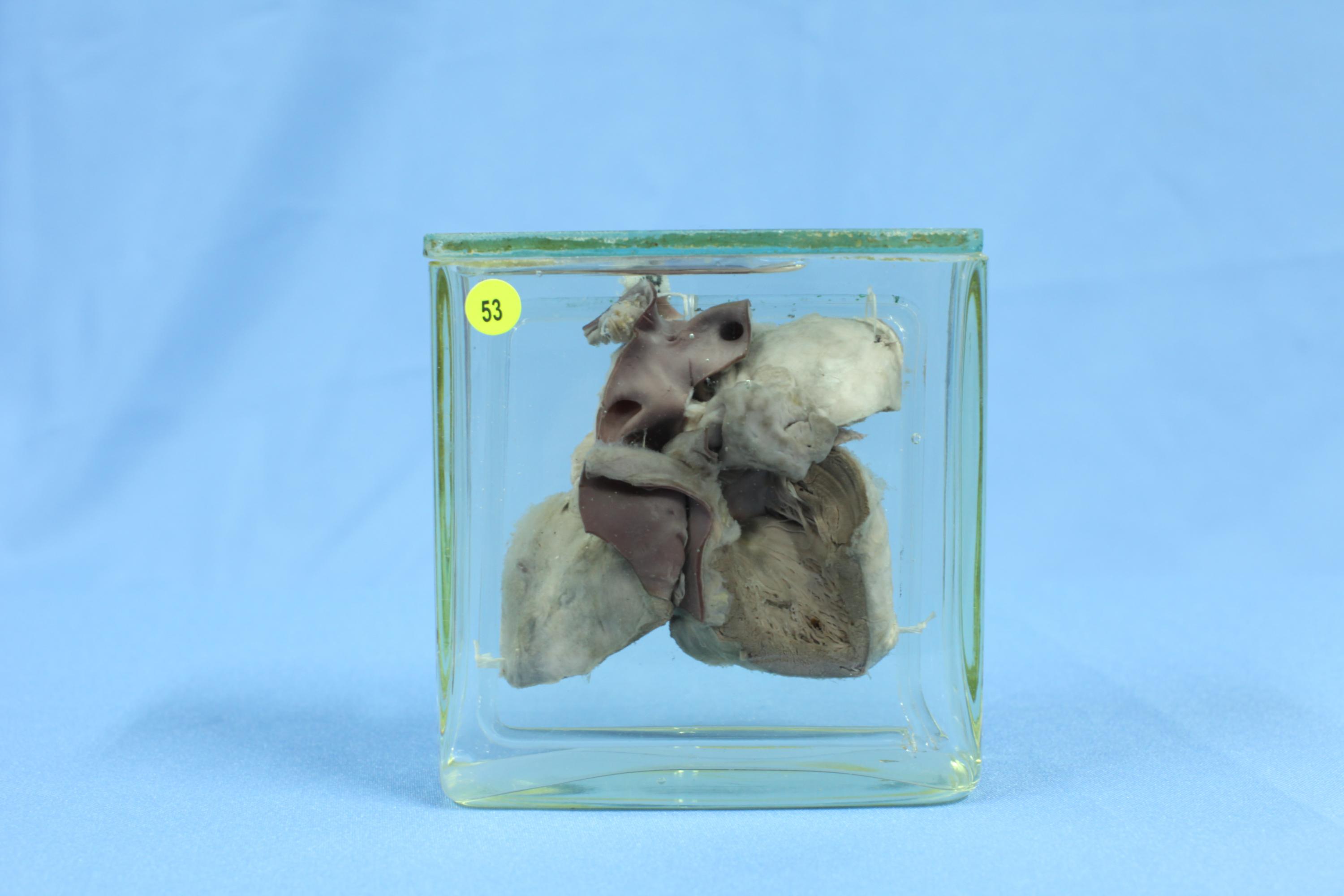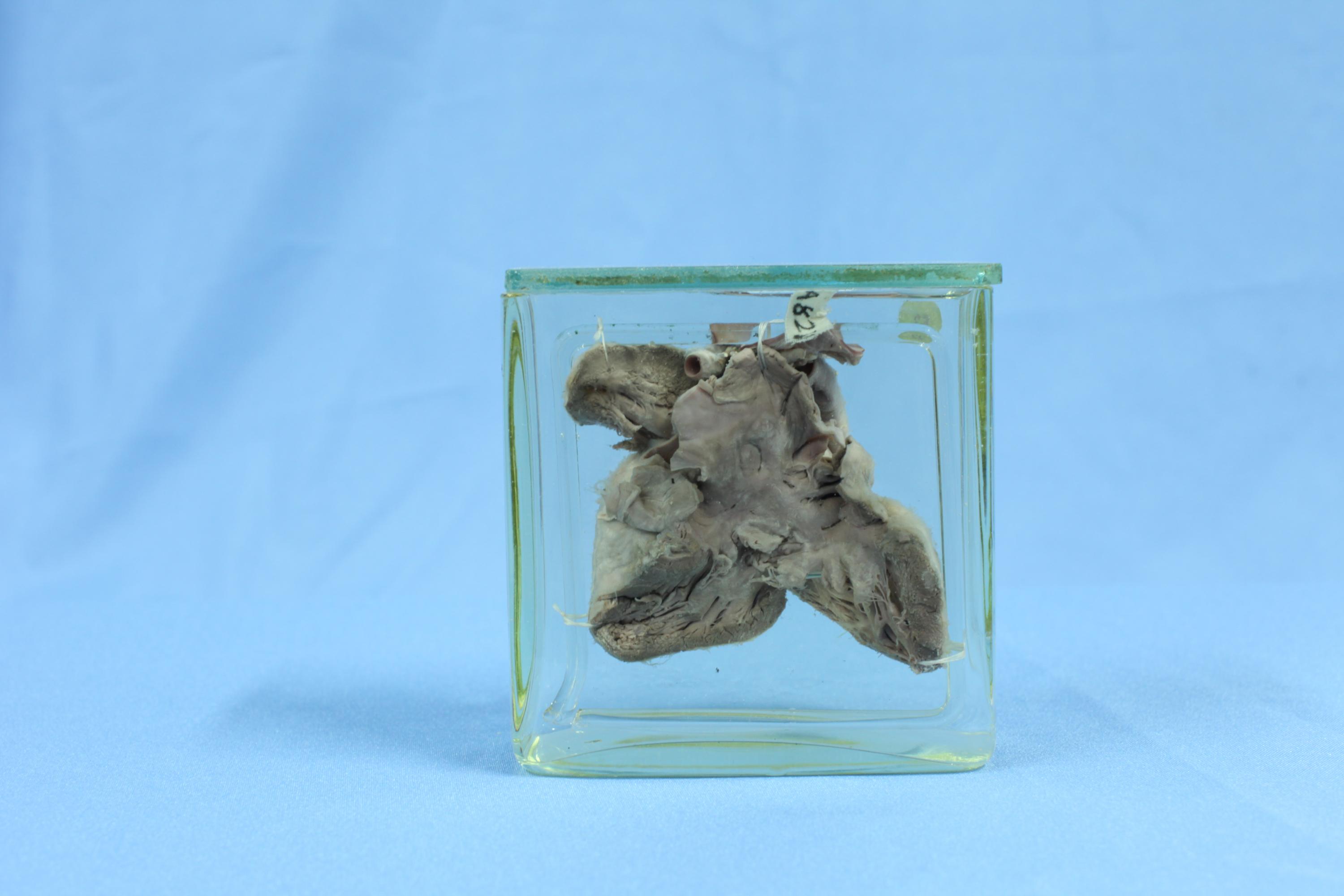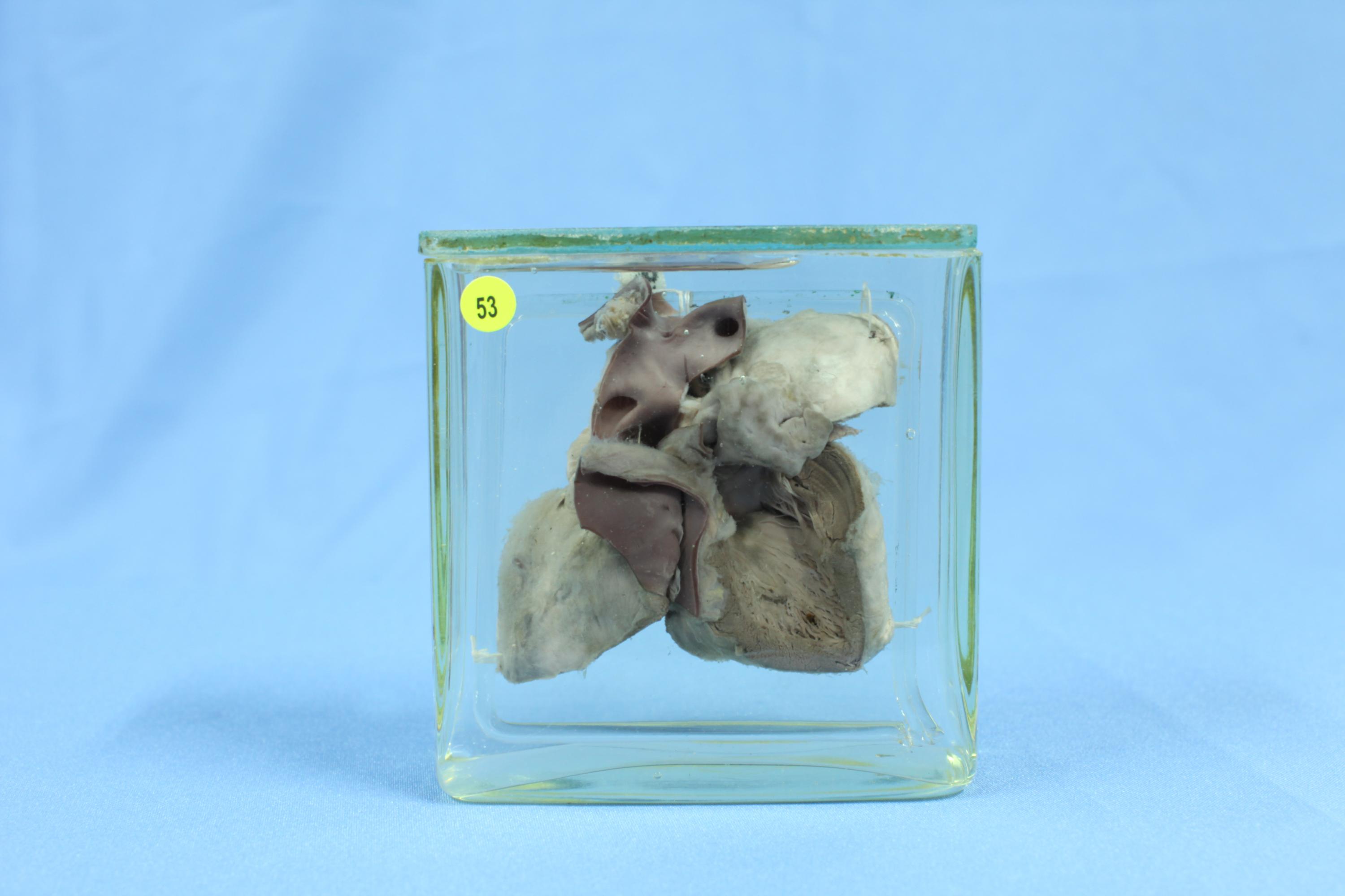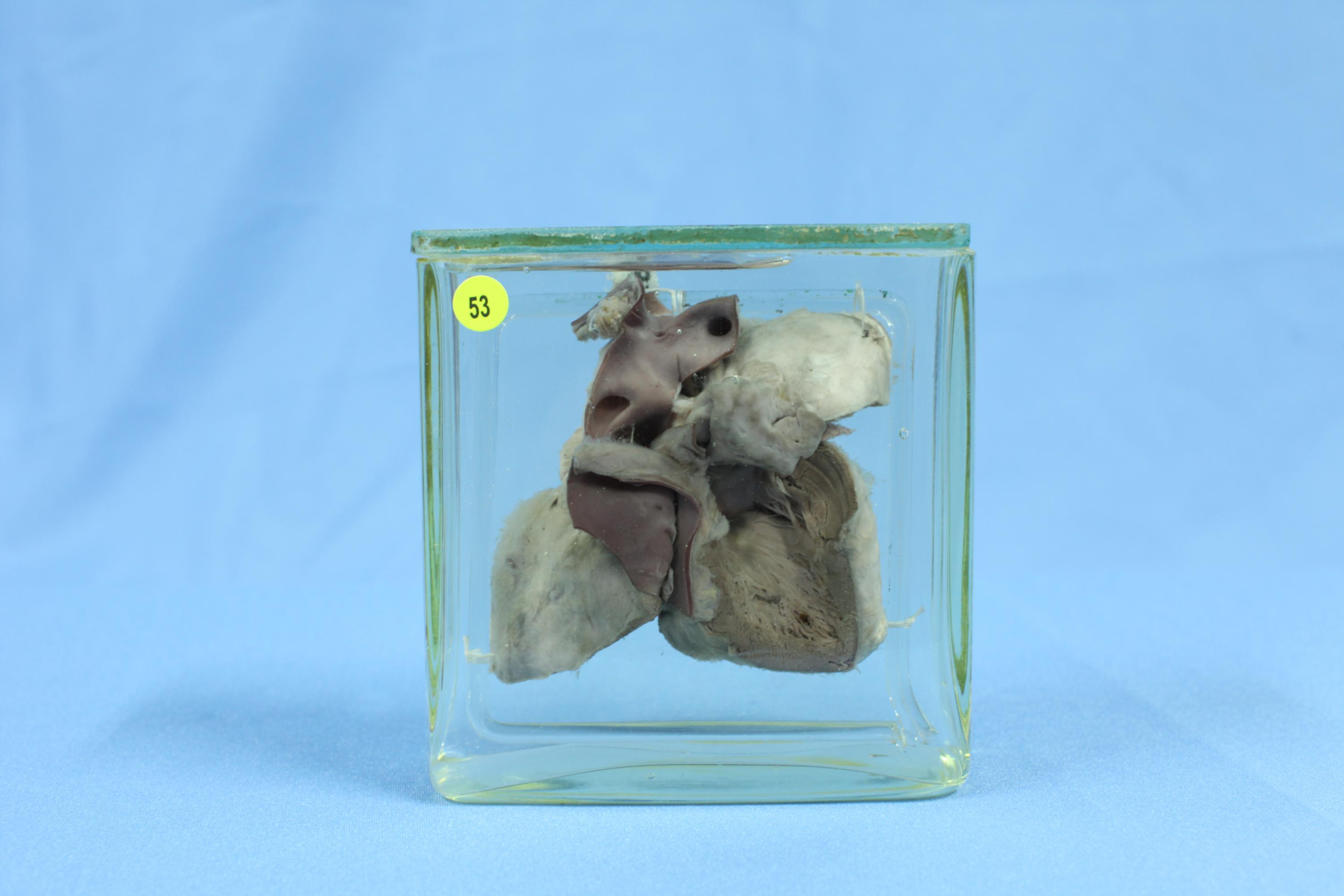 左心已打开,见左心室左侧室间隔膜部有一个不规则的小孔。