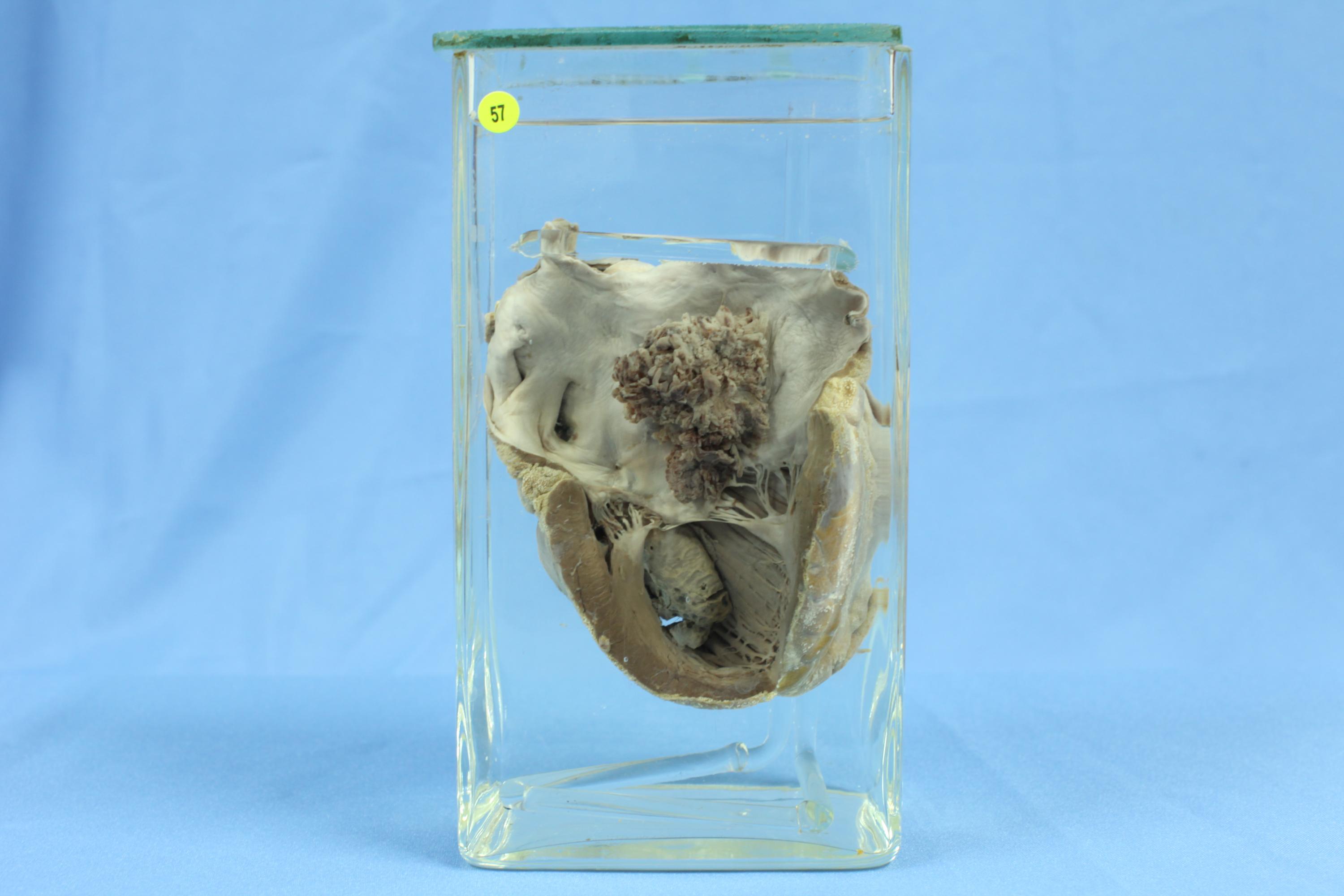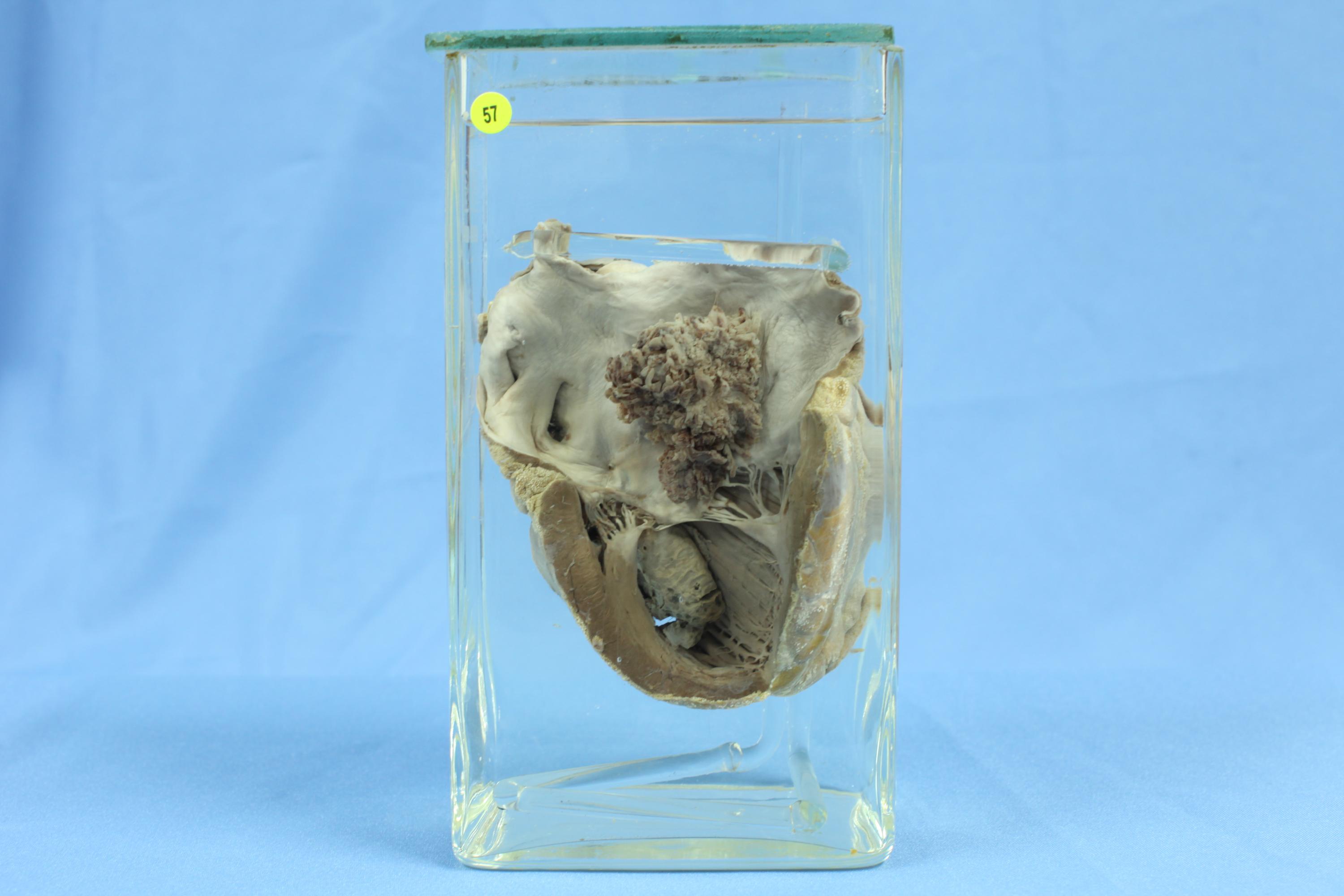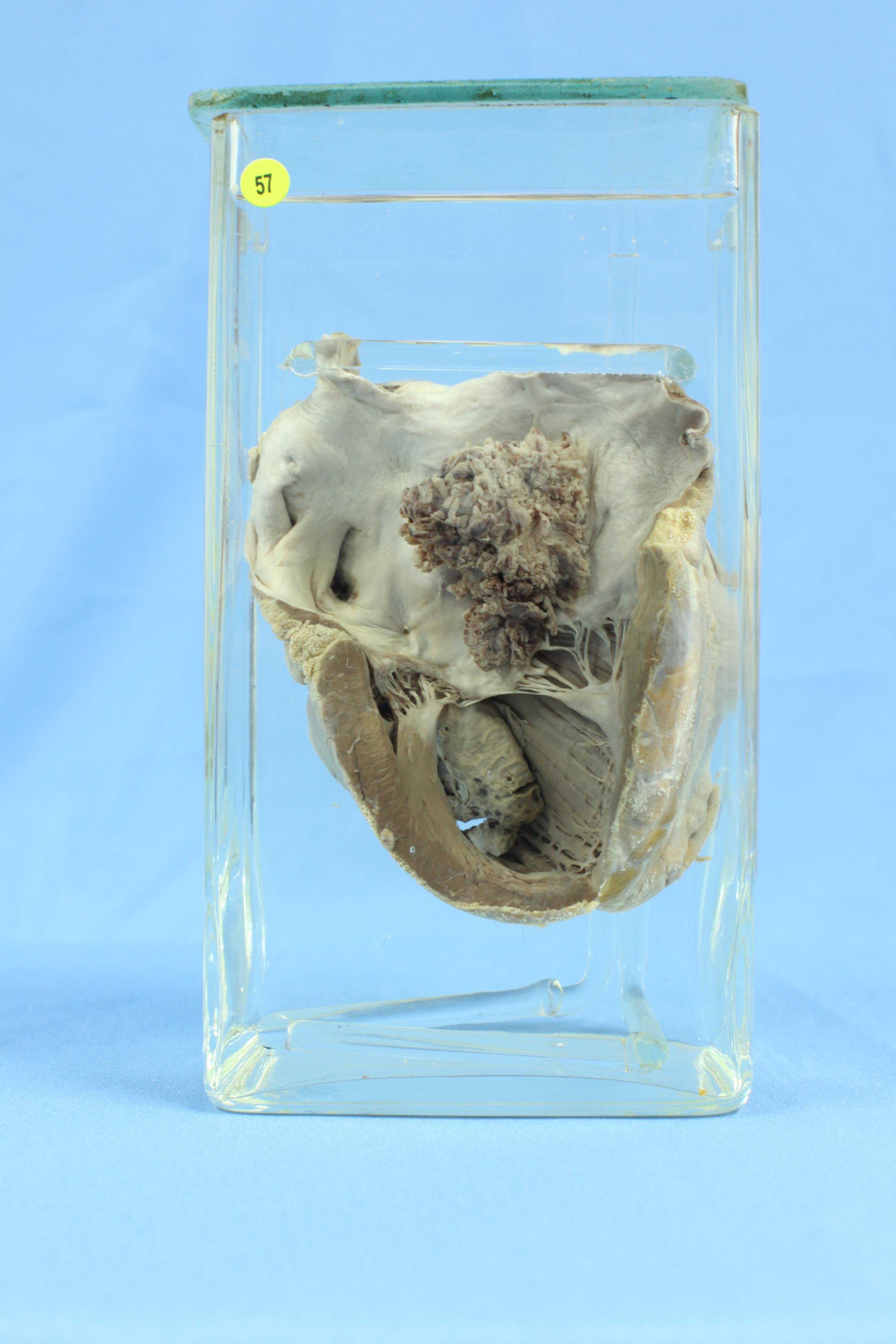 患者女性,52岁,心、脑粘液瘤病史. 标本左心腔打开,左心房扩张,二尖瓣上方左心房后壁内膜上见黏附有一个类圆形肿块,灰红色,表面粗糙,多细小突起似菜花样。