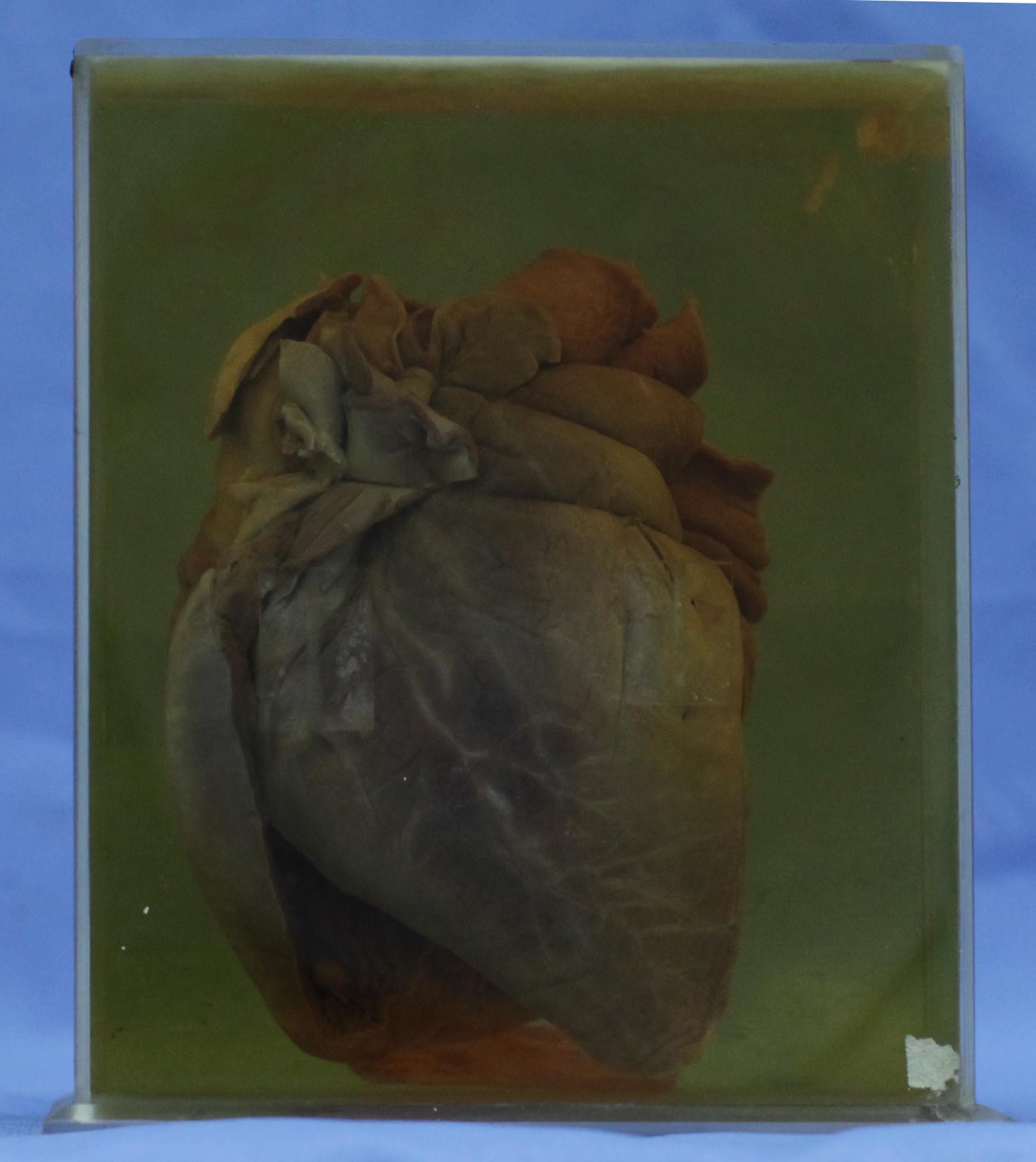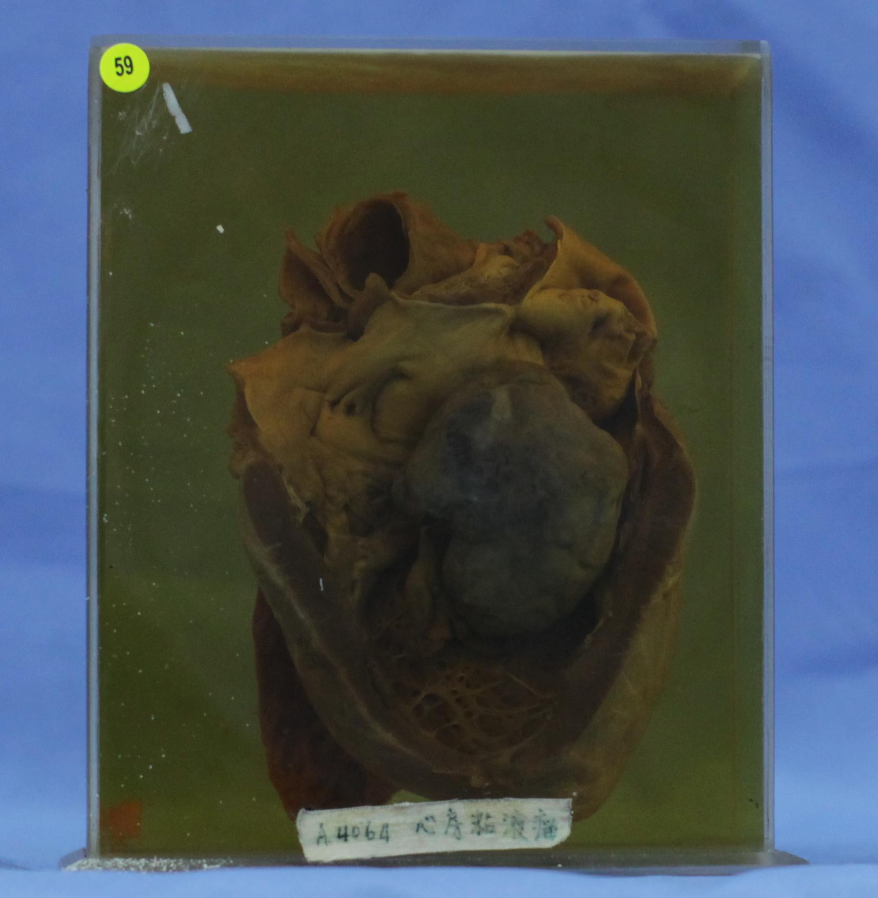 患者女性,45岁,左心房粘液瘤伴心包炎. 标本左心腔打开,左心房扩张,左心房后壁内膜上见长出并下垂一个鸽蛋大圆形肿块,灰褐色,边缘尚光滑。
