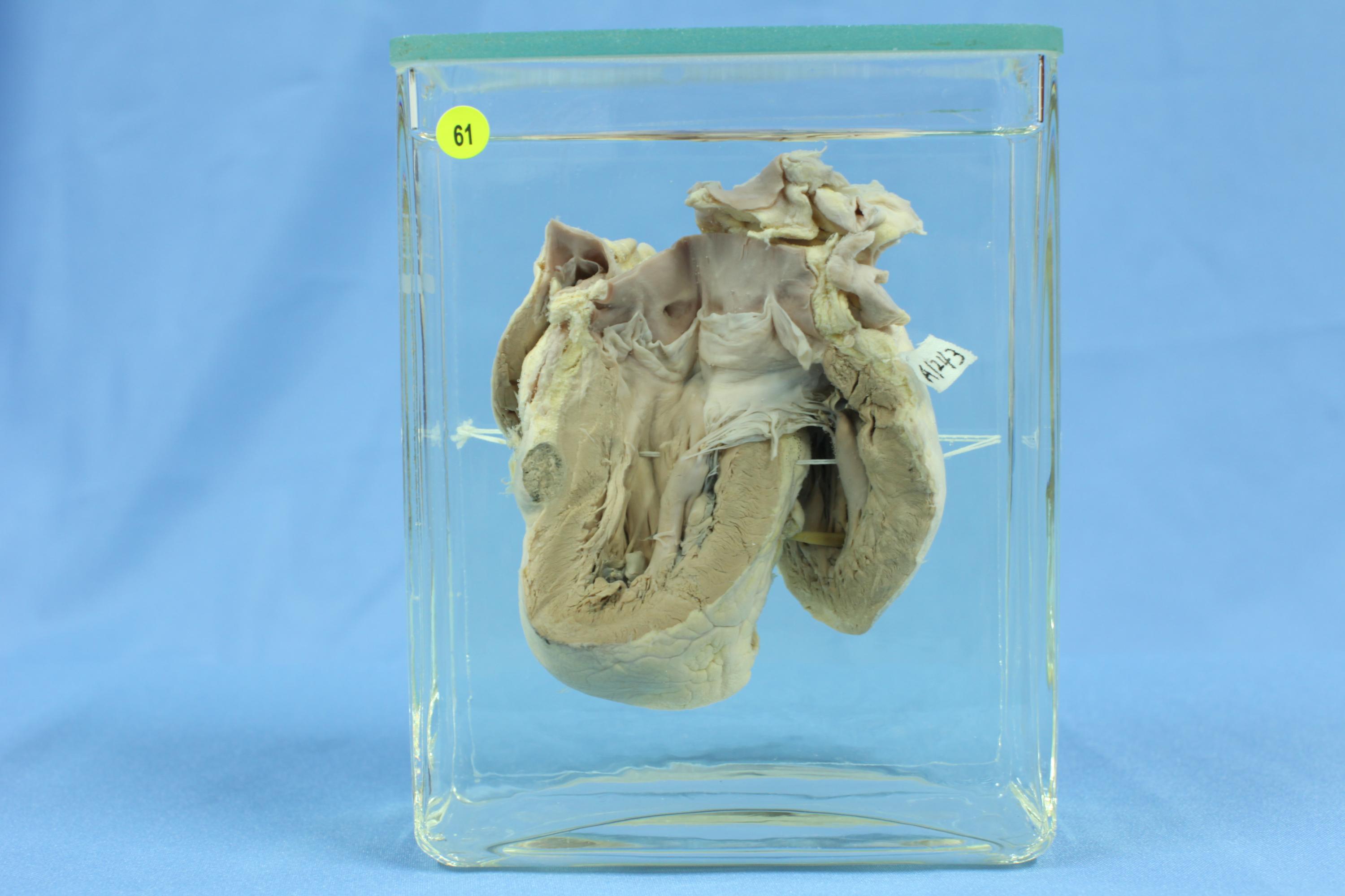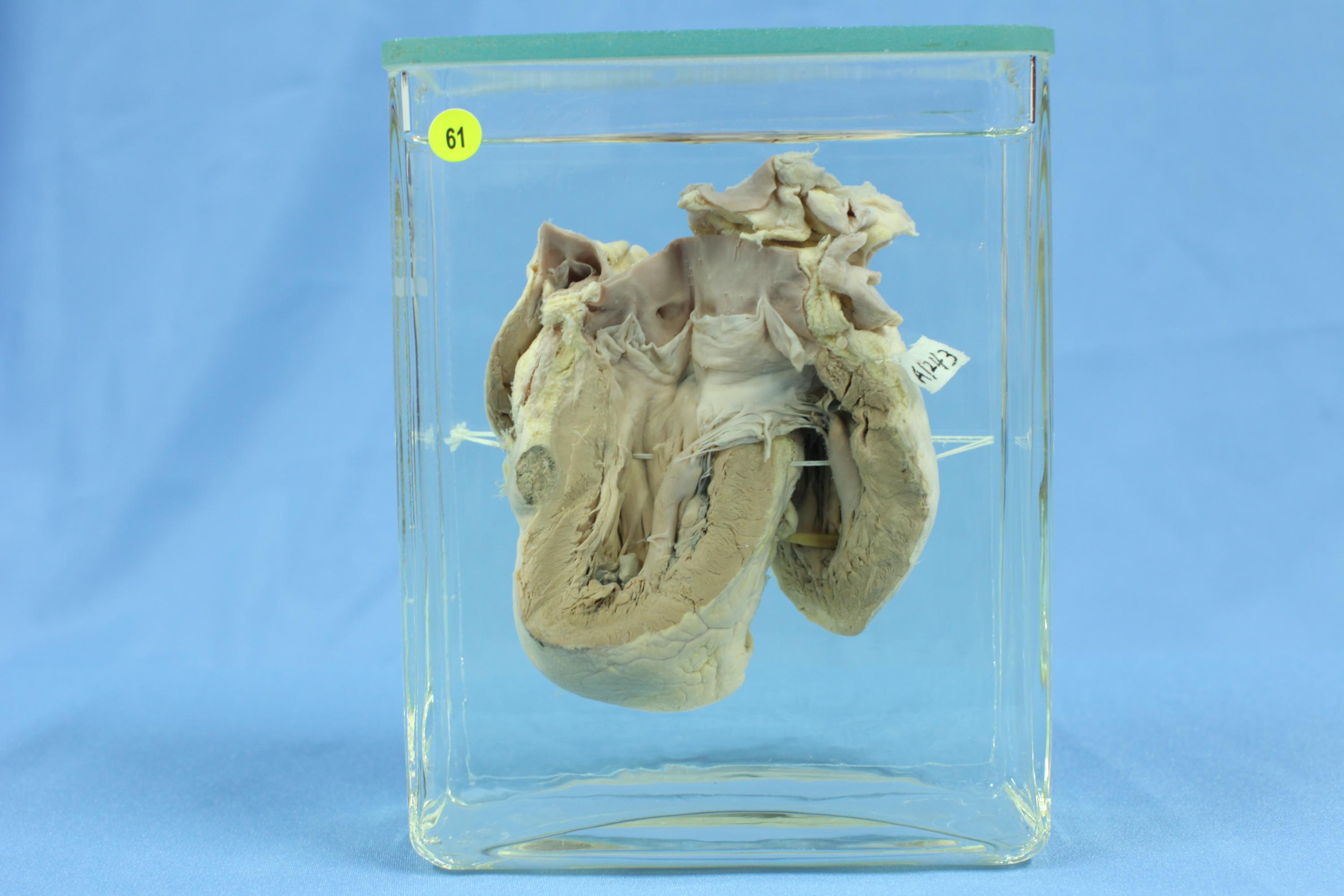 心脏右心已打开,见右心室扩张,室壁前壁见一直径1.5cm的灰白灰褐色肿块,周围界限不清。