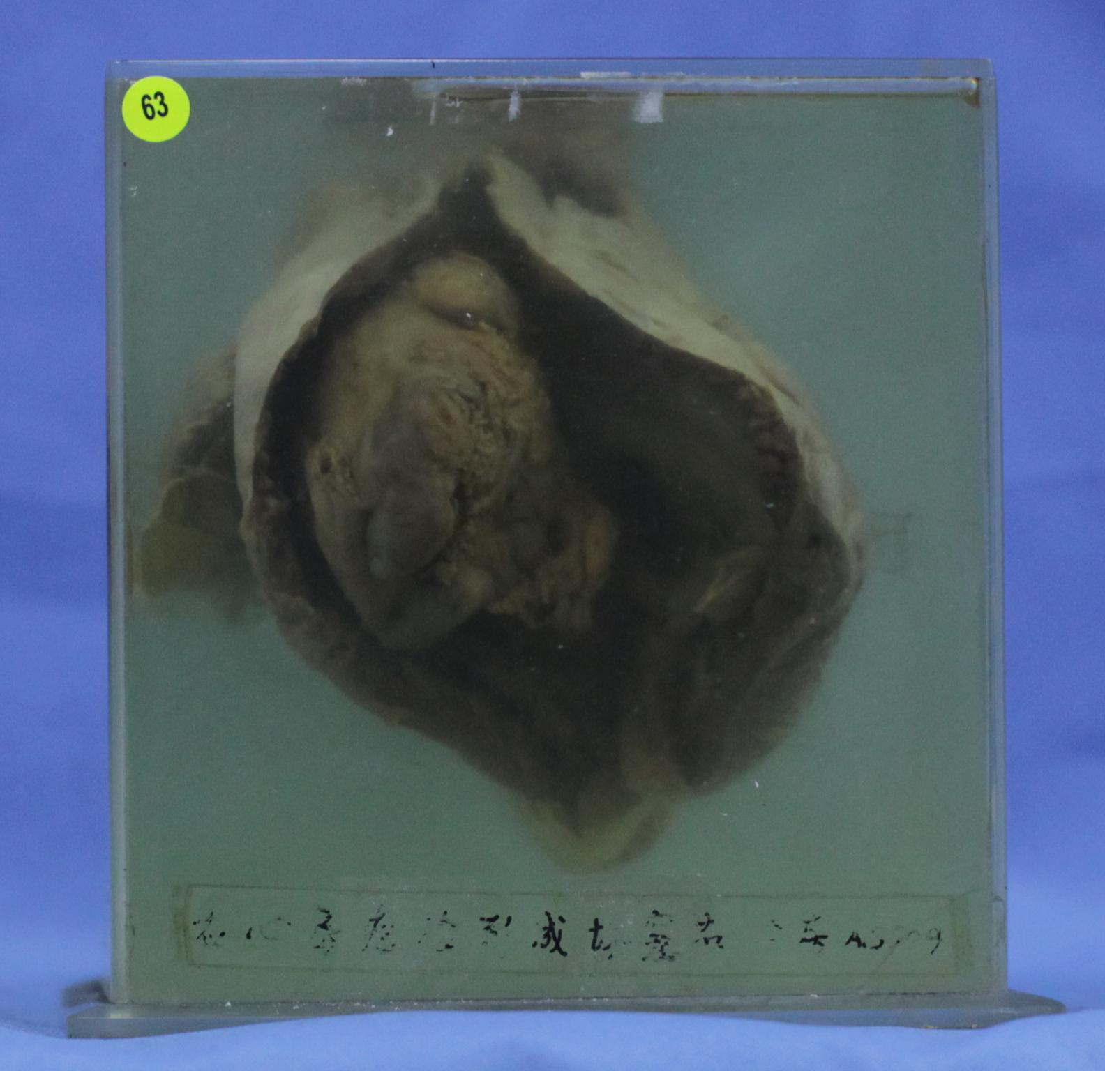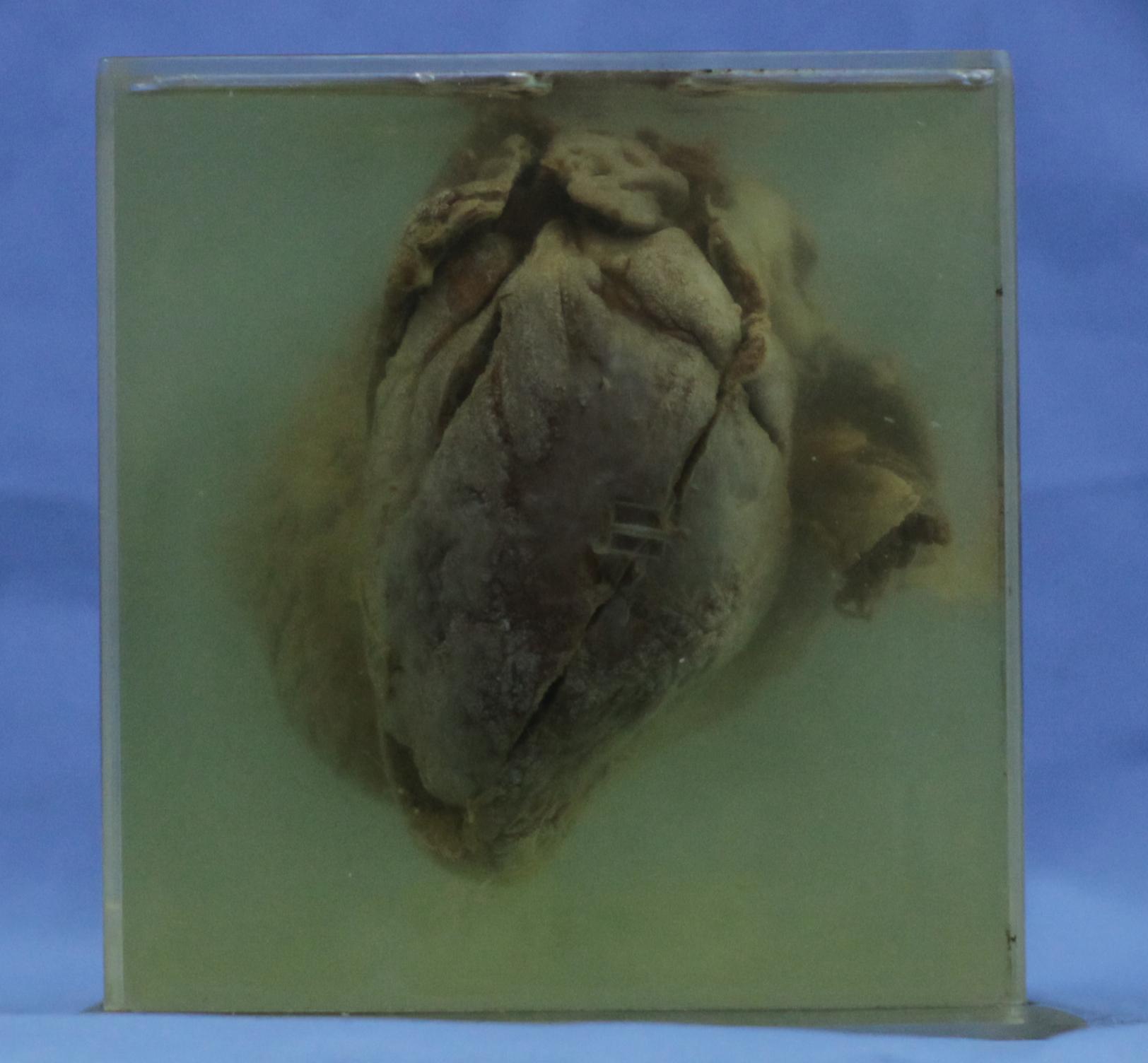 患者男性,33岁,肝硬化肝癌病史。 右心房明显扩张,内有一硕大的圆球状固体结构,色质为灰黄色间杂有浅褐色,粘附在三尖瓣心房面,堵塞了右心房流出道。