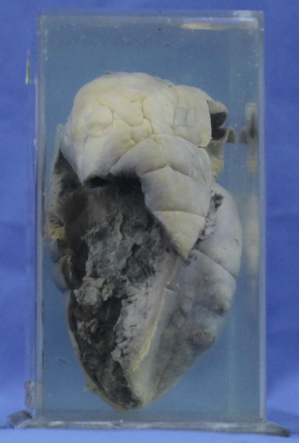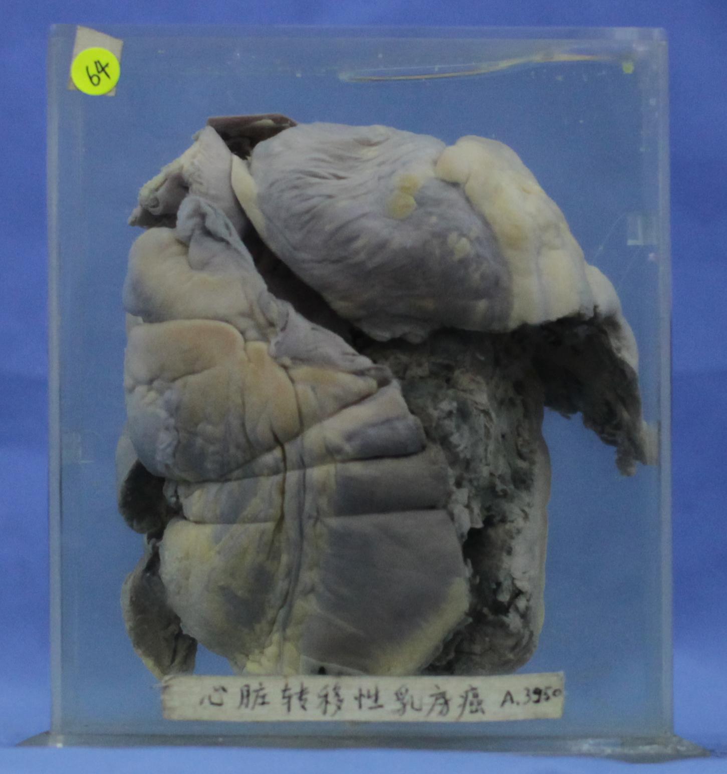 患者女性,56岁,左乳腺癌手术后,心力衰竭。 心脏右心已打开,见右心室扩张,室壁上有一巨大的不规则褐色肿块黏附,肿块根部已与心室壁心肌紧密融合及纤维化,形成灰白色致密组织。