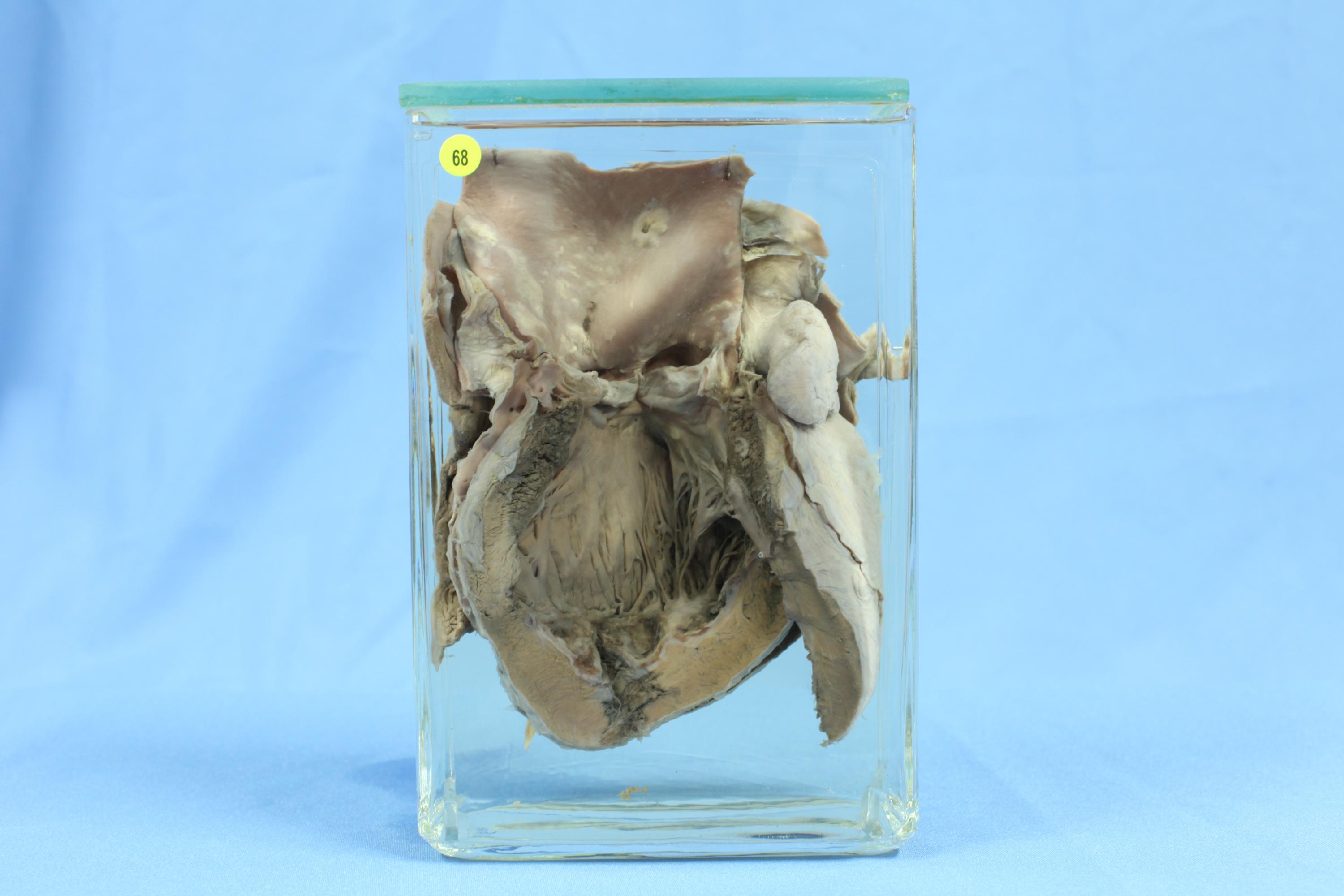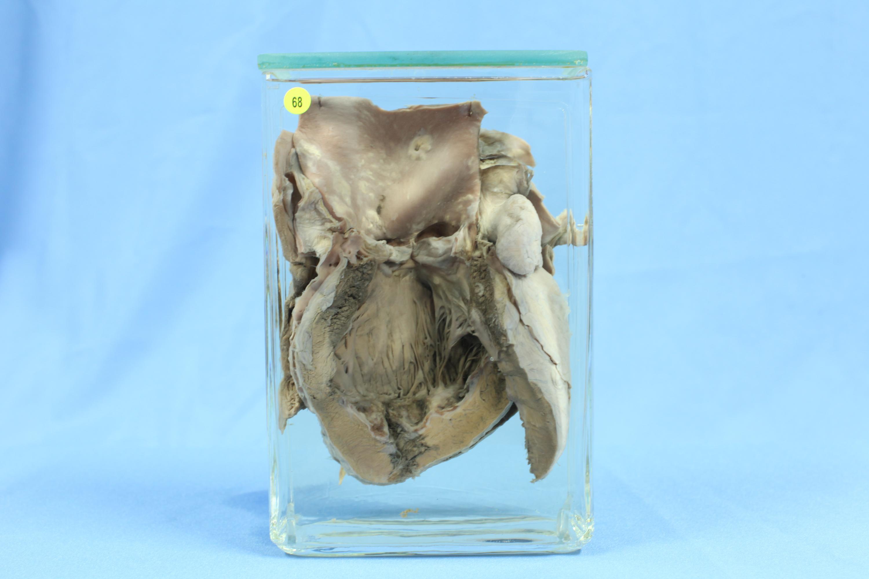 心脏标本,左心已打开。心内膜表面因弹力纤维增生增厚。左心肌轻度肥厚,心室扩大,呈球形。