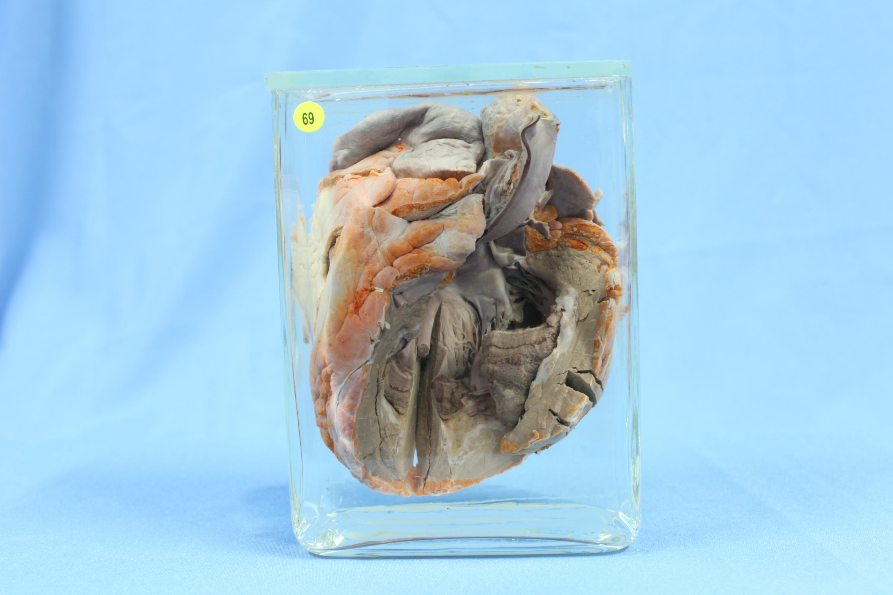 患者女性,39岁,心力衰竭. 心脏标本,左心已打开。见左心室肌显著肥厚,心室扩大,心尖圆钝,心脏如球状。心外膜脂肪因氧化而呈红色,心内膜表面因弹力纤维增生增厚。部分内膜呈乳白色。同时,心室内壁中央可见有一个灰褐色附壁血栓形成,向腔内略隆起。