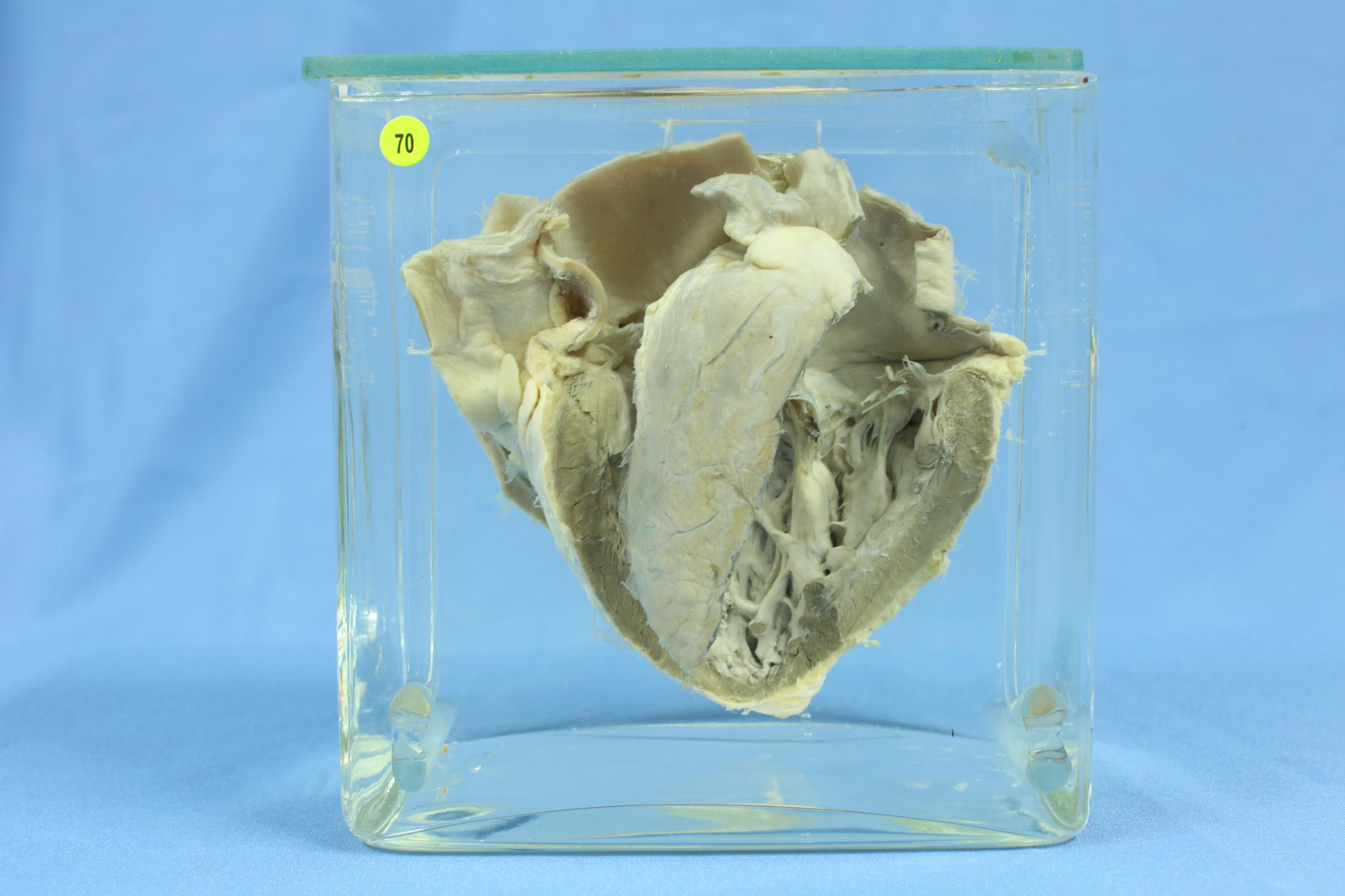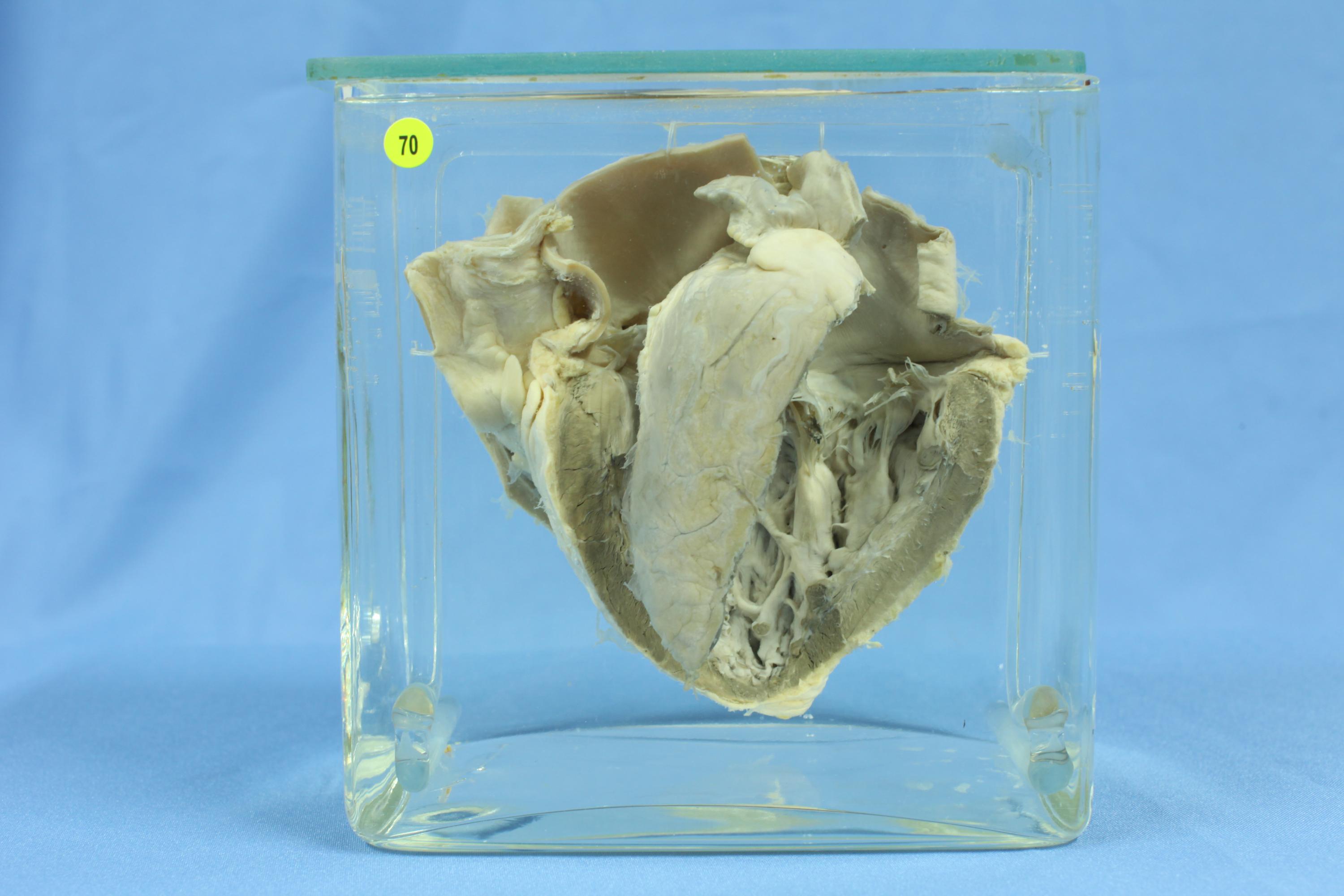 患者男性,57岁, 心力衰竭. 心脏标本,左心已打开。见心内膜表面因弹力纤维增生增厚。左心肌轻度肥厚,心室扩大,乳头肌增粗。