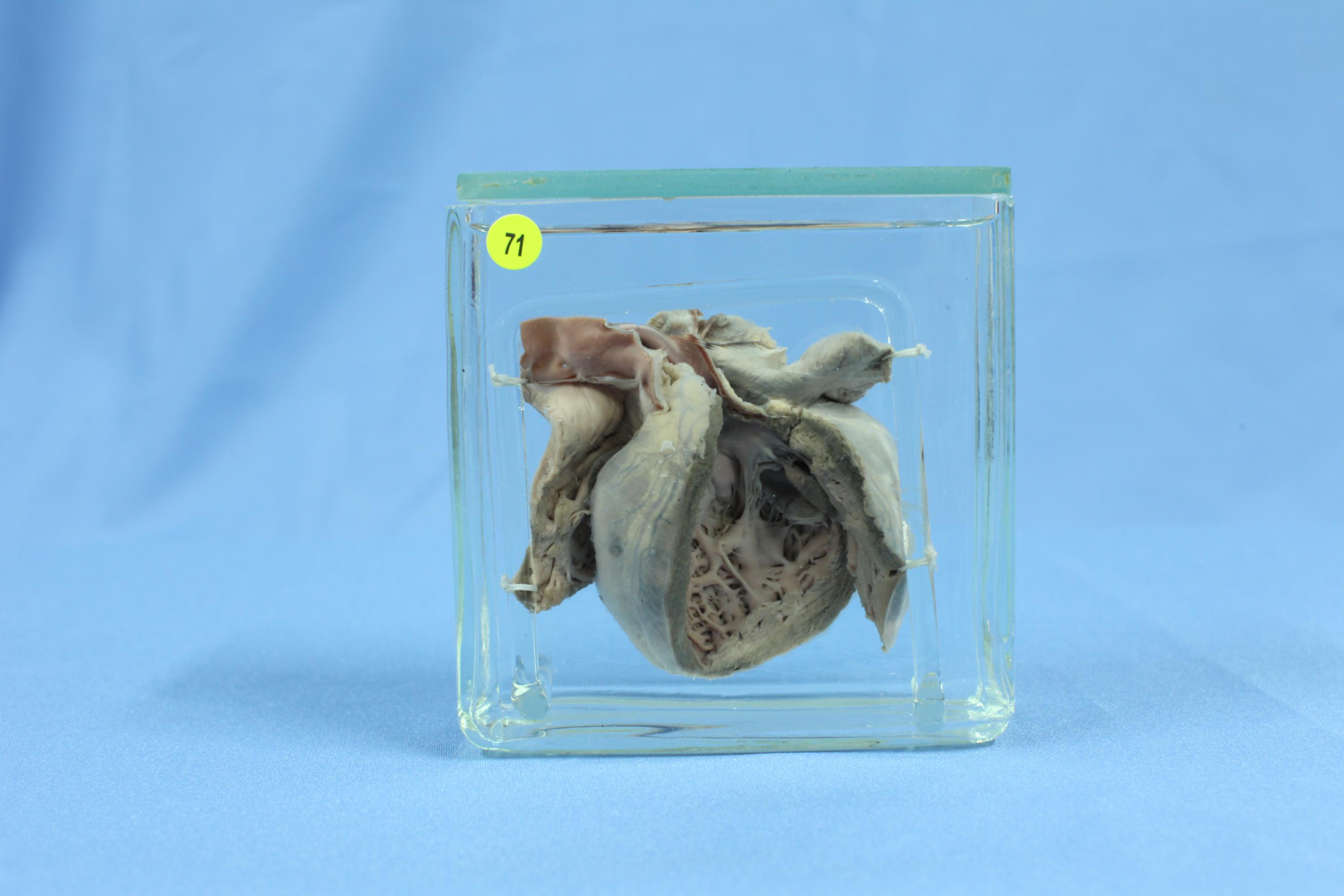 患者男孩, 年龄6个月. 肠梗阻病史. 心脏标本,左心已打开。见左心肌肥厚,心室显著扩大,心尖圆钝,心脏如球状。心内膜表面因弹力纤维增生增厚。