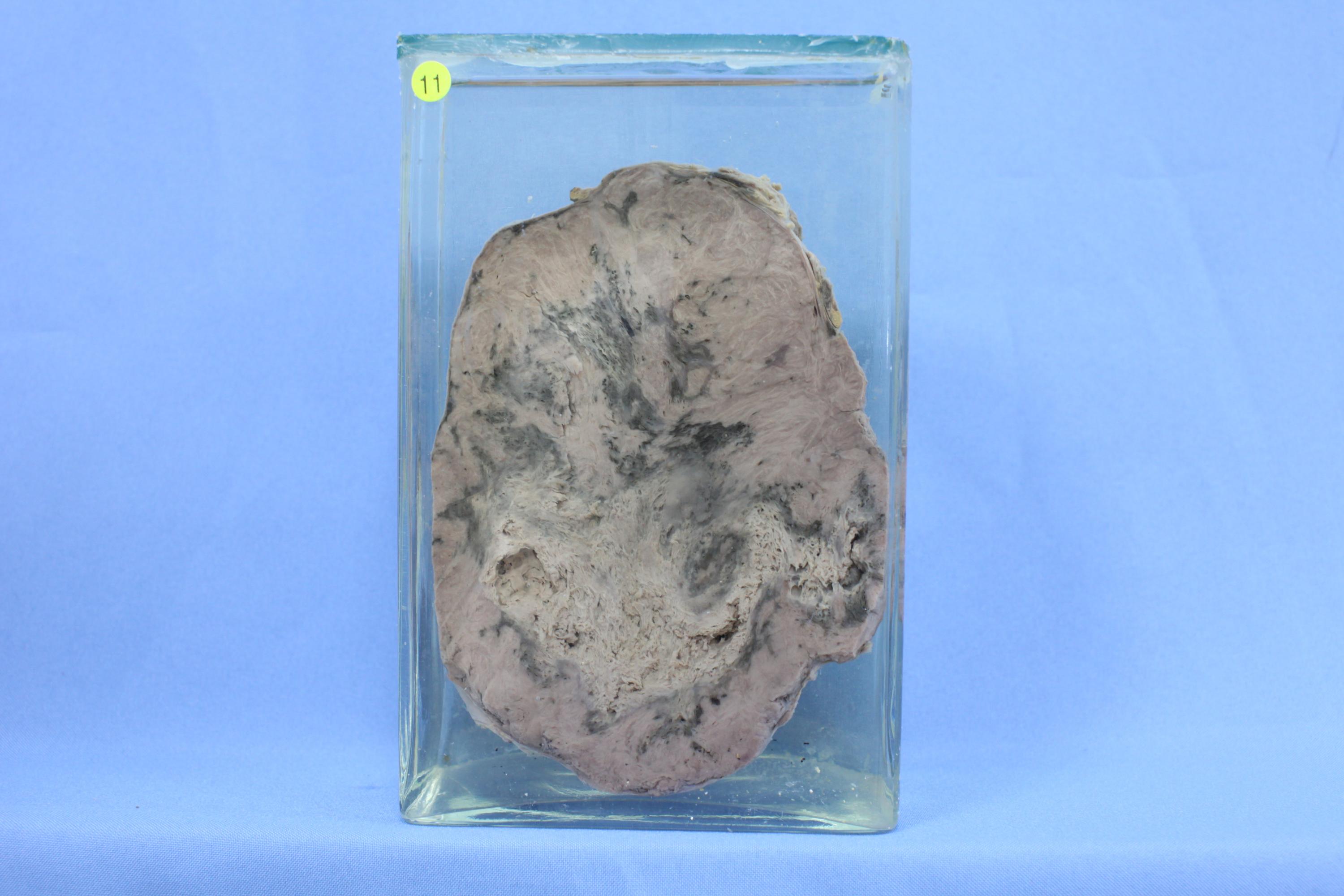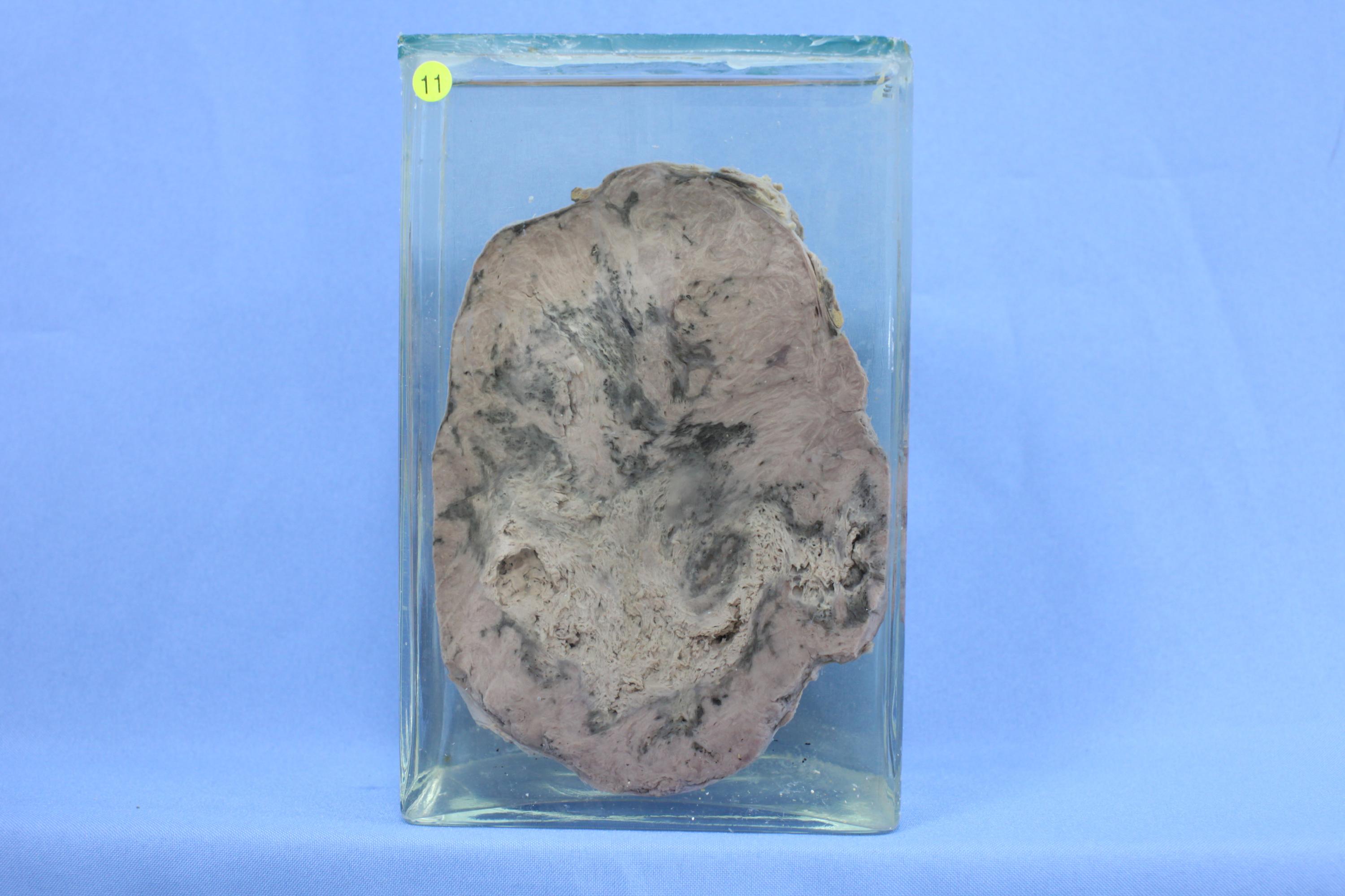 巨大结节状肿块一枚,直径约24厘米,部分有包膜;切面灰白暗红色,伴出血坏死,质软;镜下为起源于平滑肌的恶性肿瘤。