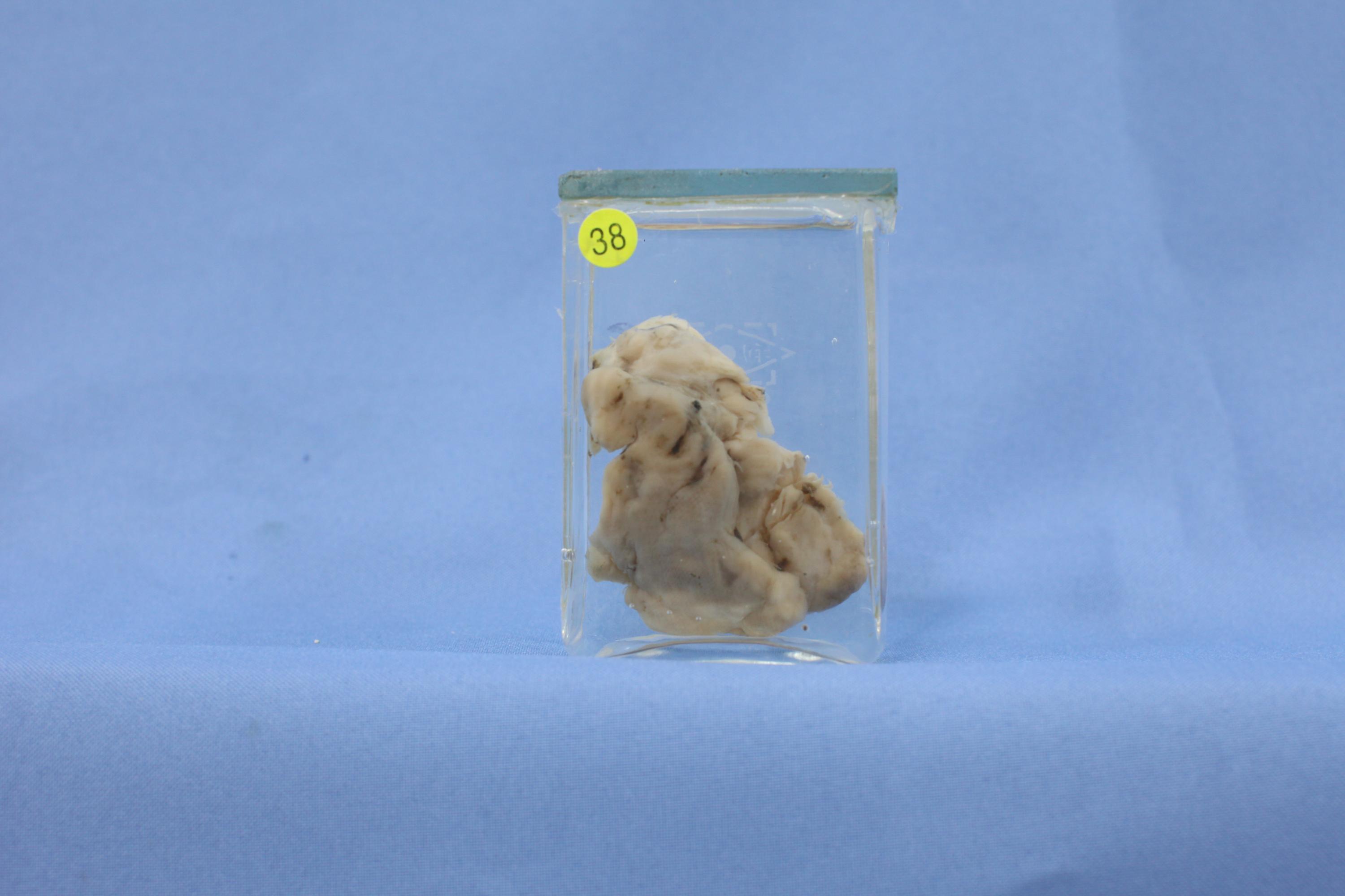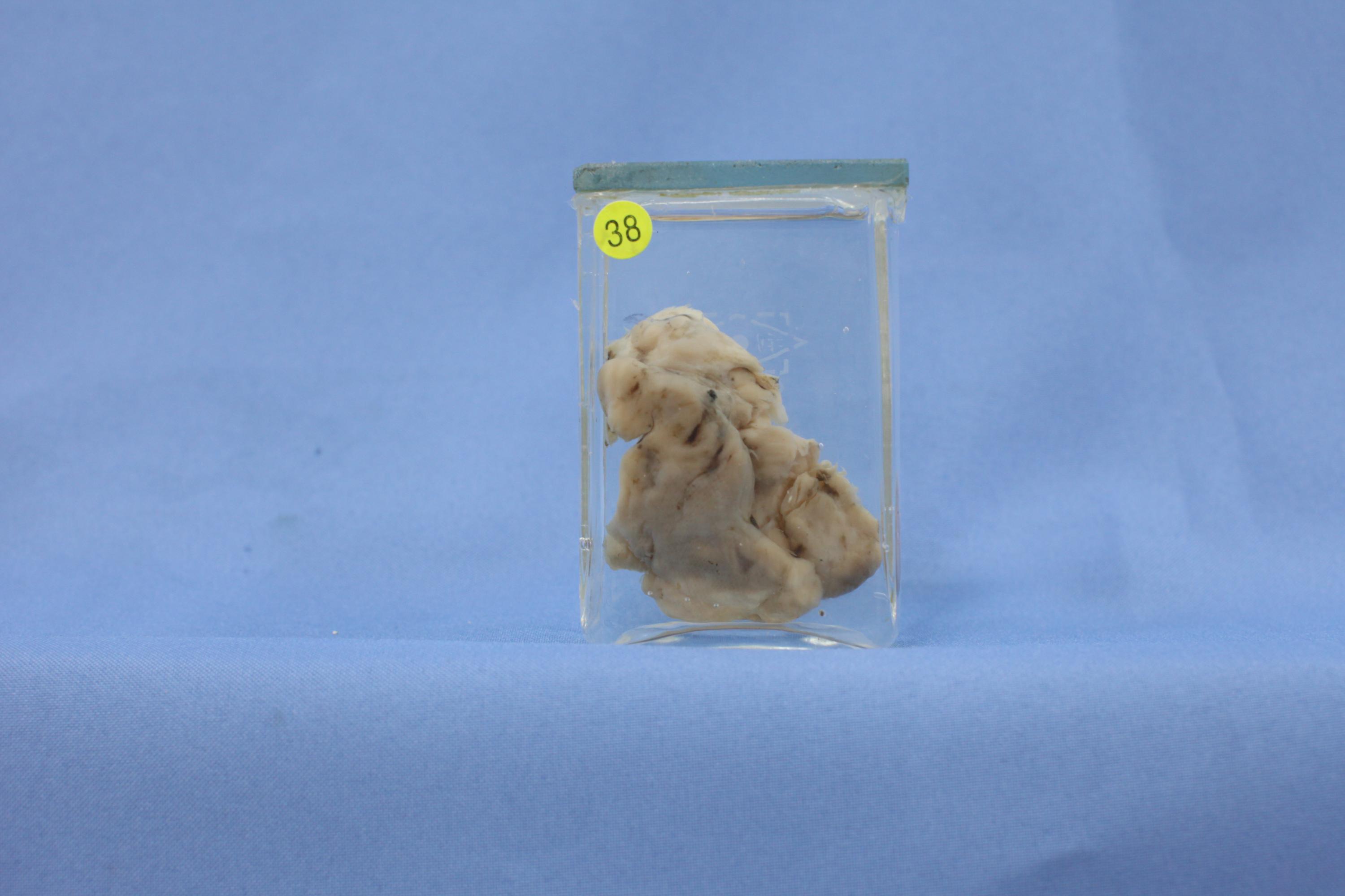 灰白色肿块一个,大小约7×5×5厘米,结节状,部分有包膜;镜下为起源于间皮组织的肿瘤。