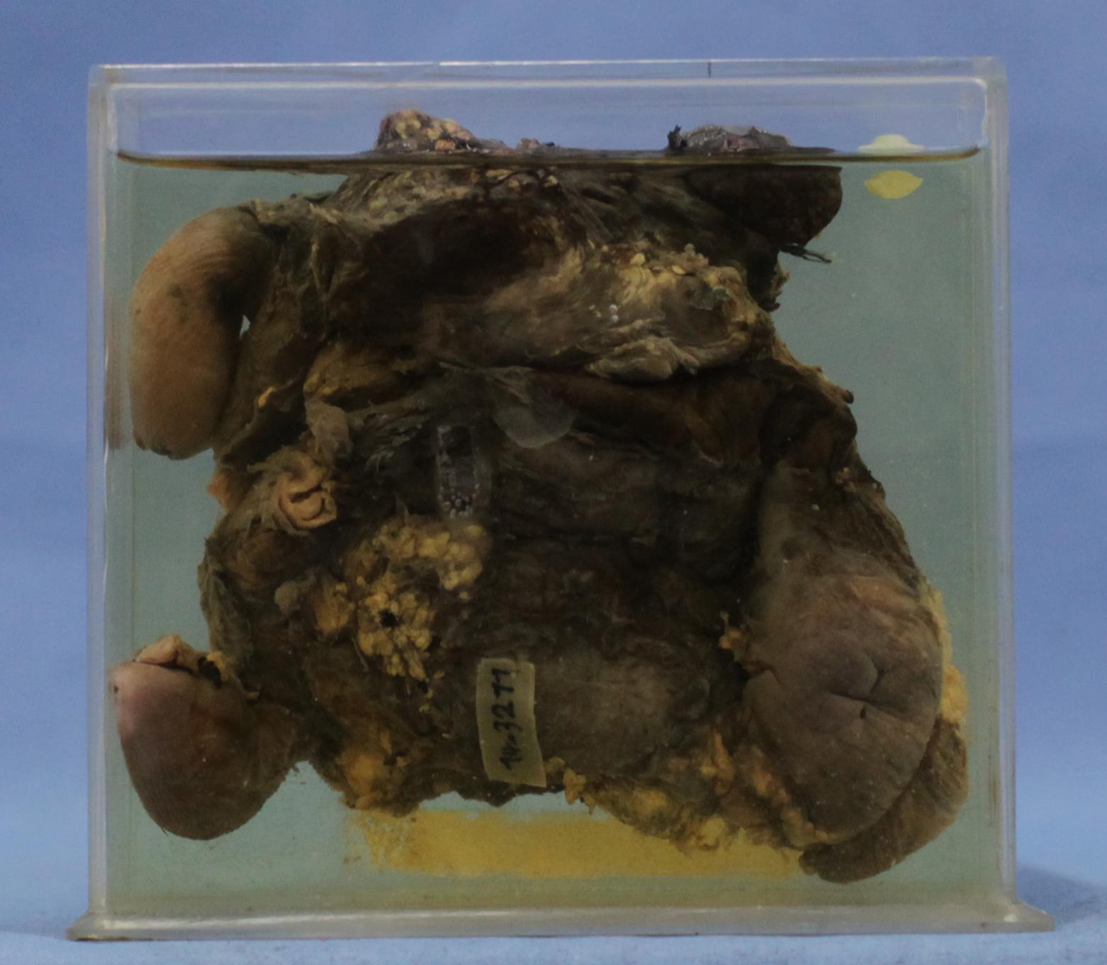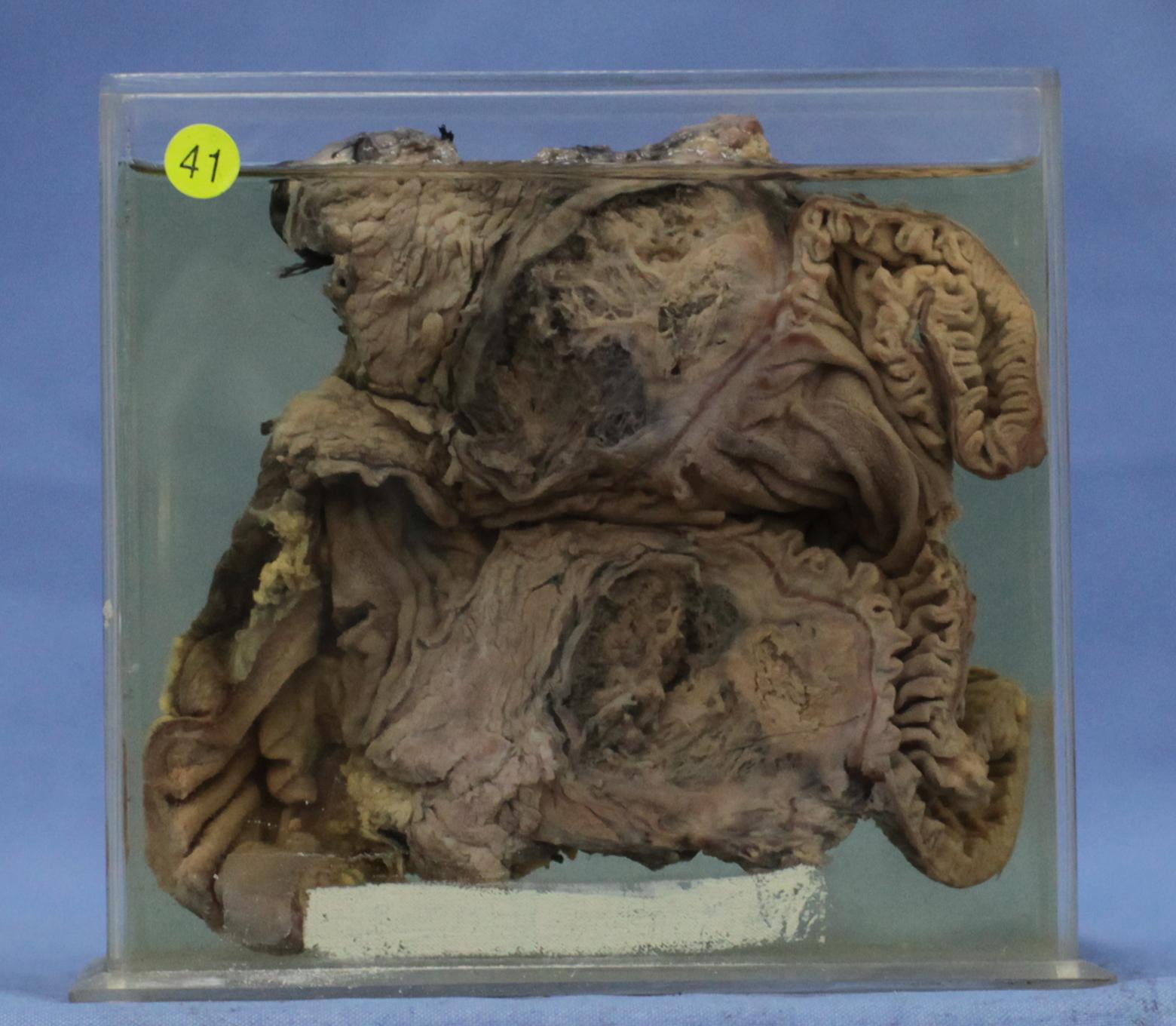 肠系膜上见暗红色结节,直径约7厘米,无包膜,境界不清,局部侵犯肠壁;镜下为起源于间皮组织的恶性肿瘤,细胞分化差,异型性明显。