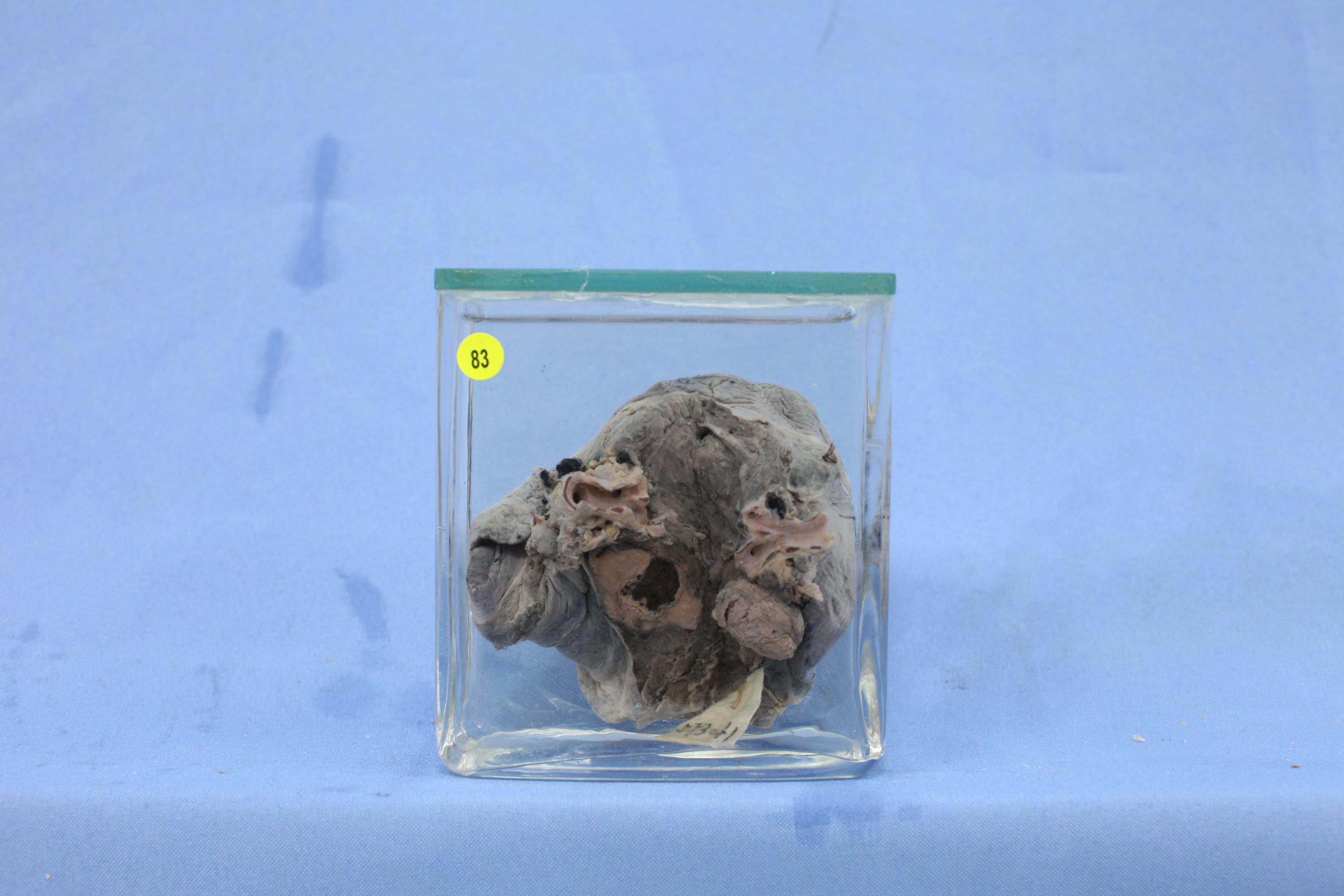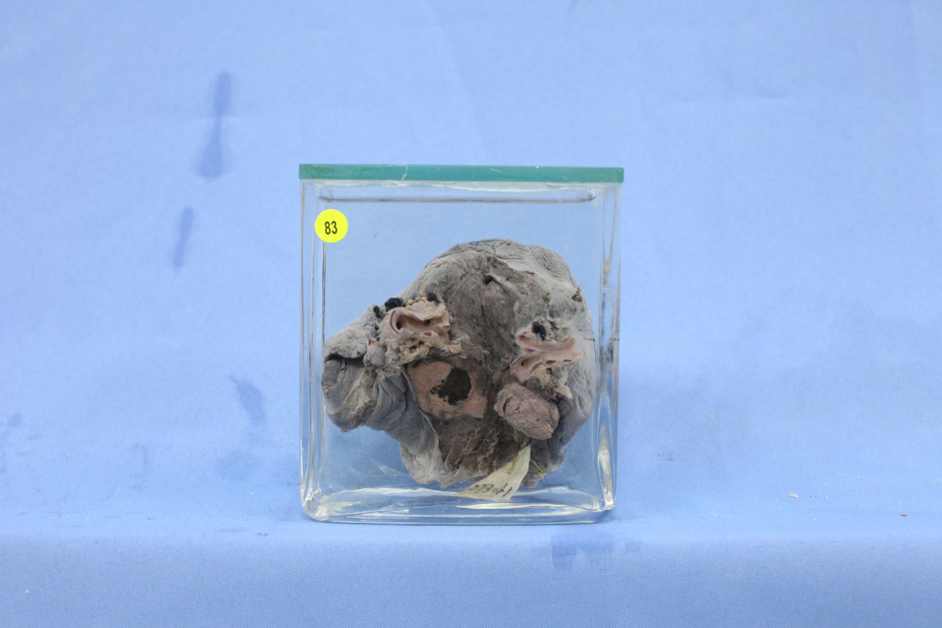 支气管旁肺组织内可见一灰白色肿块,直径约2.5厘米,部分区域暗红色,境界清楚,有包膜;镜下为肺组织的炎性病变。