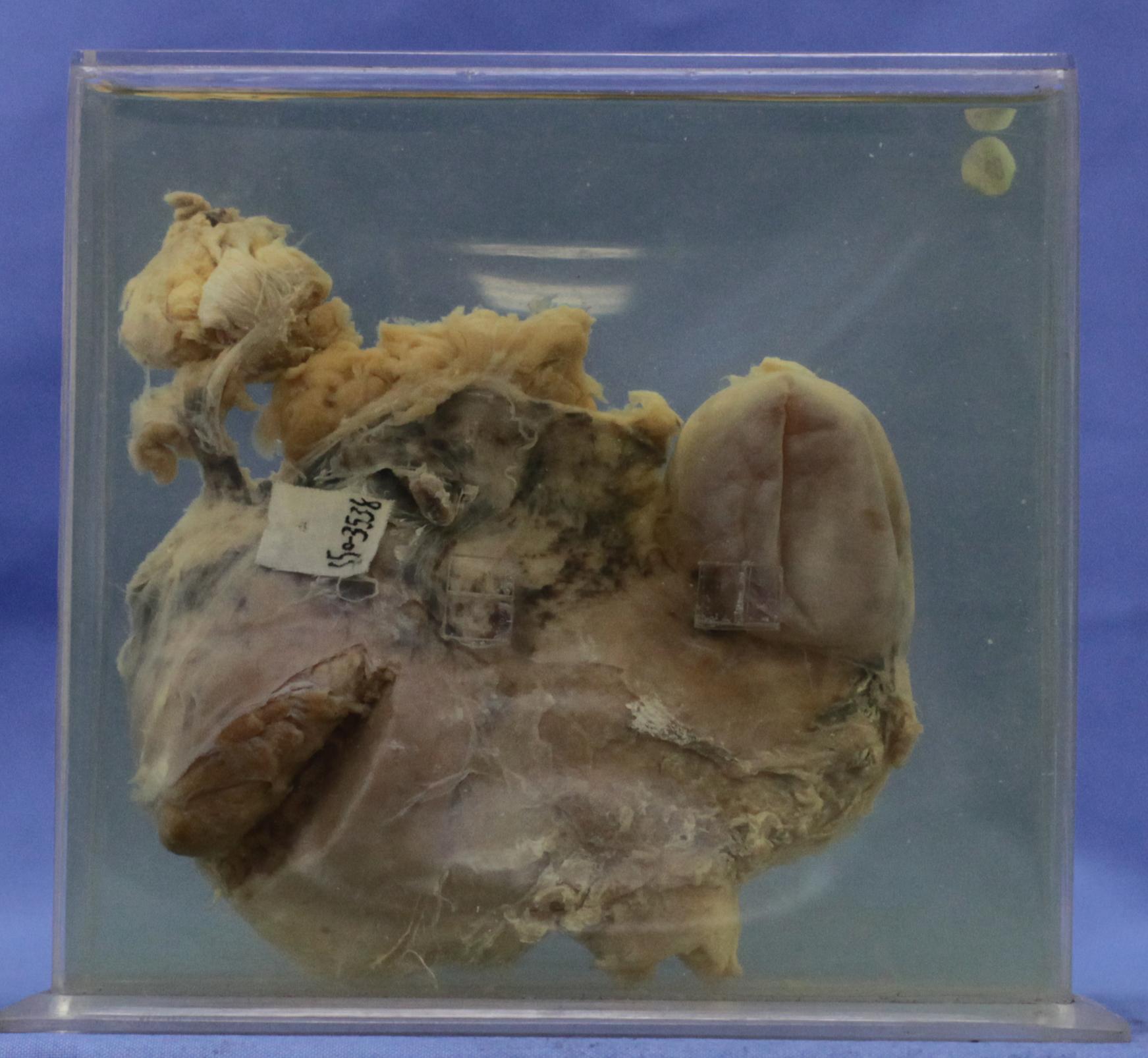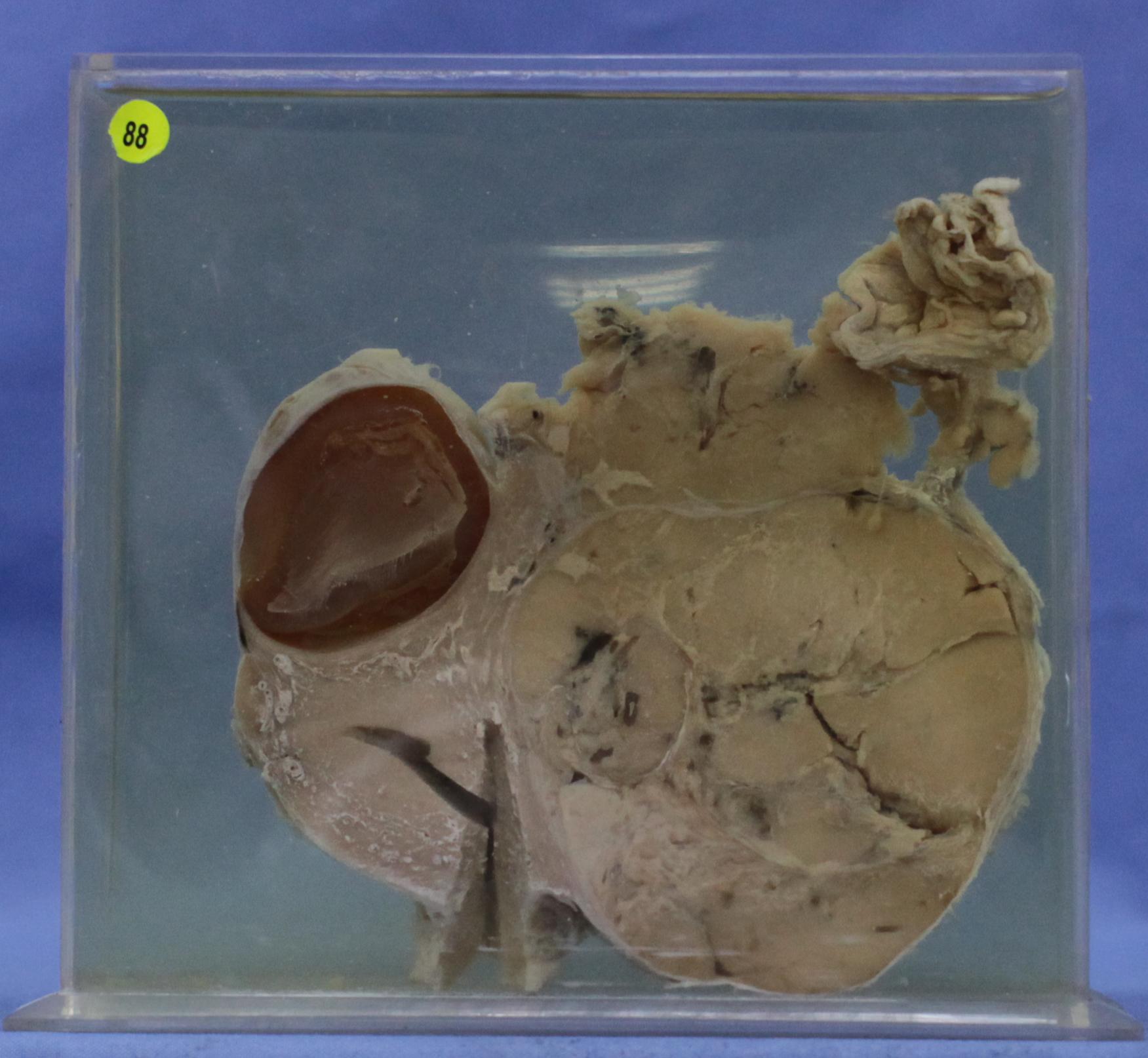 宫颈一侧见一巨大肿块,直径约7厘米,外生性生长而在盆腔内形成巨大包块;切面灰白,结节状。镜下为良性肿瘤,又称副神经节瘤。