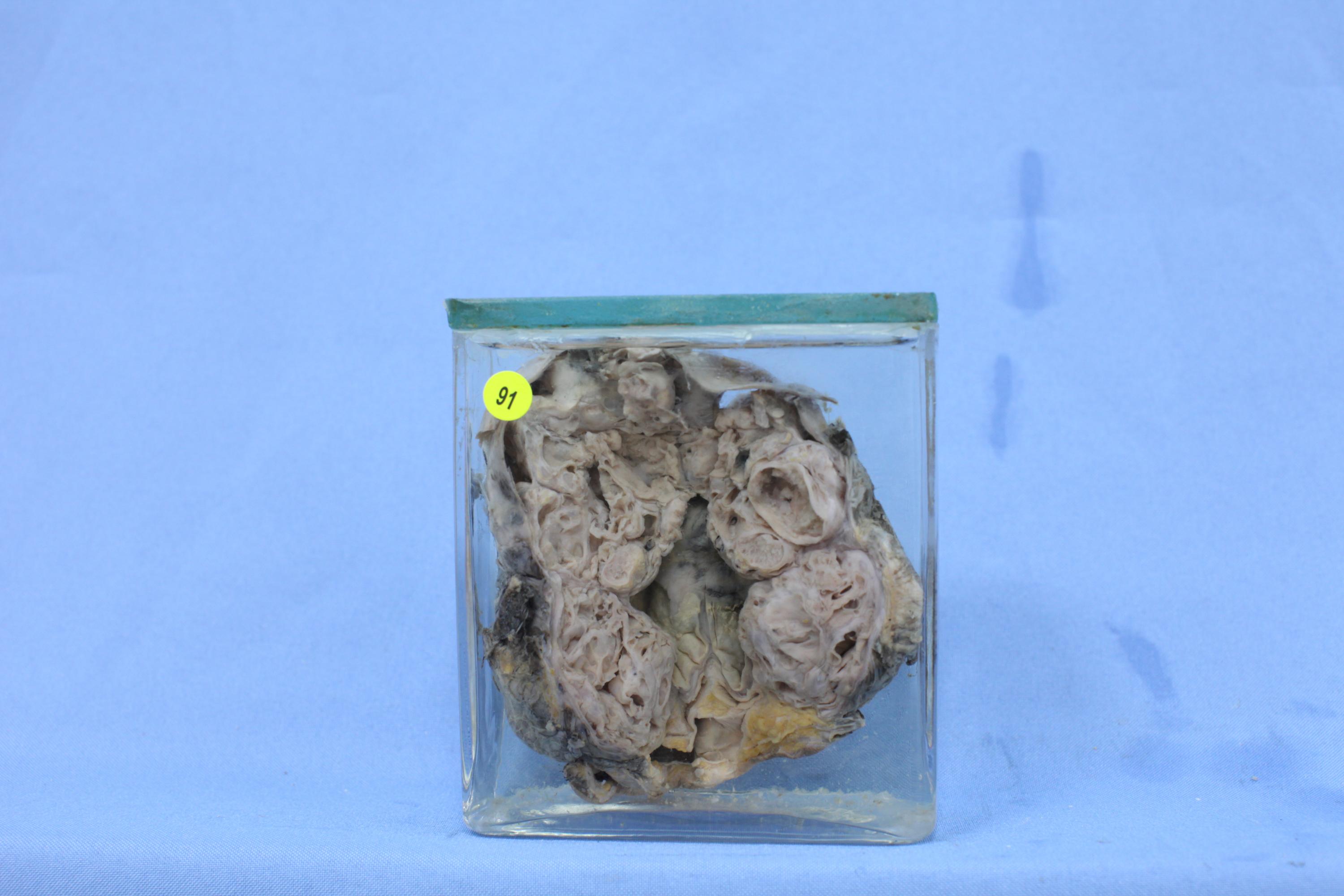 囊性肿块一个,大小约15×6×6厘米,切面由多个厚壁小囊腔构成;镜下为含有外、中、内三个胚层的多种分化成熟组织成分的良性肿瘤。