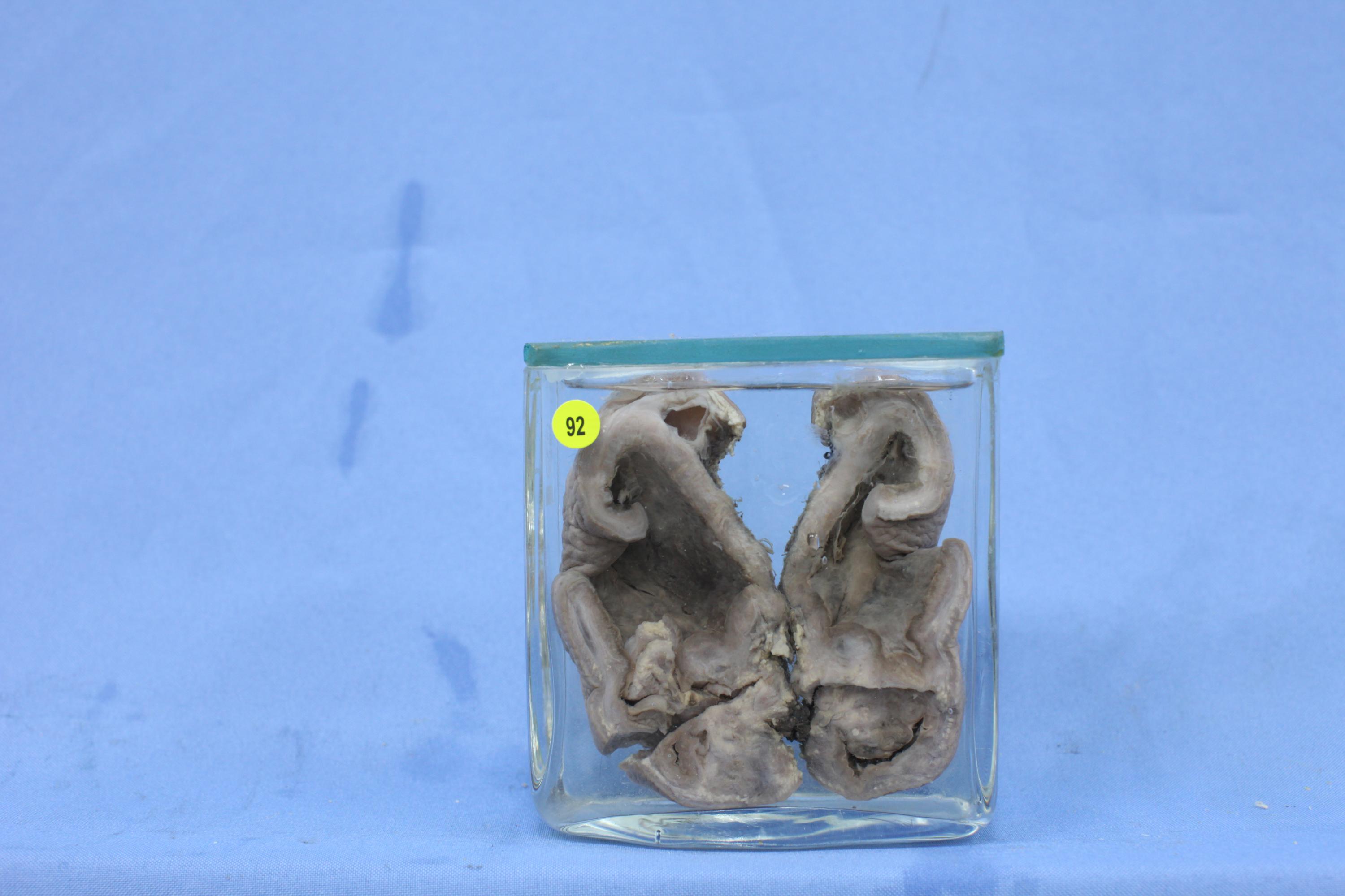 皮下见一灰白色囊性肿块,大小约14×6×6厘米,切面示囊壁厚,灰白色;镜下为含有外、中、内三个胚层的多种分化成熟组织成分的良性肿瘤。