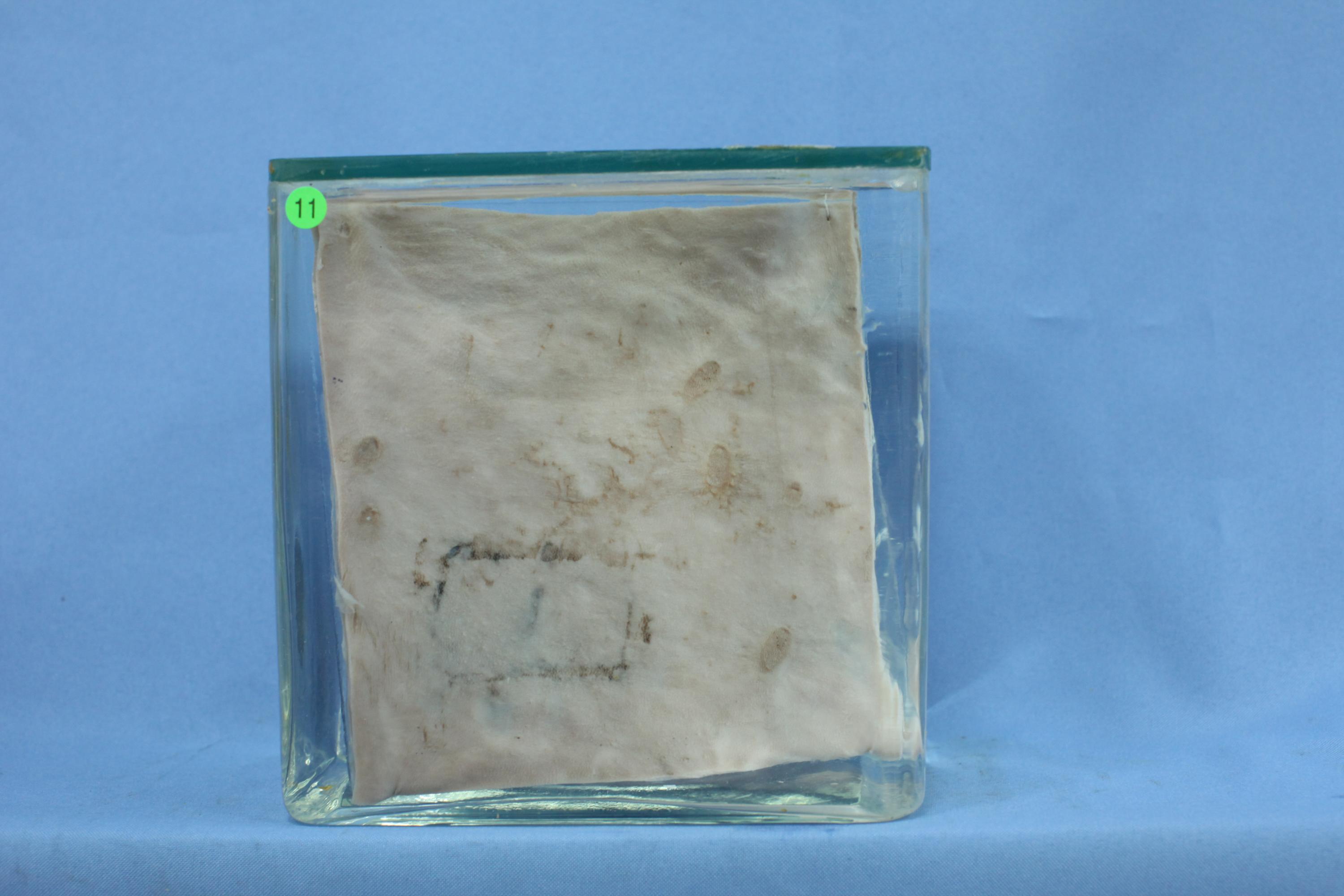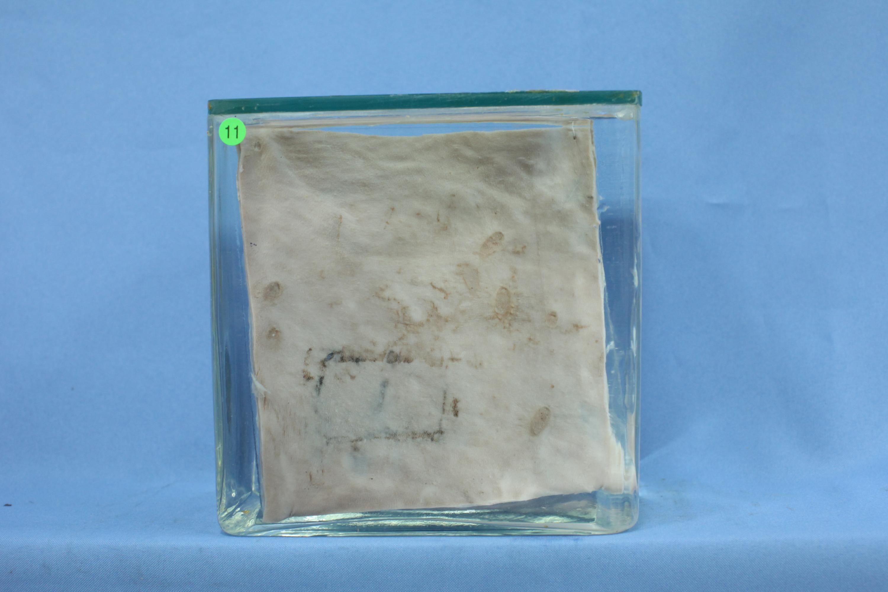 兔皮肤表面见多个圆形或椭圆形的损伤,部分区域有结痂附着。