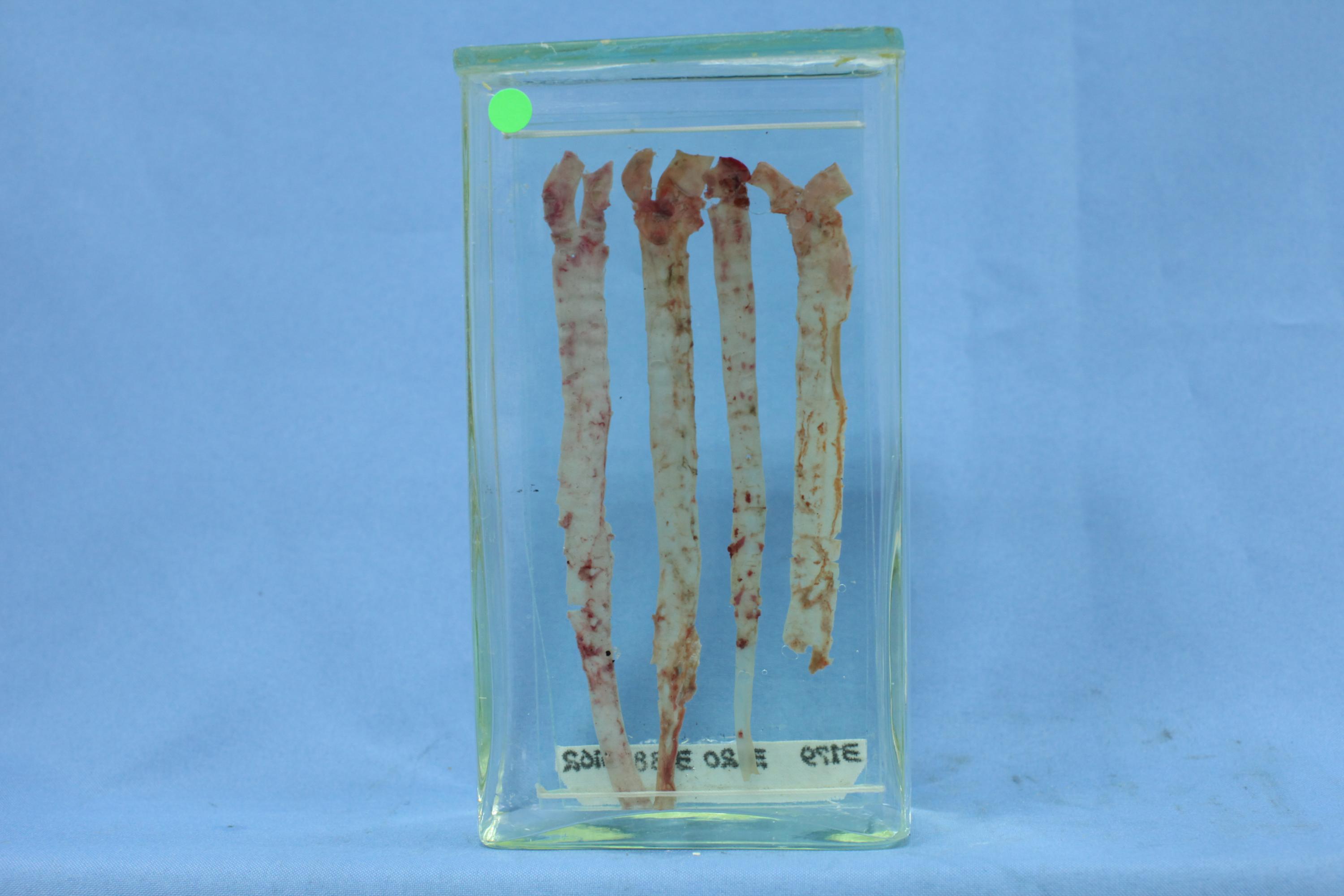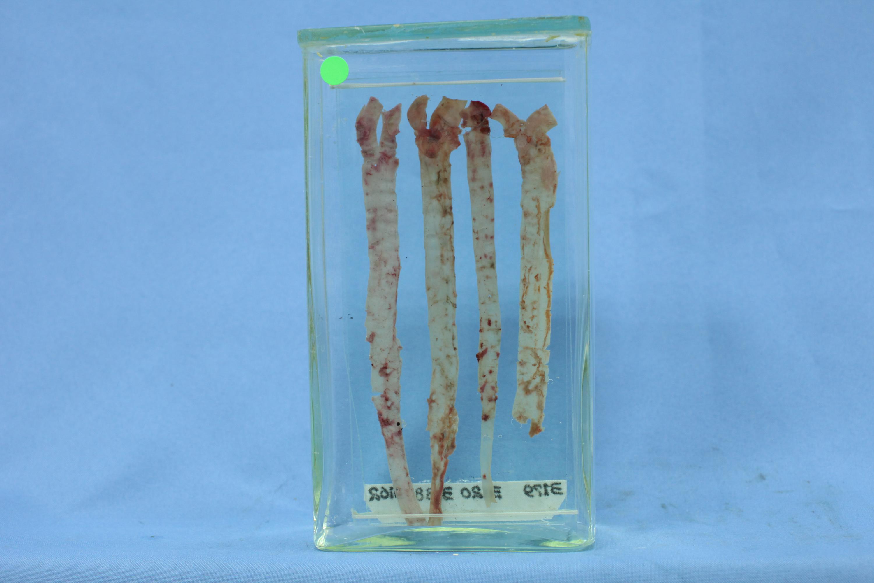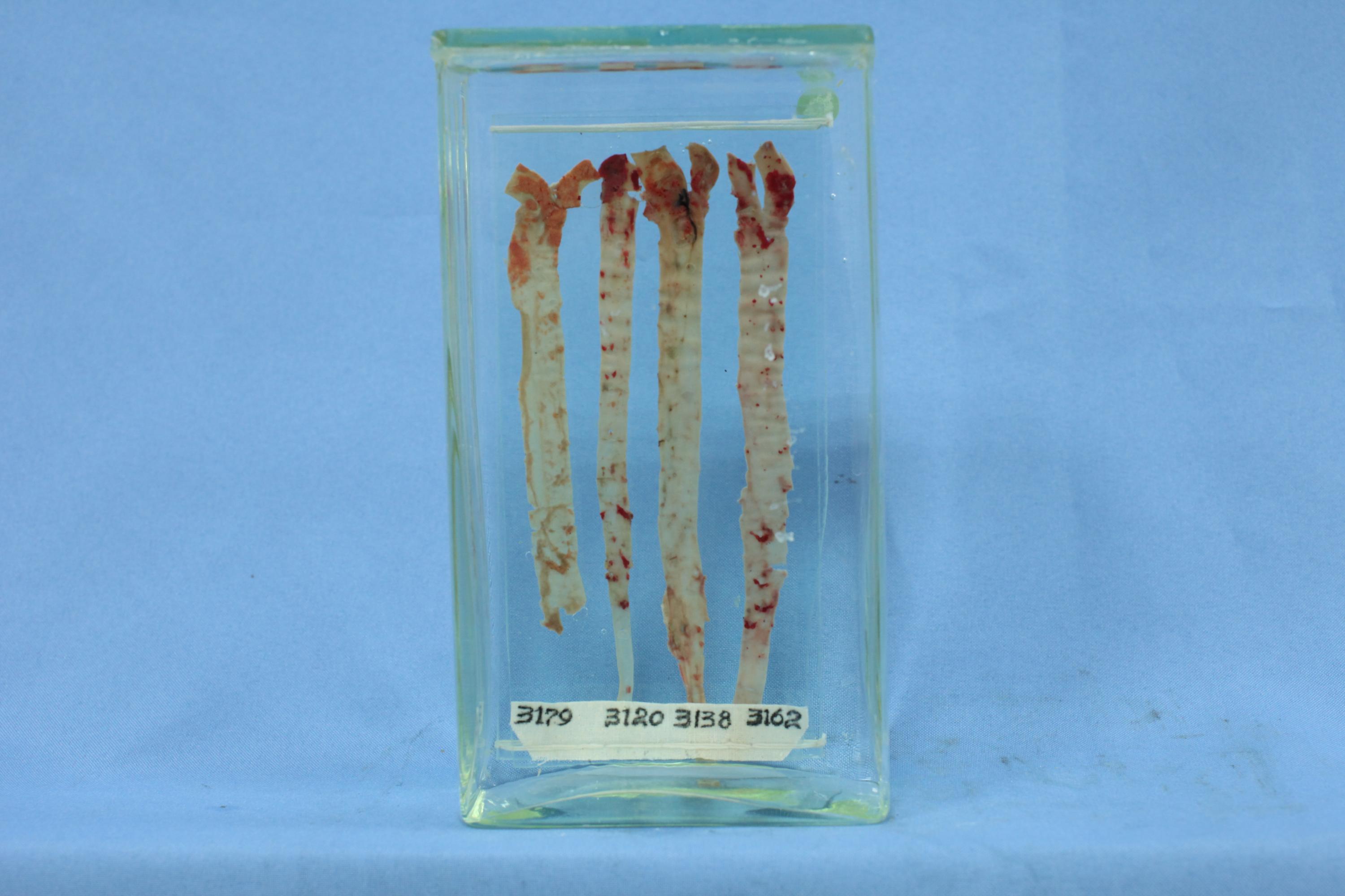 经高胆固醇饲料喂养,建立兔实验性动脉粥样硬化模型。胸、腹主动脉的内膜面有散在的浅黄色斑纹,微微高出表面,部分内膜面上有大小不等的黄白色蜡滴状的突起即粥样斑块或纤维斑块。病变以血管分叉处显著。脂质斑纹或粥样斑块油红染色为红色。