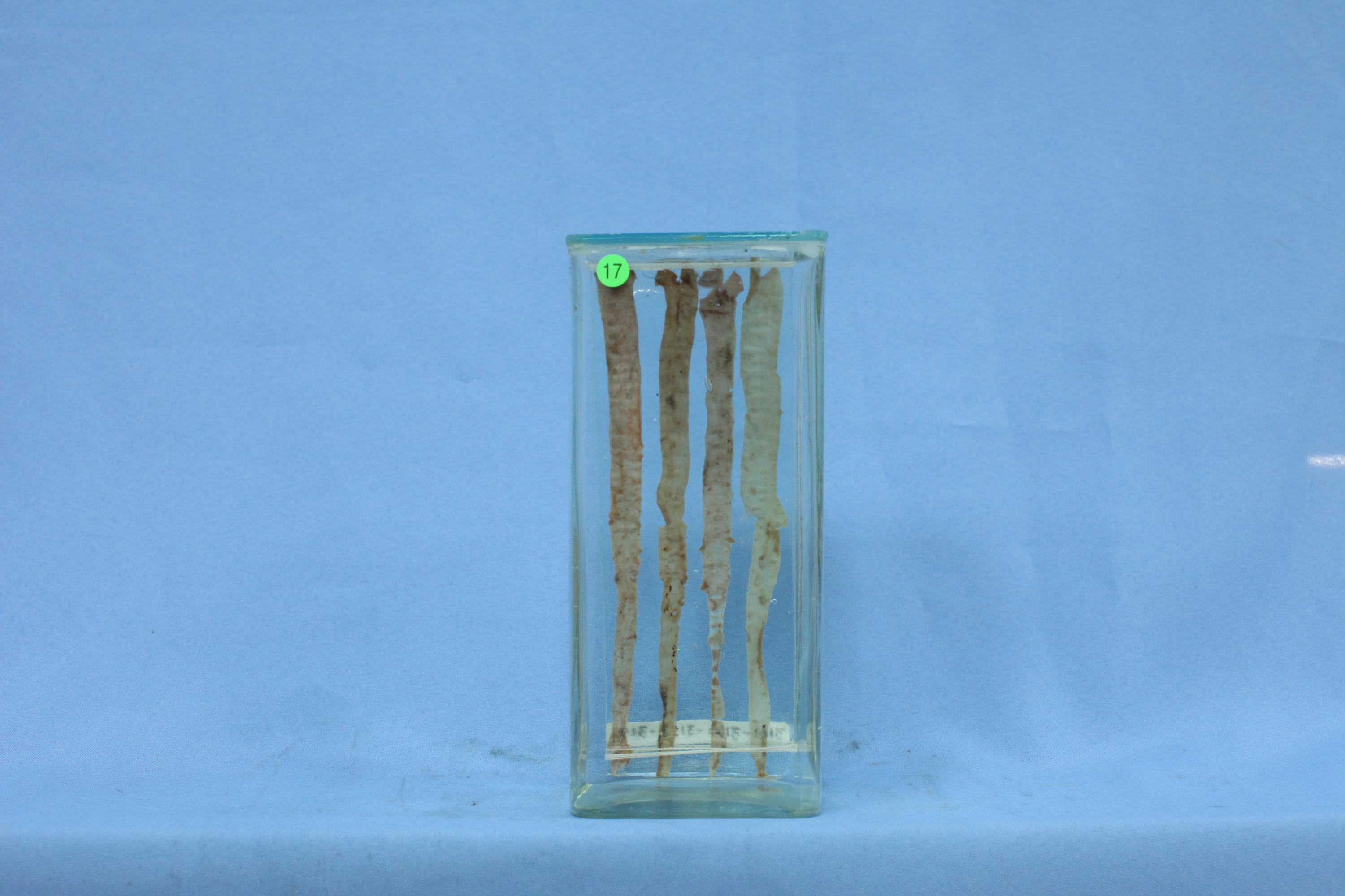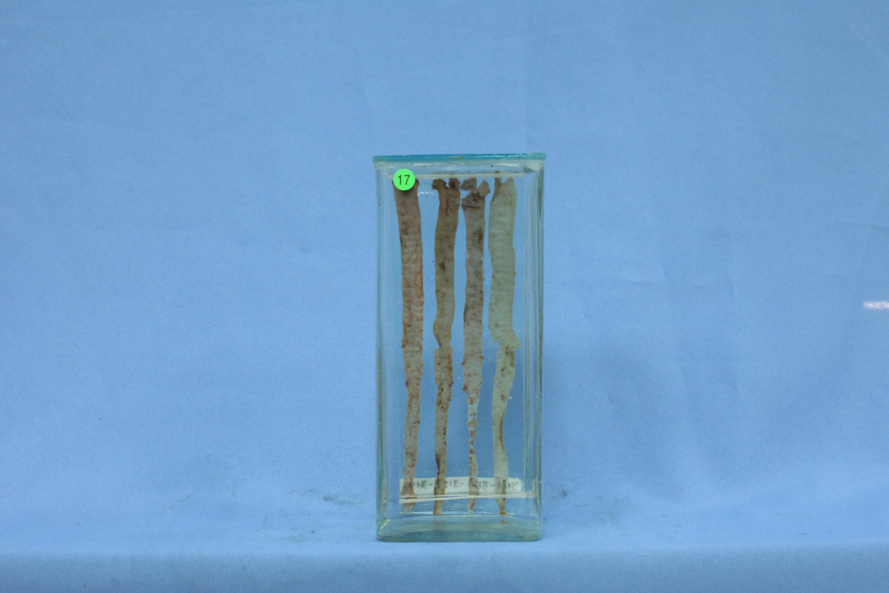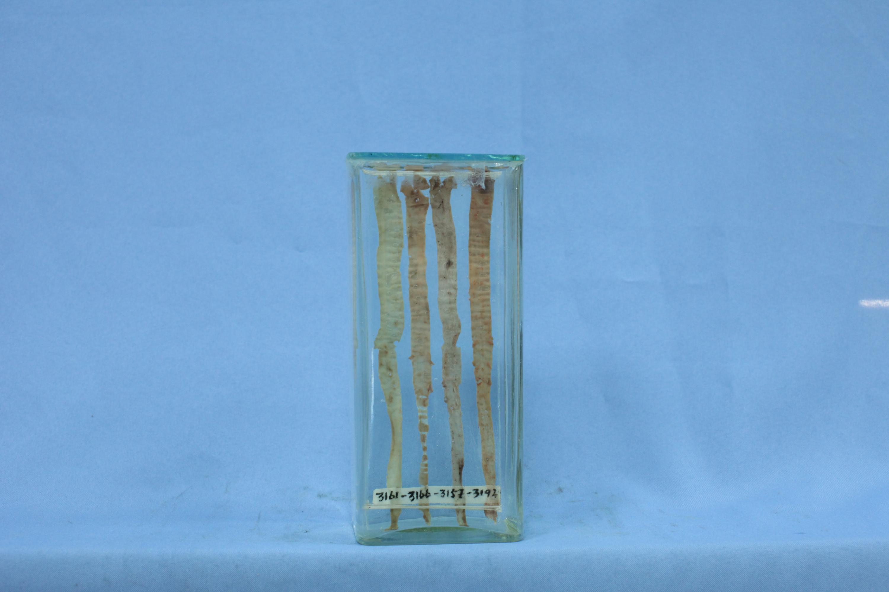 经高胆固醇饲料喂养,建立兔实验性动脉粥样硬化模型。胸、腹主动脉的内膜面有散在的浅黄色斑纹,微微高出表面,部分内膜面上有大小不等的黄白色蜡滴状的突起即粥样斑块或纤维斑块。病变以血管分叉处显著。
