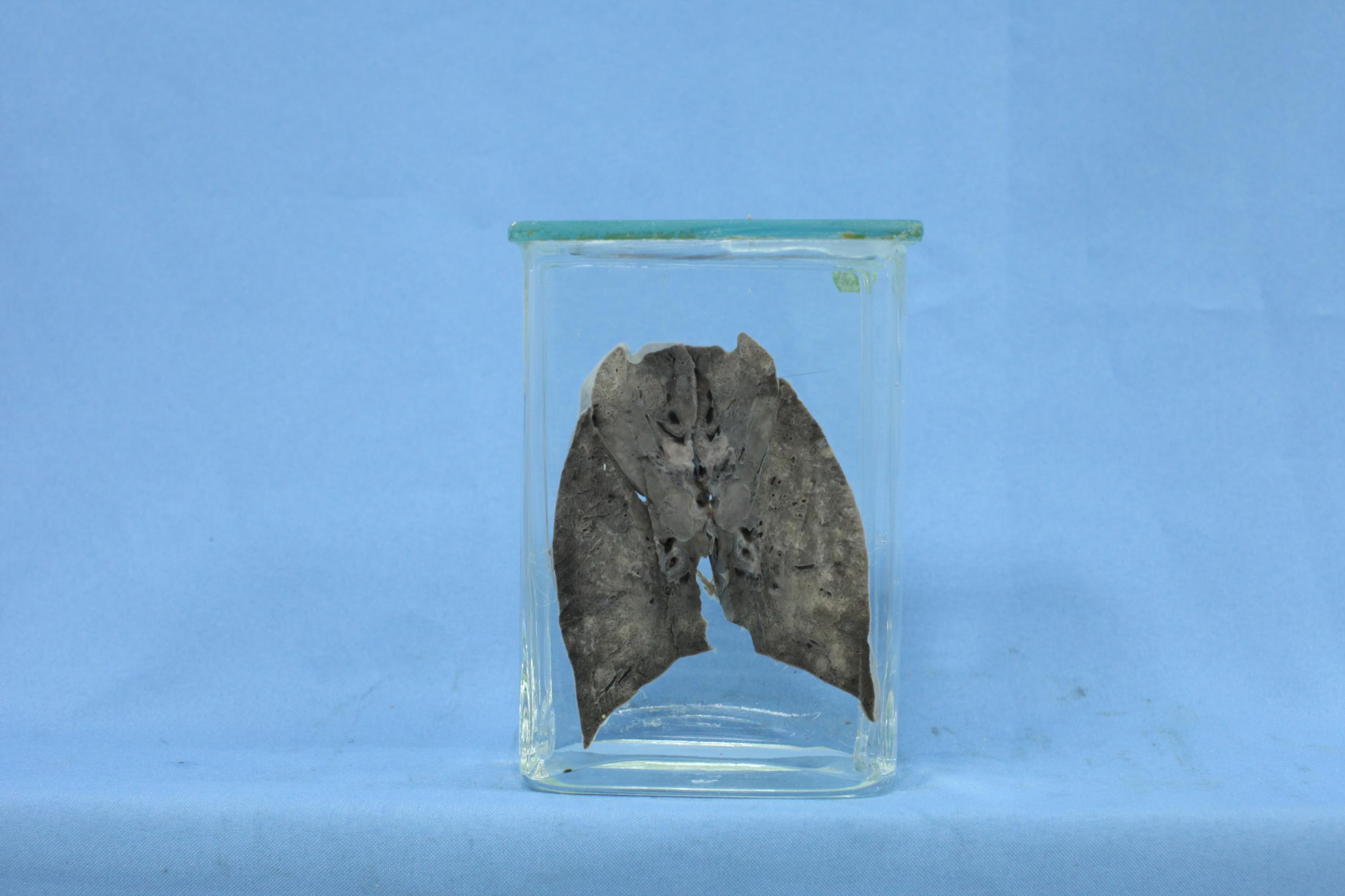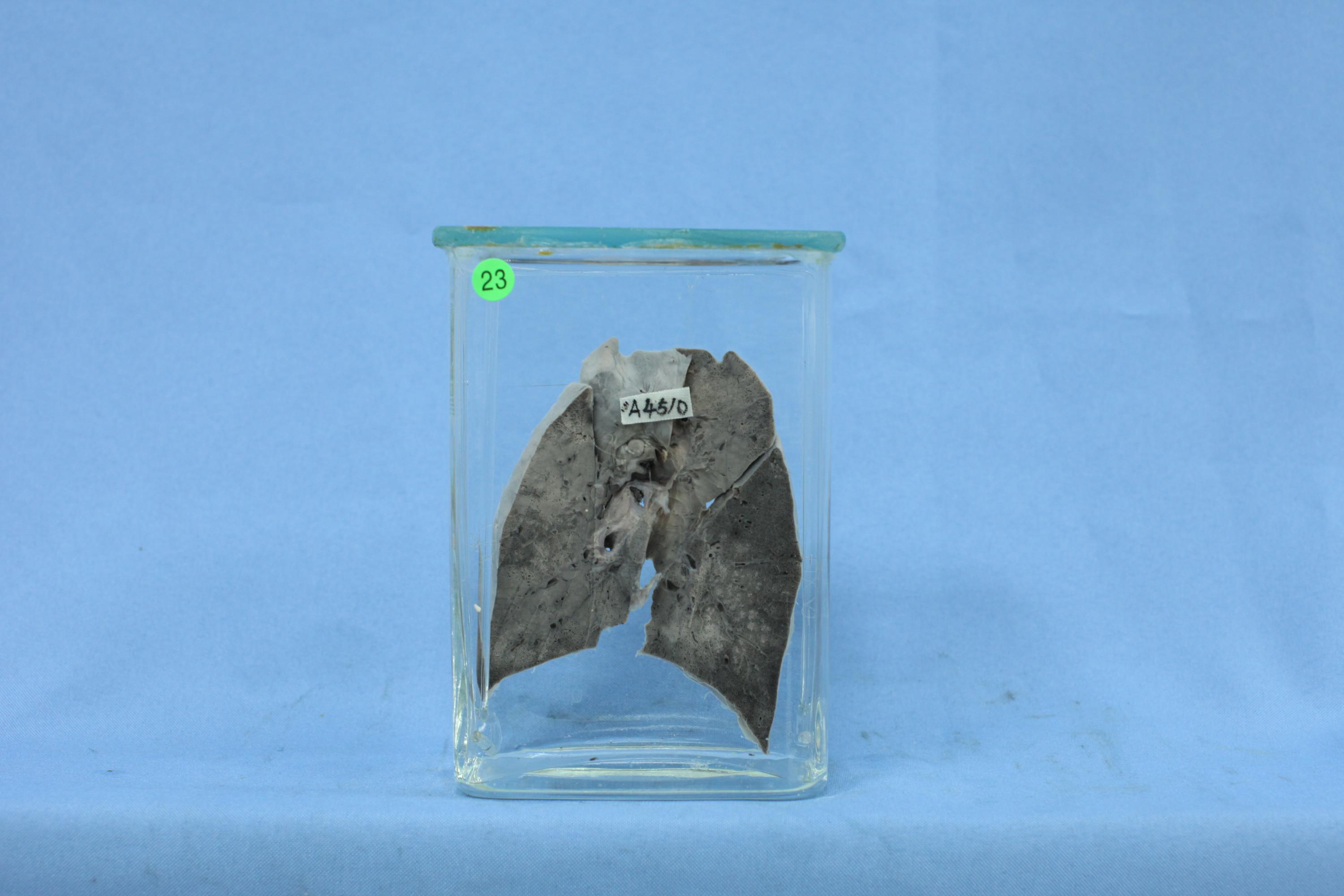 死者有“葵花籽被吸入气管”史。肺的切面上有簇状散在分布不规则的灰黄色实化灶,边界不清,似梅花斑状,个别区域的病灶似有融合之趋势,支气管粘膜显著充血。部分肺组织体积缩小,切面因肺泡萎陷而质致密。