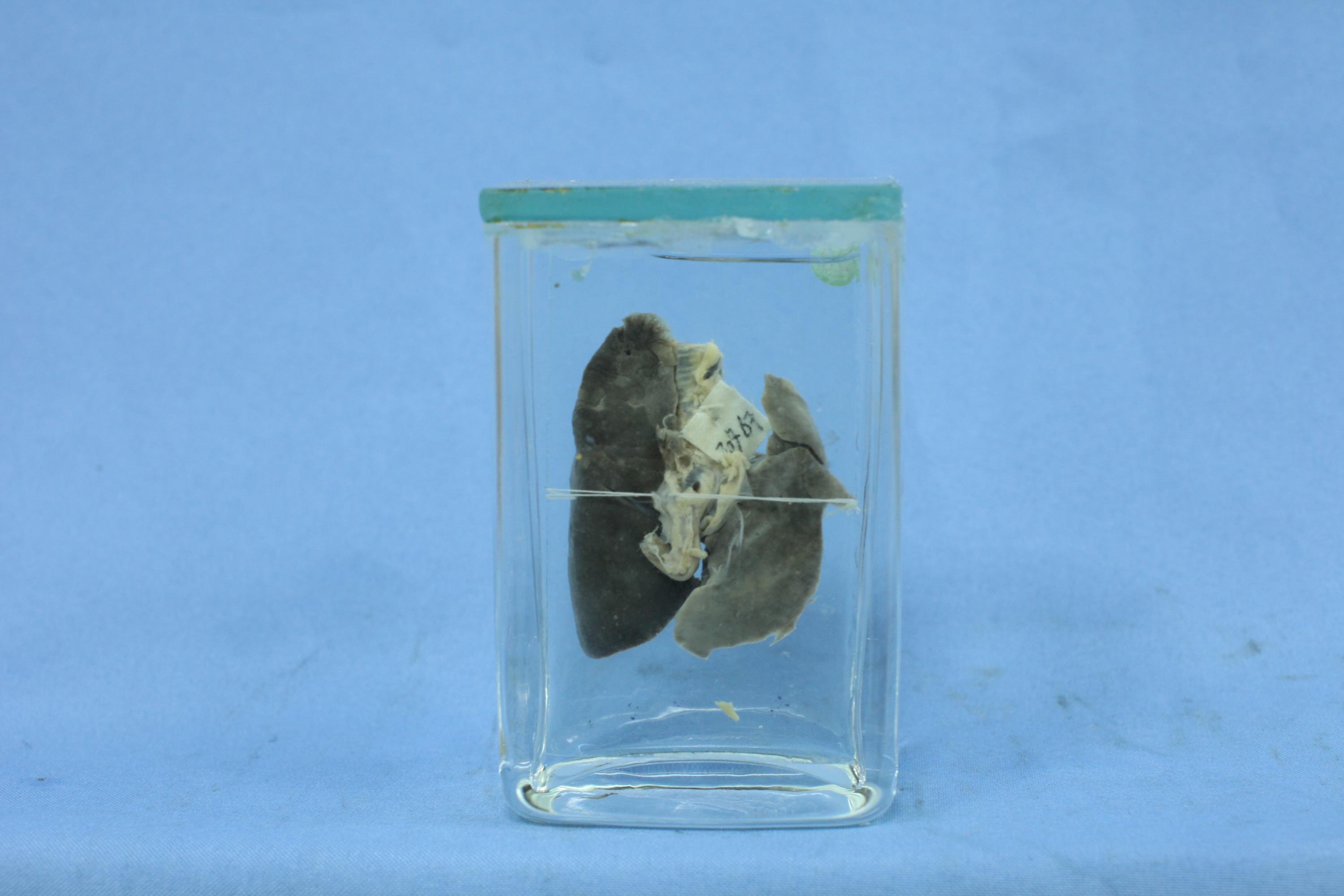 以二氧化硅悬液建立兔矽肺模型。肺表面及切面的大部分组织散在分布着多量针头大小的灰白色半透明小点(矽结节),余肺呈气肺状。肺门淋巴结肿大,切面见上述灰白色小点。