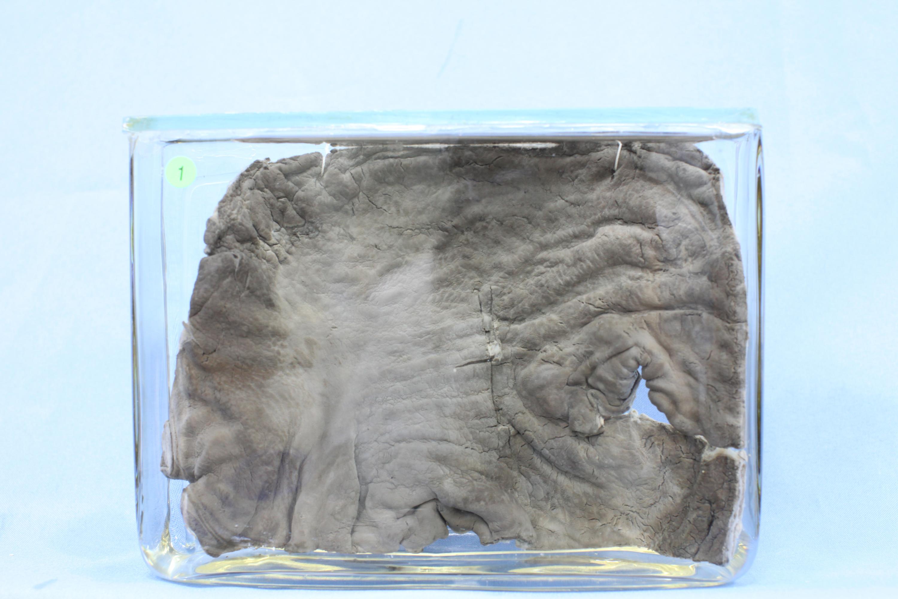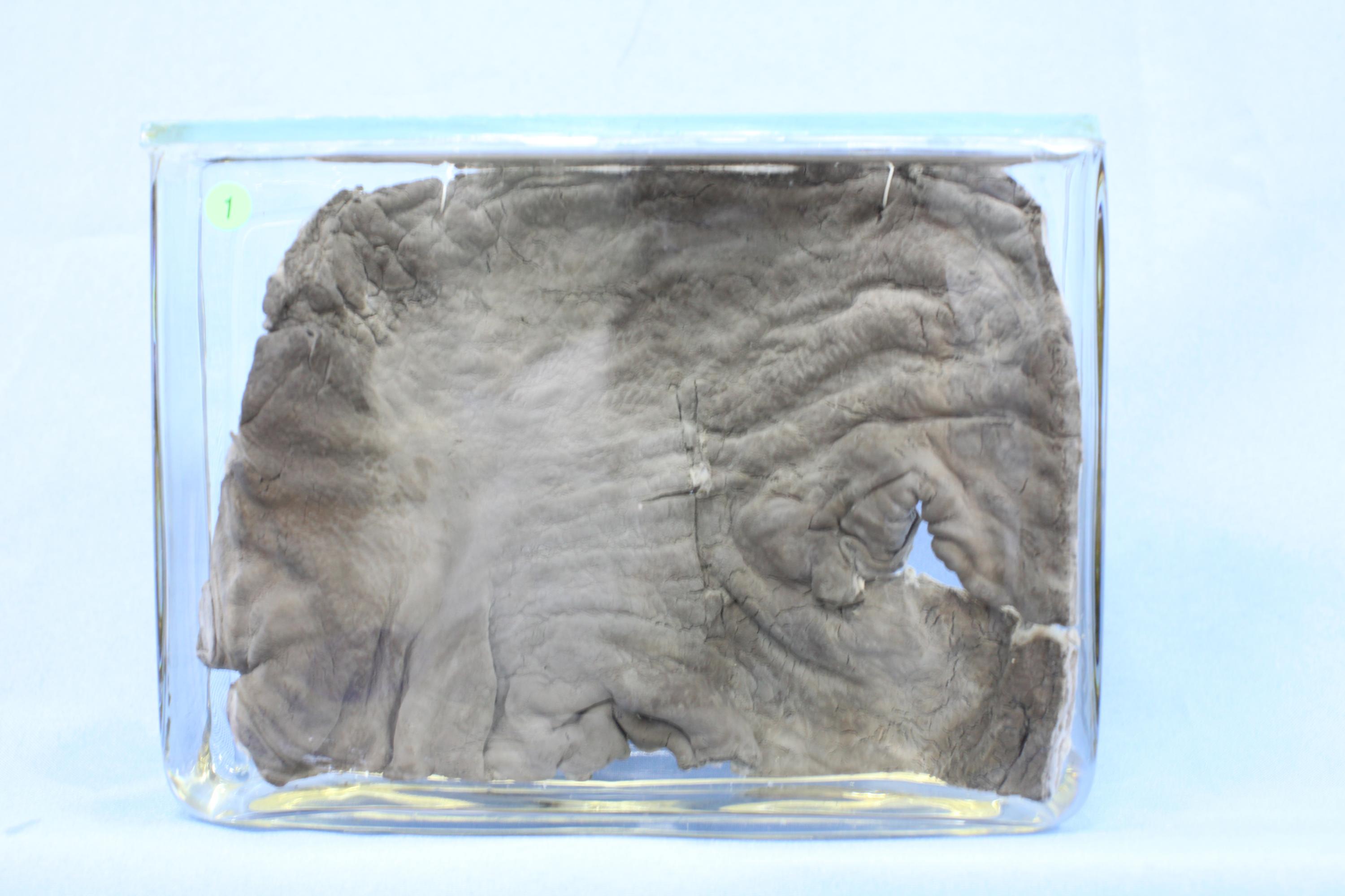 死者女性,27岁,吞服汞化物。胃粘膜灰暗色、坏死,粘膜表面失去正常色泽,完全代之以较硬的凝固性坏死物质,几乎占据胃粘膜的4/5,在坏死表面见散在小溃疡,直径0.2厘米,坏死区域的粘膜皱襞不明显,胃浆膜大致光滑,浆膜下呈暗灰黑色。