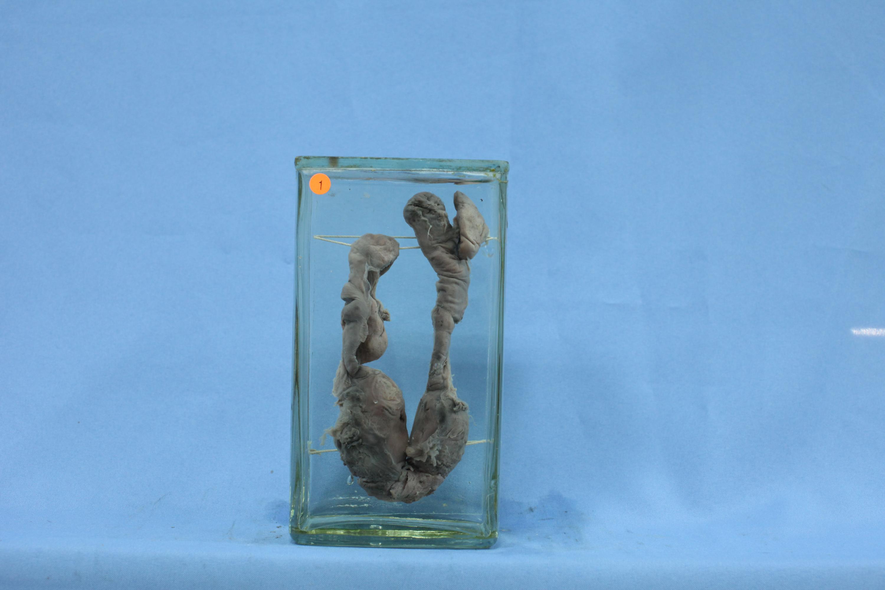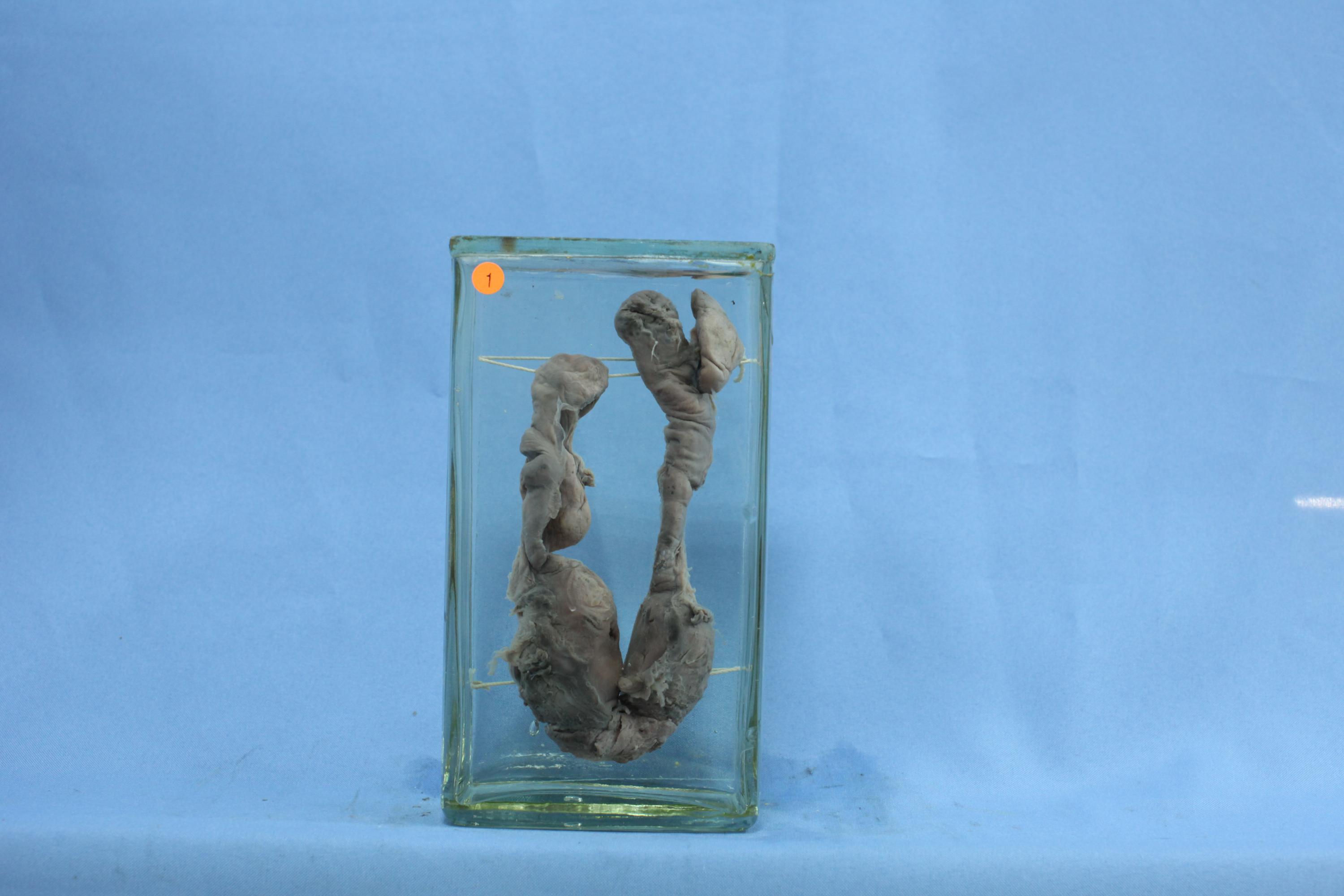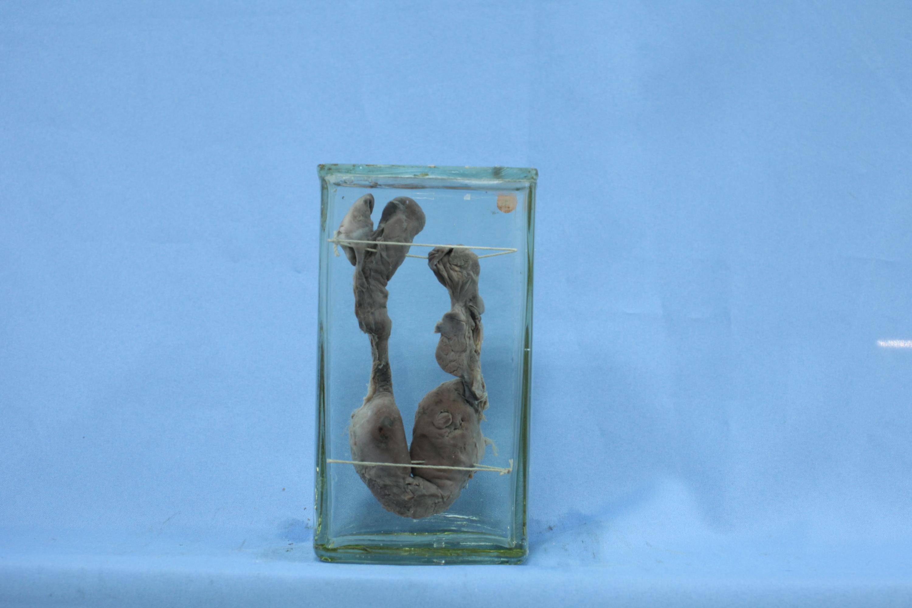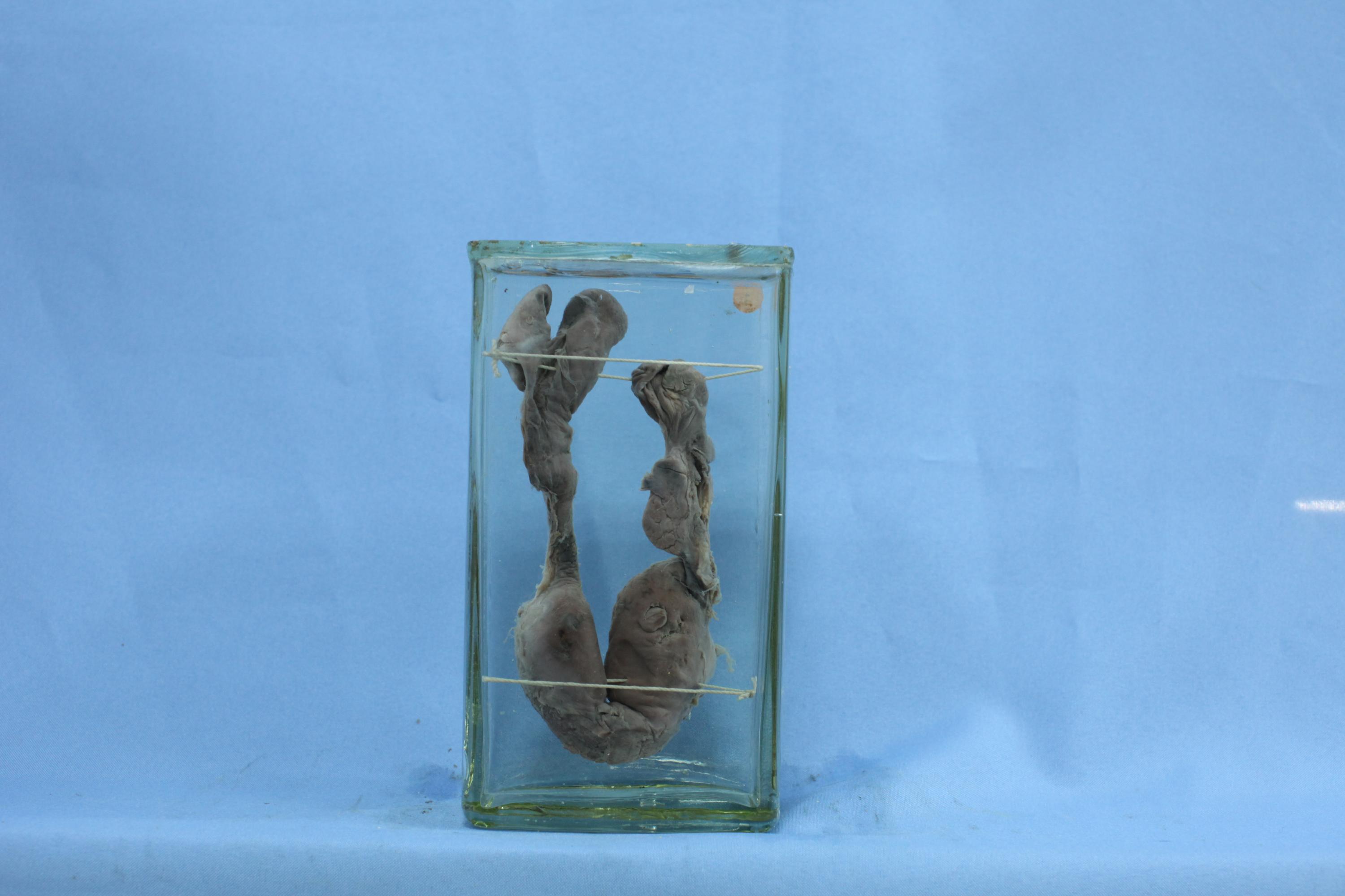 子宫2个,子宫体相分离,下端融合在一起,形成一个宫颈,伴一个阴道,2个子宫各有一个输卵管粘着,其下附有正常大小的卵巢两侧各一,两侧输卵管呈囊性扩张,内有积液。